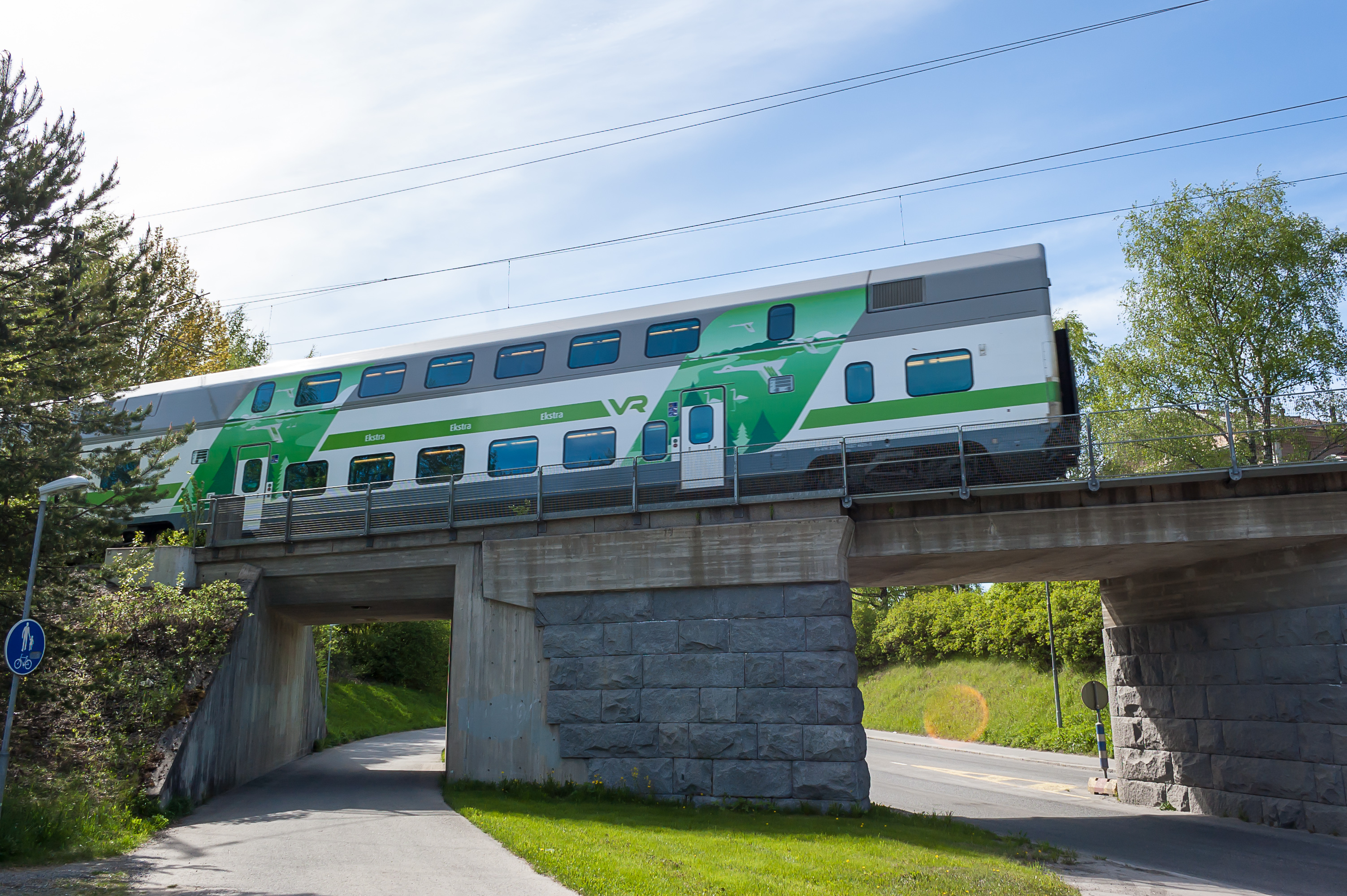 19. Железнодорожный путепровод над проспектом Ювантие. Проходит двухэтажный вагон поезда InterCity, стандартного финского поезда дальнего следования (места только сидячие).