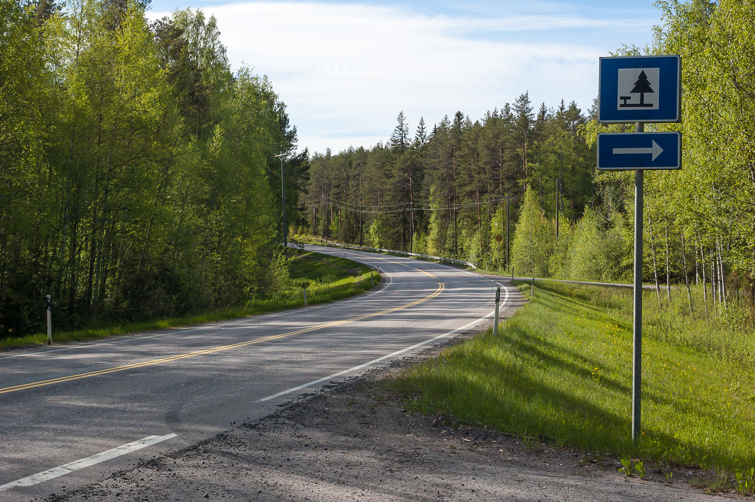 Народу на границе не очень много (слава кризису и крымнашу, ога). На финской стороне подъезд от границы к трассе 6 и Лаппеенранте — на удивление сравнительно унылого вида, да и подразбит, с ощутимой колеей, ну это как раз понятно. Далее въезжаем на трассу 6. Это одна из основных дорог Финляндии, идущая более или менее вдоль российской границы, по маршруту: трасса 7 (между Порвоо и Ловиисой) — Коувола — Лаппеенранта — Иматра — Йоэнсуу — Нурмес — Каяани. Участок протяженностью около 60 км в районе Лаппеенранты и Иматры в 2011 году перестроен в автомагистраль 2+2 полосы с ограничением скорости 100 км/ч, явно из-за большого объема транзита в Россию и большого кол-ва российских машин в приграничных районах. Наш путь целиком проходил по этой «автомагистральной» секции. Ну и далее сотня километров по трассе 13 — обычная двухполосная дорога, не очень сильно загруженная, весьма приятная для езды, и местами достаточно симпатичная. Несмотря на приятность дороги, в одном месте в кювете увидел разбитую в хлам (явно не сегодня и не вчера) машину. Блин, как в Финляндии вообще можно в аварию попасть? По сравнению с Россией финские дороги просто образец спокойствия.