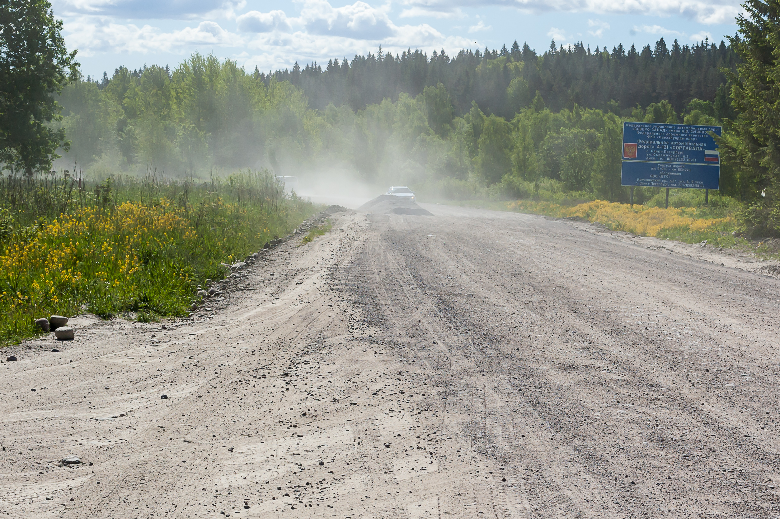 От поворота на Кузнечное до начала объезда поселка Хийтола (6 км) — неасфальтированный кусок! Это наиболее известное место «Сортавалы», периодически обсуждаемое в spb_auto, например. Все-таки даже у русского человека вызывает некоторый культурный шок то, что в полутора часах езды от Питера дорога, имеющая статус федеральной трассы, неасфальтирована.