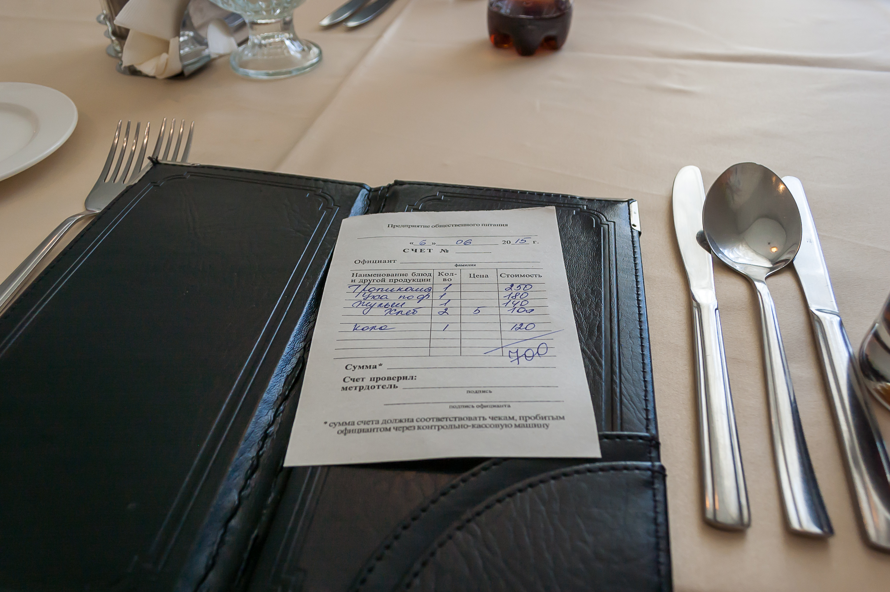 23. Засим мы покушали-таки в том ресторане «Бульвар». В центре кафе все были забиты, а этот «Бульвар», оказывается, готовился к банкету для почетных граждан или что-то в этом роде. Но нас усадили в уголке и пообещали таки накормить, хотя мы даже не настаивали особо! Неожиданно приятное отношение. И накормили вкусно. Цены по местным меркам, наверное, высокие, а по Питерским — очень умеренные. Счет выписывают от руки на бланках, еще, похоже, при совке напечатанных :) Рекомендую в общем.