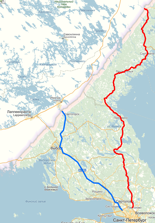 Красным обозначен маршрут на Вяртсиля от Питера, от КАДа — через федеральную трассу А-121 «Сортавала» и кусок трассы А-130 (старое обозначение). Для сравнения, синим — обычный маршрут на Светогорск/Иматру, через ЗСД, «Скандинавию», Светогорское шоссе и Комсомольское. Даже в таком масштабе заметно, насколько маршрут через Вяртсиля более извилист.