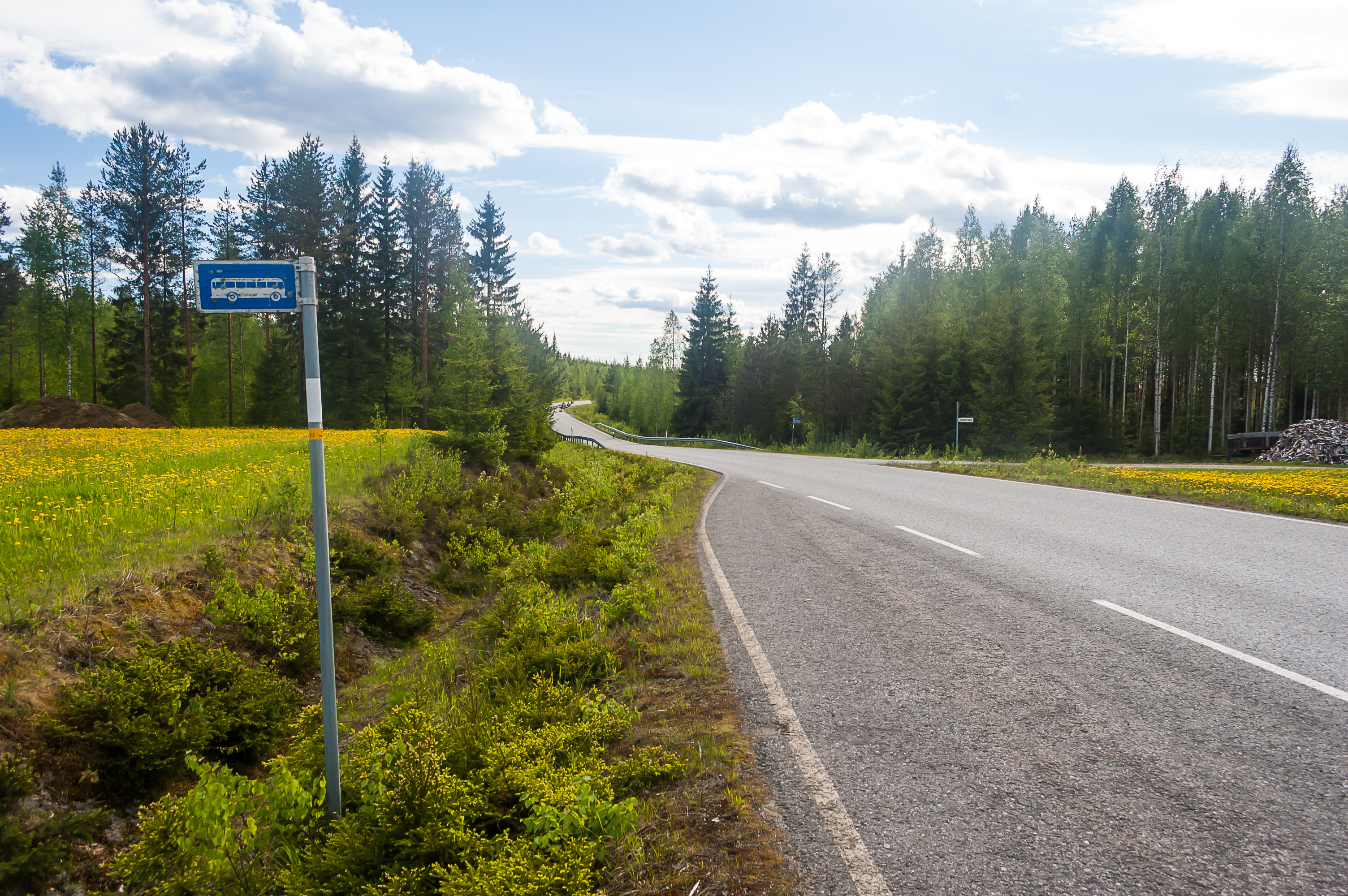 8. Судя по наблюдениям за местными машинами, на автобусных остановках за городом вполне социально-приемлемо остановиться глянуть на карту/сходить в туалет в лесу/сфотографировать что-либо. Чуть менее чем все автобусные остановки в финской глубинке выглядят как небольшое уширение проезжей части, где торчит синяя табличка с изображением автобуса, и на этом все. Лавочек, расписаний автобусов, названия остановки как правило нет и в помине, по крайней мере вдали от городов. Собственно, людей на этих остановках тоже почти никогда не увидишь, как и остановившийся автобус (да и на дороге автобус встретить редкость); я за свои — пока что не столь многочисленные, но все же — поездки в Финляндию раза два всего видел где-либо. Как я понимаю, автобусы ходят максимум несколько раз в сутки строго по расписанию. Где найти это расписание и вообще маршрутную сеть — понятия не имею, в интернете не нашел. Наверное, на автовокзале ближайшего города.