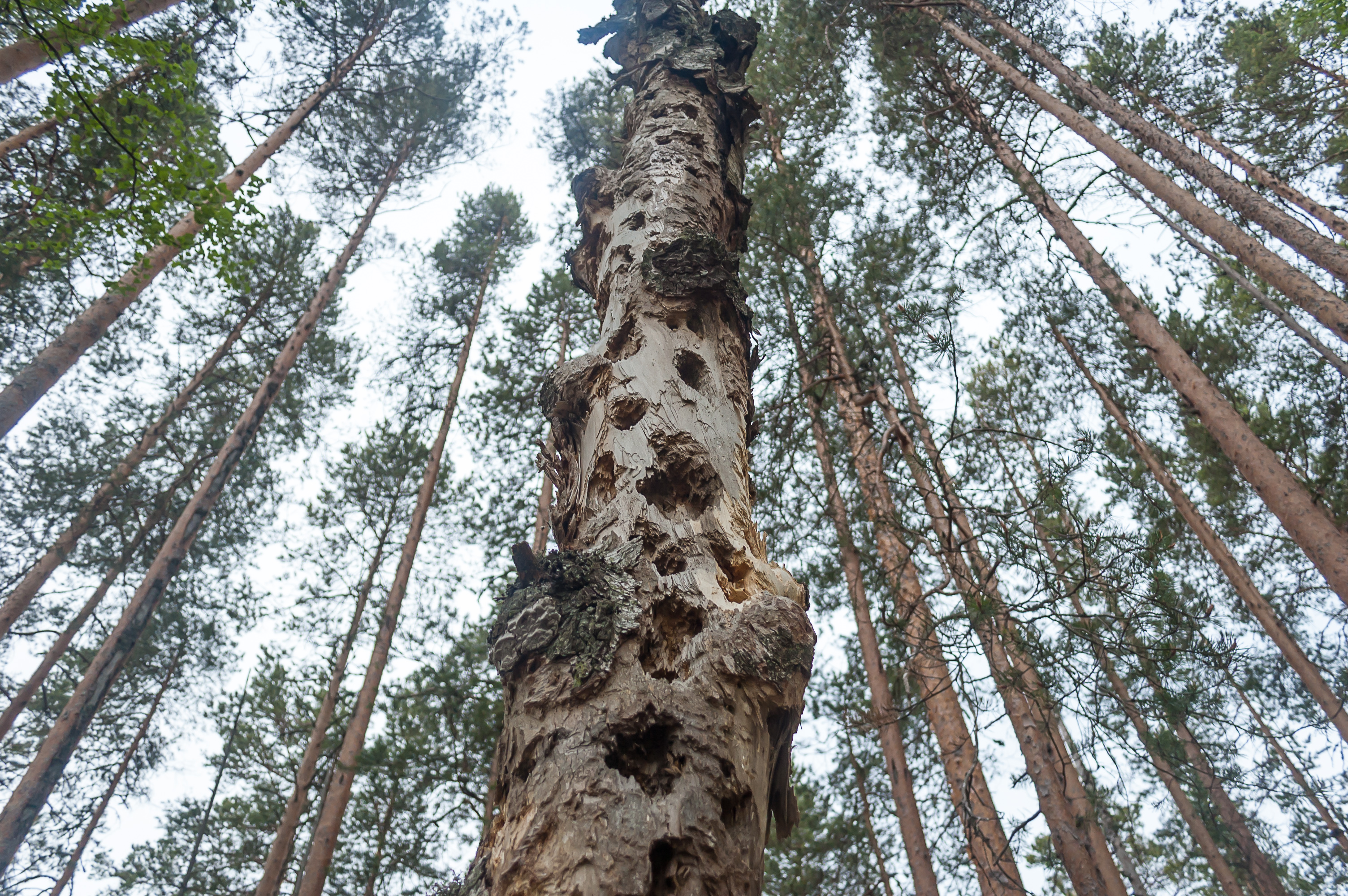 30. Жутковато выглядящее дерево. Вообще сосен с ободранной снизу корой (большими кусками и на довольно большую высоту — интересно, кто так обдирает — не зайцы уж точно) здесь много, а как такое полностью ободранное и с дырками дерево вышло — совсем без понятия.