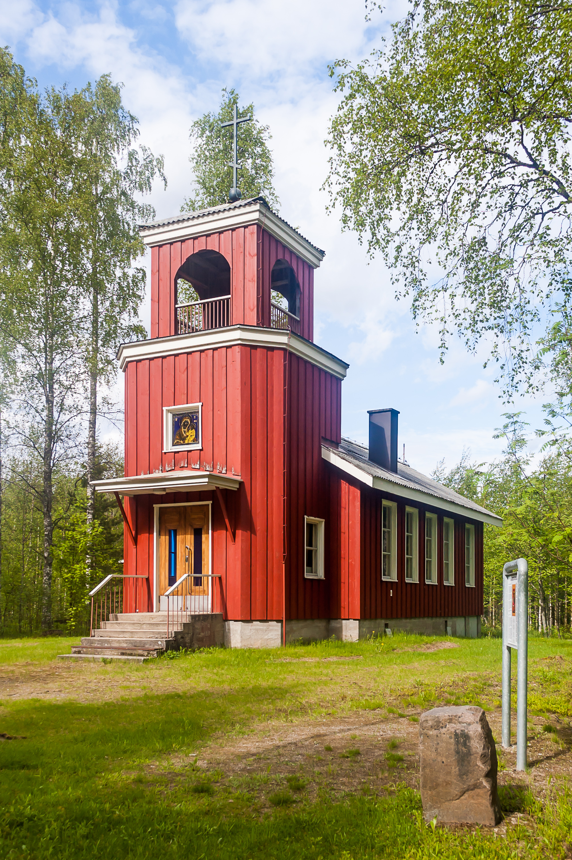 10. Городок Иломантси и его окрестности выделяются необычно высокой для Финляндии долей православного населения (17% в Иломантси; по стране в среднем несколько более 1%). Не уверен, в чем причины этого. Вдоль дороги 500, в частности, можно увидеть несколько православных часовен, например, эту часовню Пресвятой Богородицы в деревне Муталахти. К сожалению, часовня была заперта.