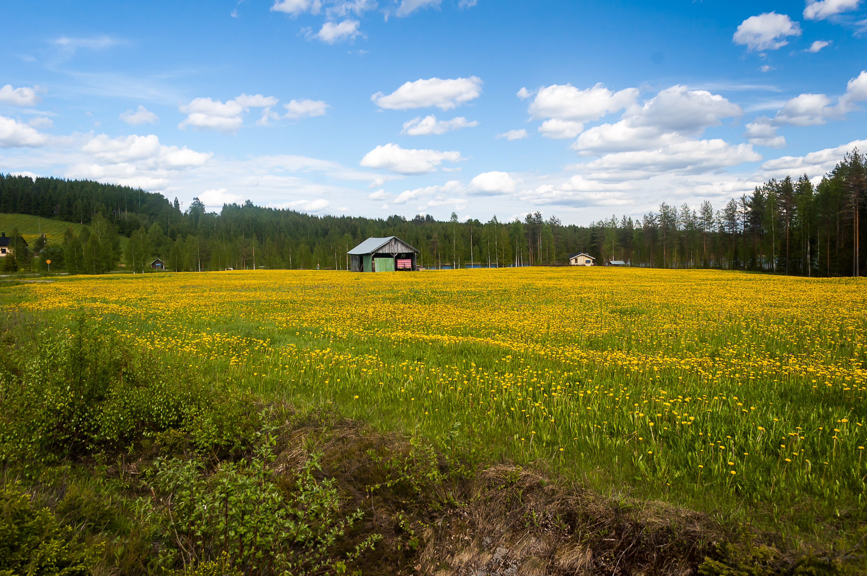 6. Одуванчиковое поле, у чего-то, похожего на ферму близ озера Саарилампи. К моменту поездки (начало июня) в Питере одуванчики уже все отцвели, а здесь, в 300 км севернее, еще нет.