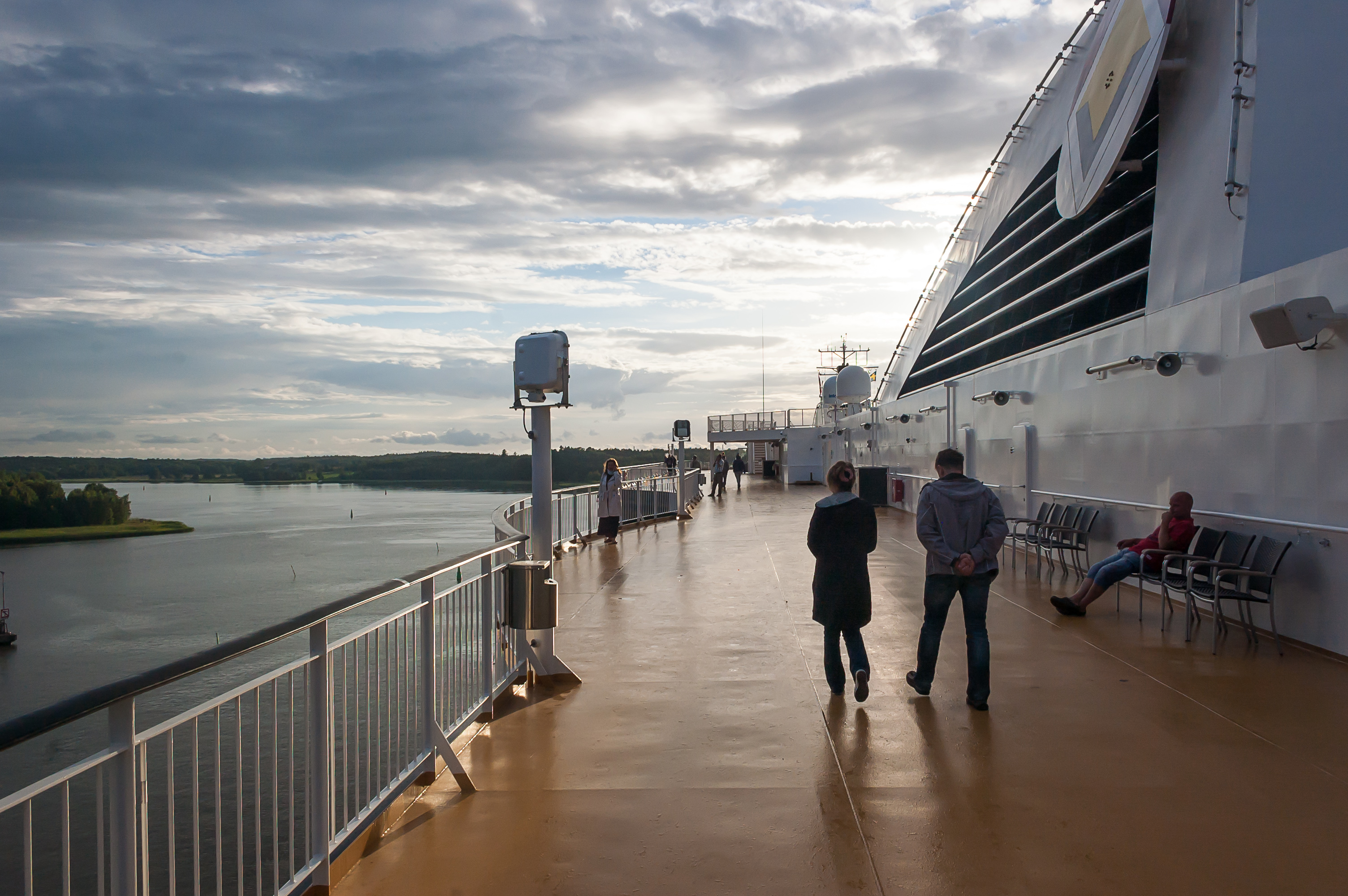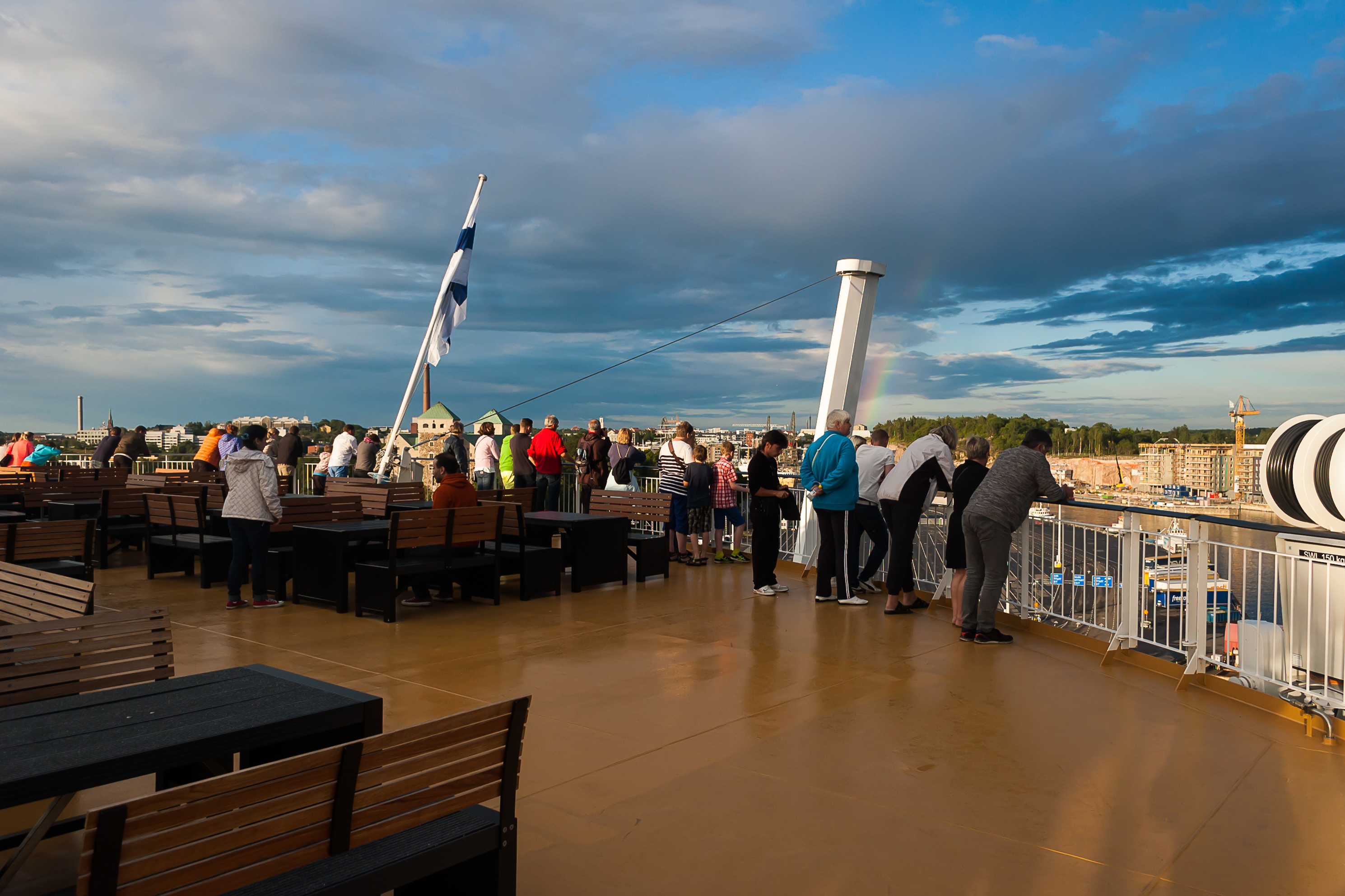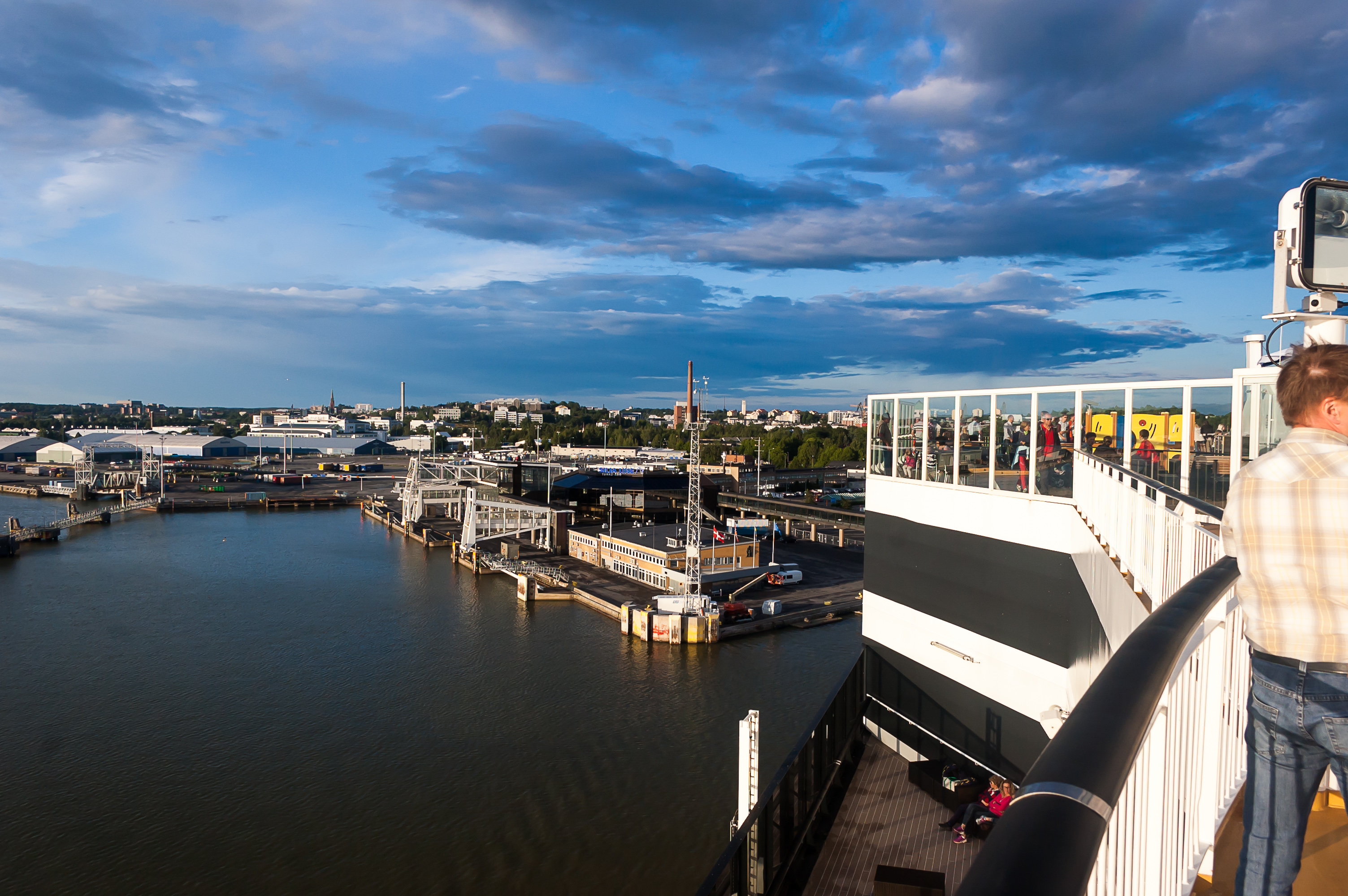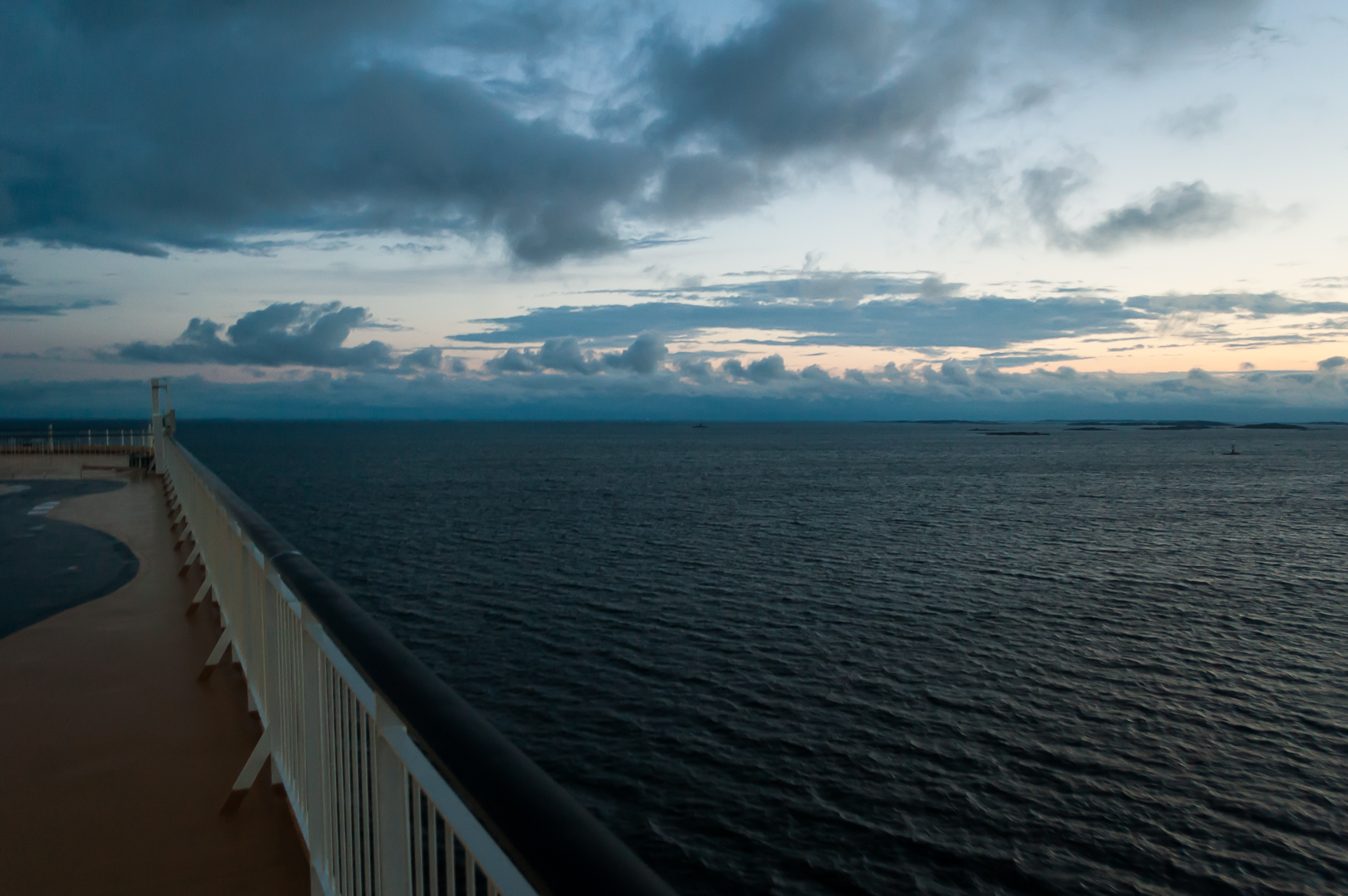 8. Паром отправляется в 20:55 и прибывает в 7:30 (шведское время 6:30, они уже в другом часовом поясе). Не так уж и много. Так что план таков: посмотреть с верхней палубы отправление, ужин со шведским столом, поспать, завтрак и прибытие. И, оставив вещи в каюте, мы поднимаемся на верхнюю («солнечную») палубу. Здесь можно погулять на свежем воздухе и насладиться видами во все стороны.