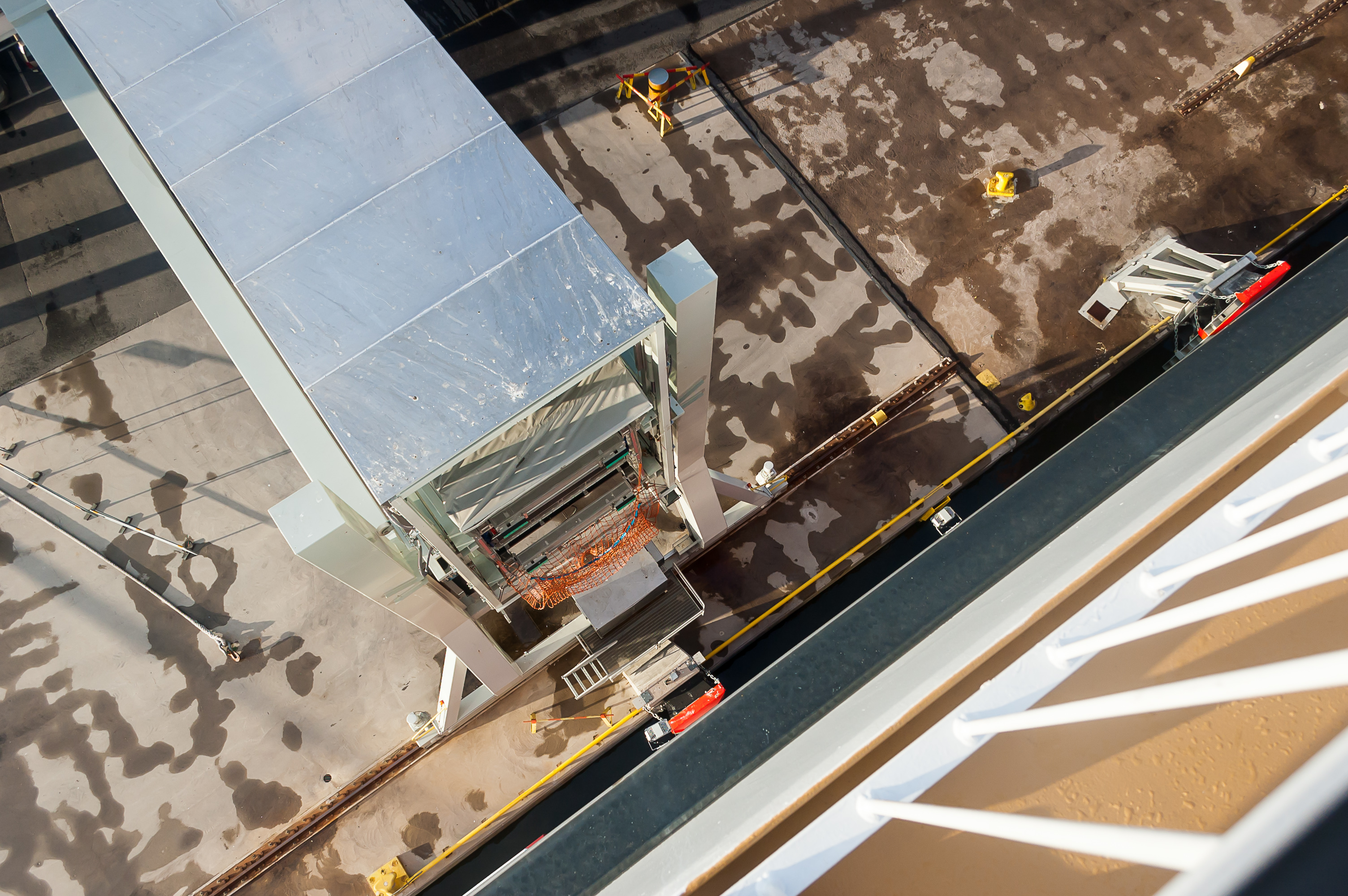 Как видно, большие аппарели на корме используются для погрузки фур и других крупных машин. (Насколько я знаю, на этом маршруте действуют также грузовые суда Ро-Ро, предназначенные специально для фур, но и на круизные паромы фуры тоже берут.) Справа — здание терминала с телетрапами для посадки пассажиров без машины, по смыслу похоже на аэропорт. Ну а посередине — маленькая дырка в правом борту, к которой идет длинная рампа — это для легковушек.