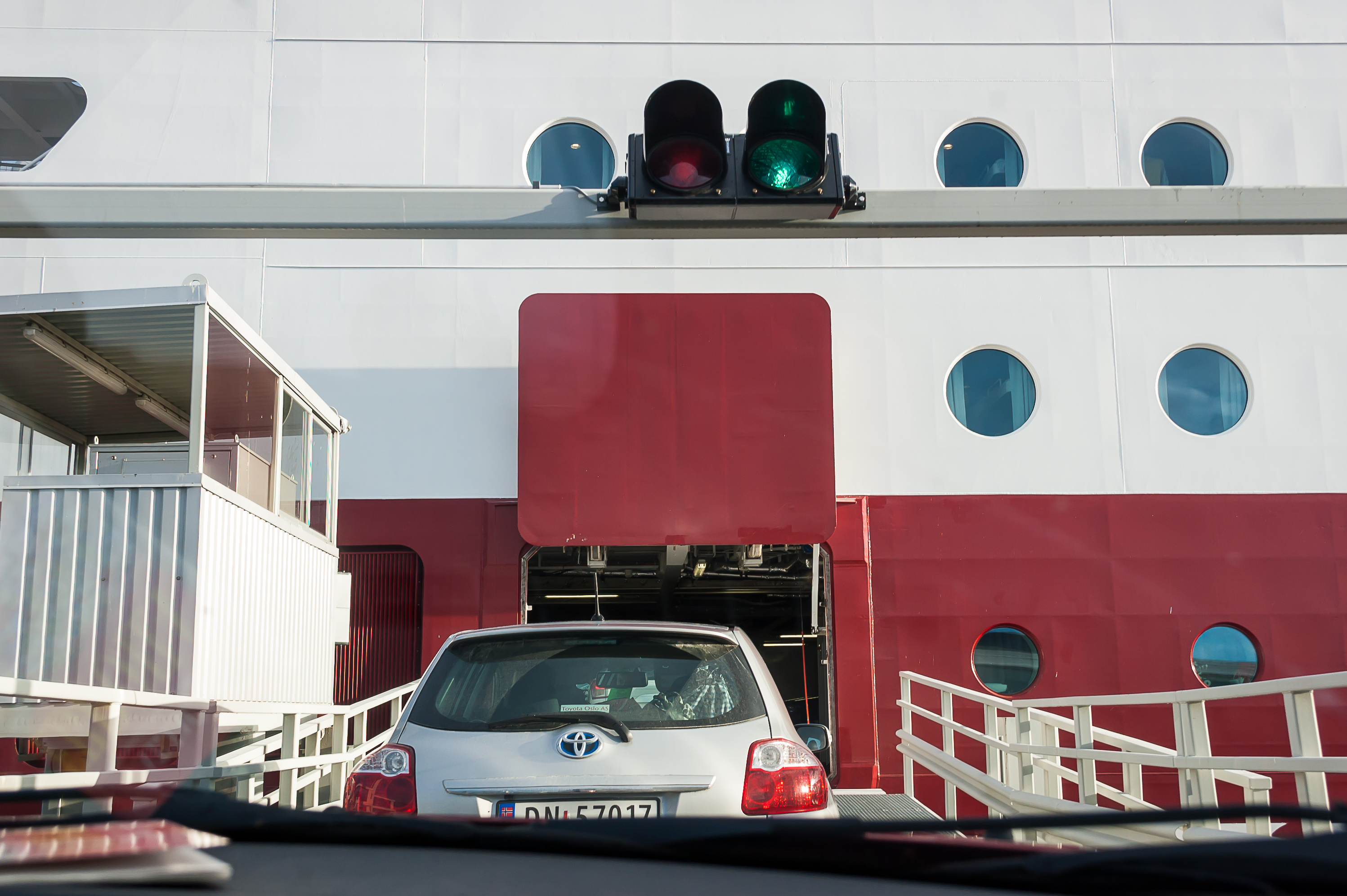 5. Въезжаем на автомобильную палубу. Персонал парома жестами показывает вам, куда проехать. В целом погрузка на паром — задача очень простая (в моем случае это означает «не нужно ни с кем говорить»), хотя мне все-таки интересно, что будет, если, заезжая, в кого-нибудь врежешься и заблокируешь всех остальных.