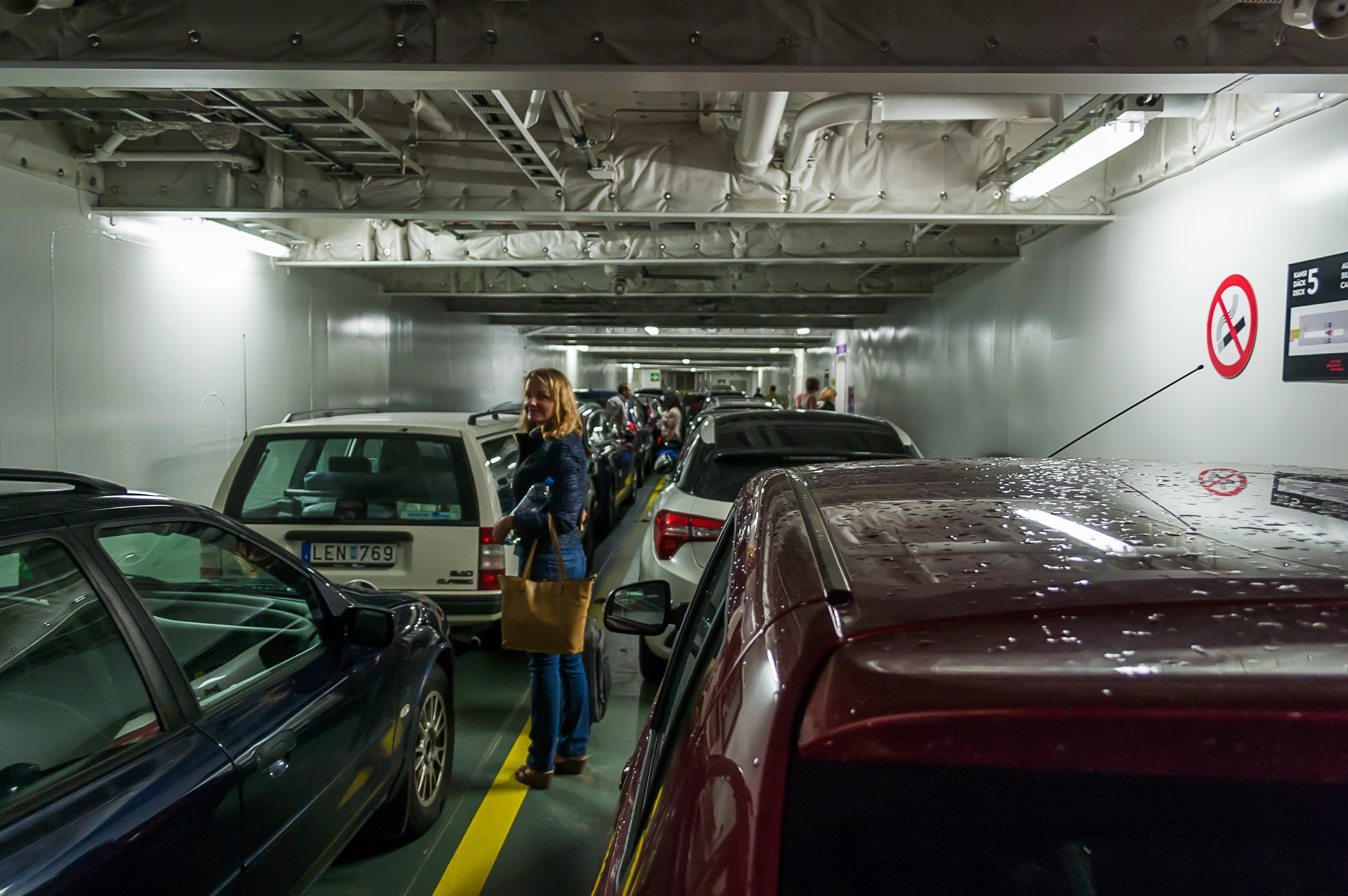 6. Машины нужно «утрамбовывать» довольно плотно, расстояние между бамперами порядка 20 см (опять же, персонал показывает вам до куда доезжать). Постарайтесь получше запомнить, где оставили машину — автомобильная палуба большая и довольно однообразная. А еще ее запирают вскоре после отплытия, так что возьмите из машины с собой все что нужно.