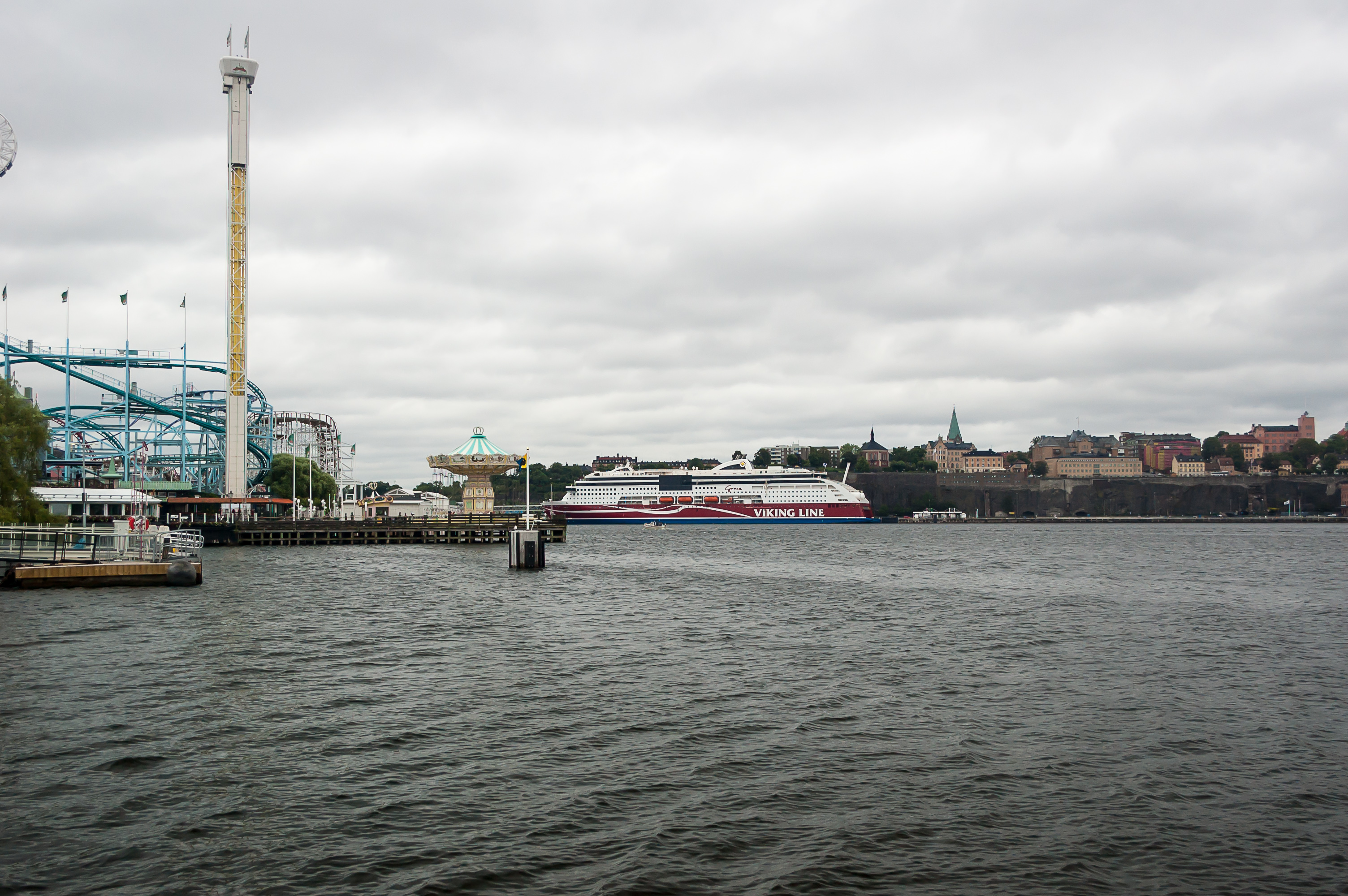 18. На южном берегу Юргордена. Слева виден парк развлечений Грёна Лунд (Gröna Lund), а посередине, ого, похоже на паром «Викинг-Грейс», на котором мы сюда приехали! Он все еще стоит у терминала Стадсгорден, у утесов Сёдермальма.