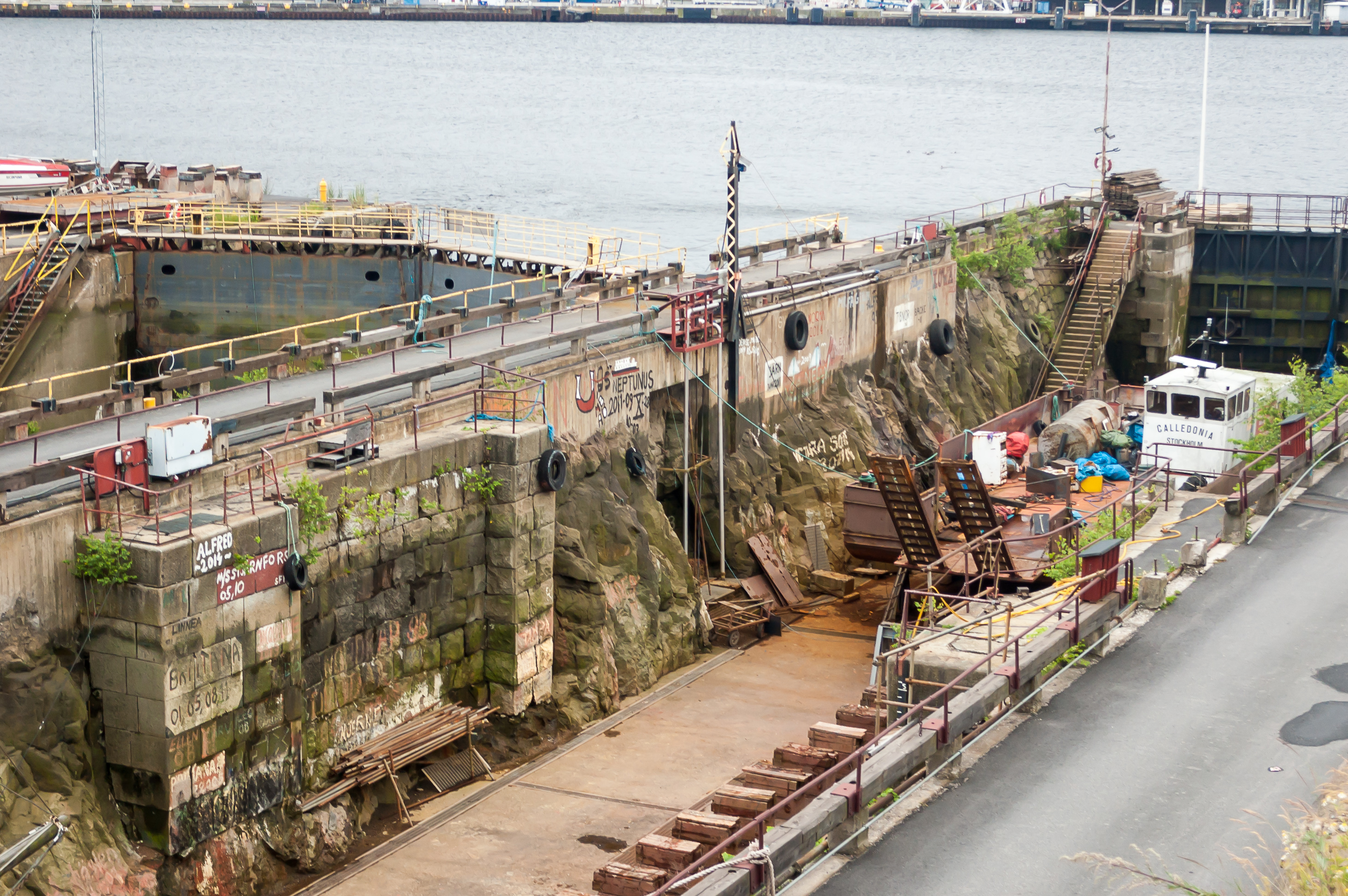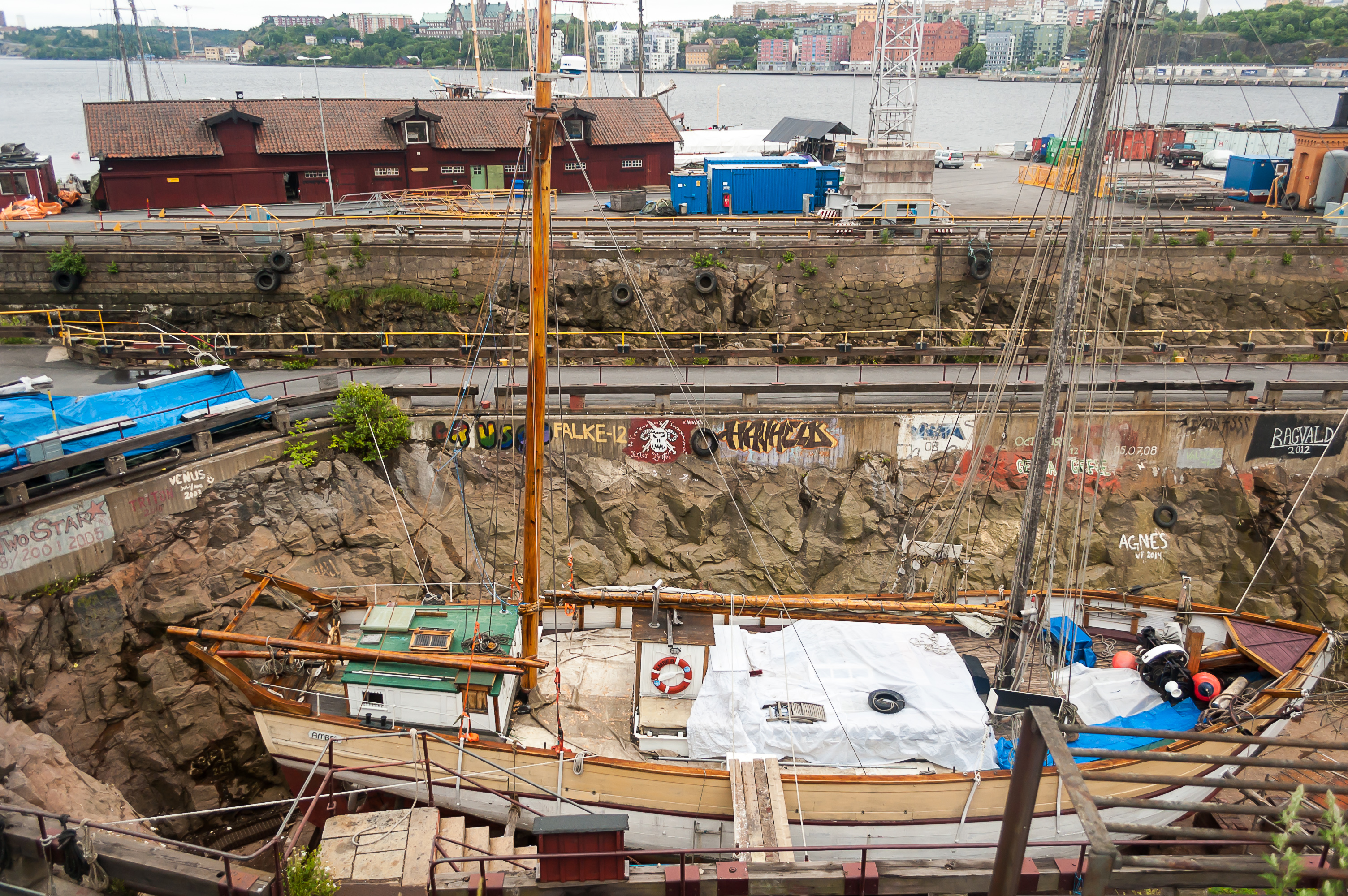 24. Яхта в одном из доков. Стены доков усеяны граффити.