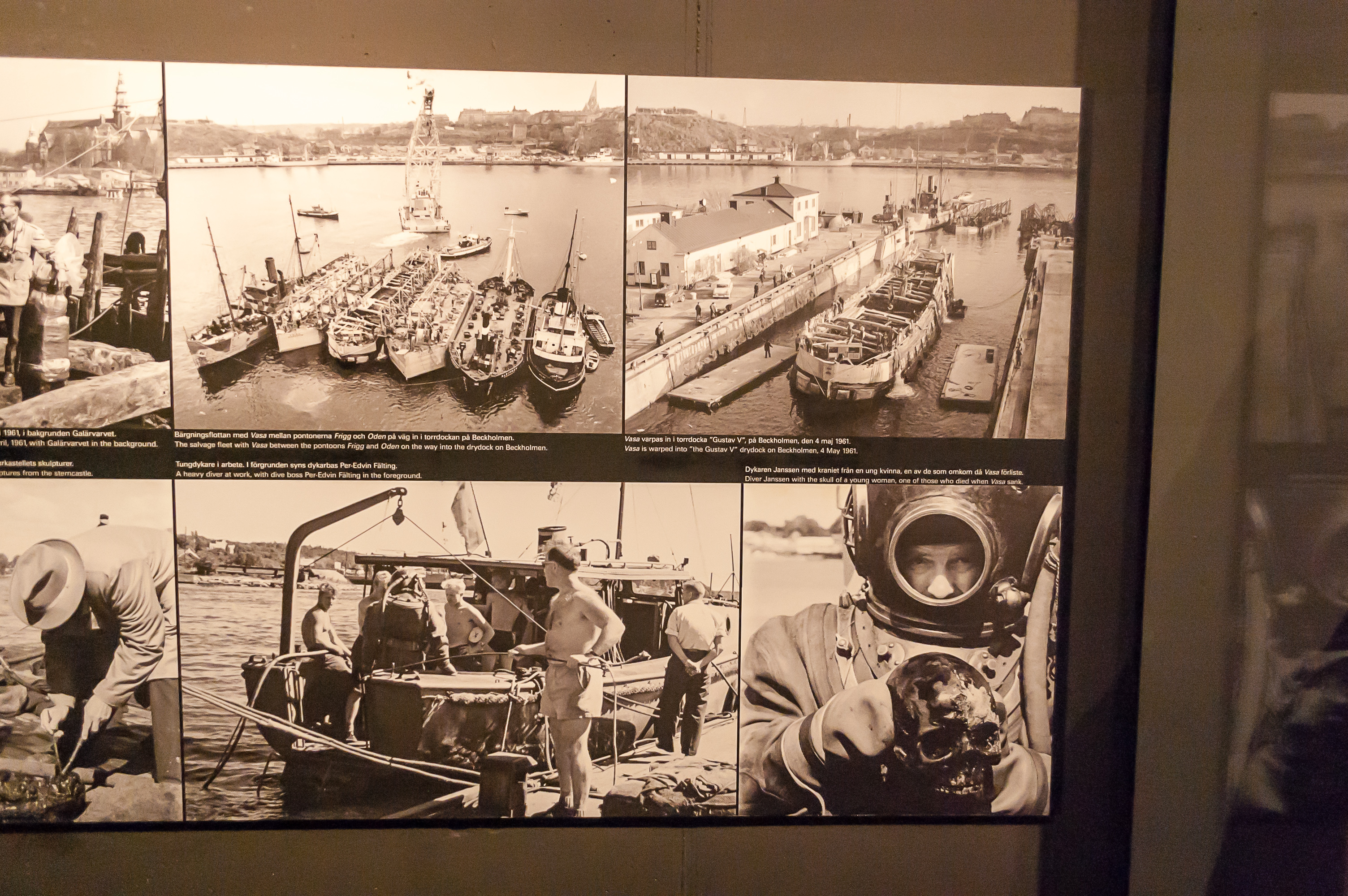 «Васа» пролежал на дне Стокгольмской гавани 333 года. Как ни странно, за эти 333 года он не так уж и сильно разрушился, как можно было бы подумать. Почти пресная вода Балтийского моря была одним из факторов, сильное загрязнение Стокгольмской гавани — другим. Чуть ли не до середины 20 века вода в Стокгольмской гавани была исключительно грязная, так что в ней почти ничего живое не могло выжить, включая, например, корабельных червей — грозу деревянных останков кораблекрушений. В 1956 году точное место, где лежал «Васа» (совсем рядом с островом Бекхольмен, где мы гуляли в предыдущем посте) было обнаружено любителем-археологом, и он убедил военных, Национальный морской музей, и частную спасательную компанию попробовать поднять «Васу» еще раз.