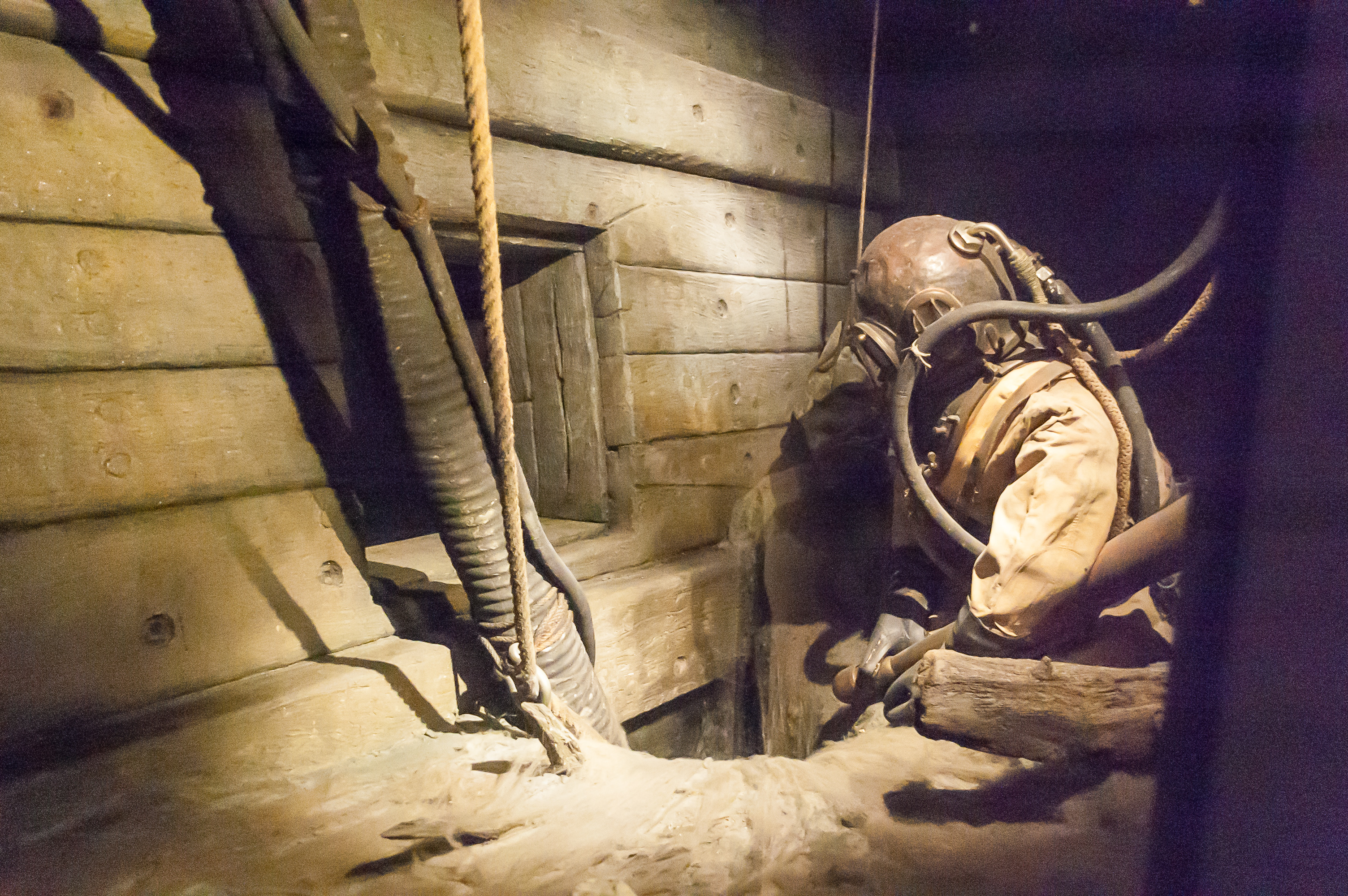 9. А здесь он уже поднят со дна. Нос корабля был сильно поврежден, если не ошибаюсь — в ходе ранних неудачных попыток подъема, — и перед этим подъемом пришлось сколотить вокруг него деревянный саркофаг, тоже хорошо видный на модели.