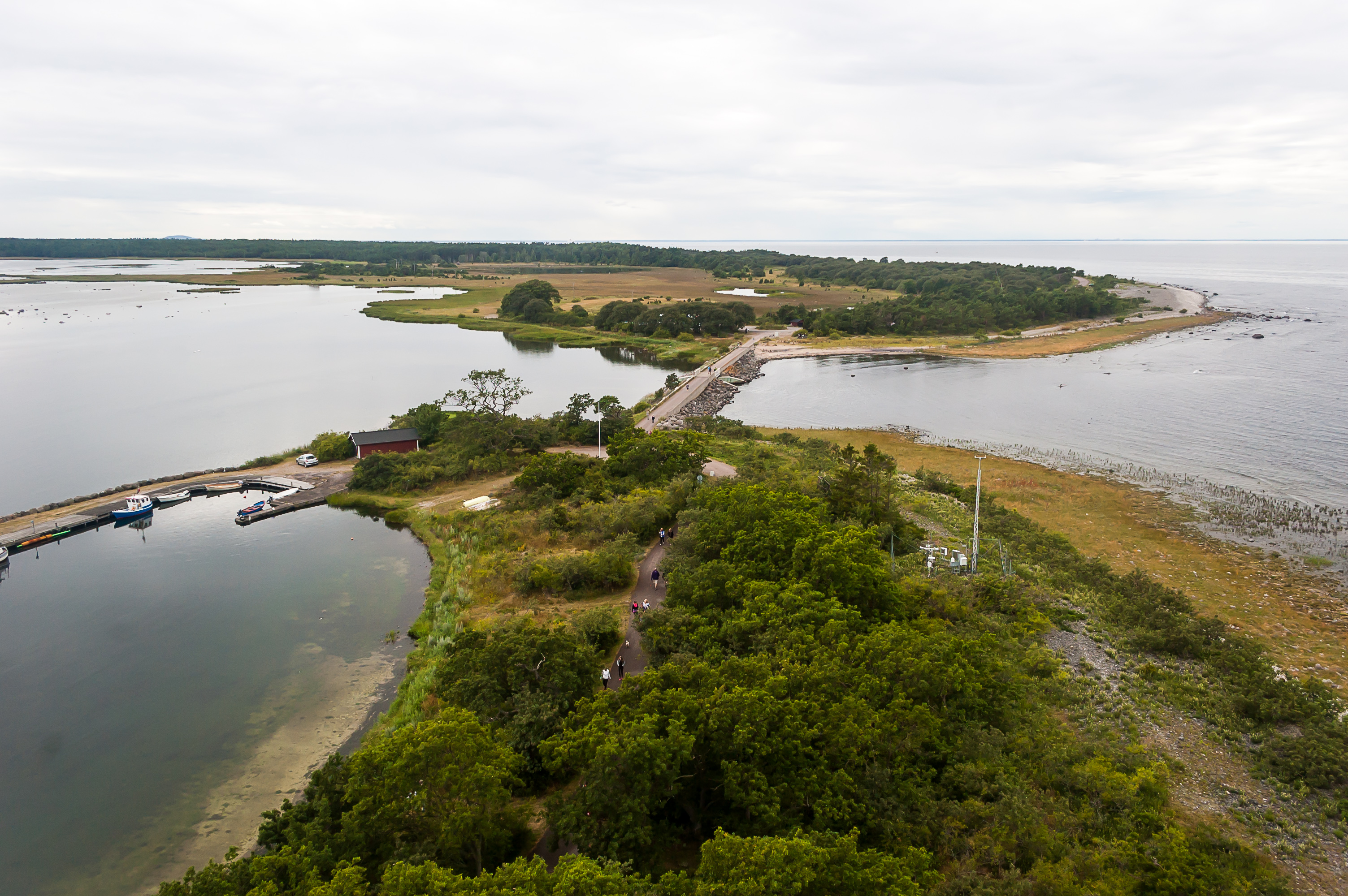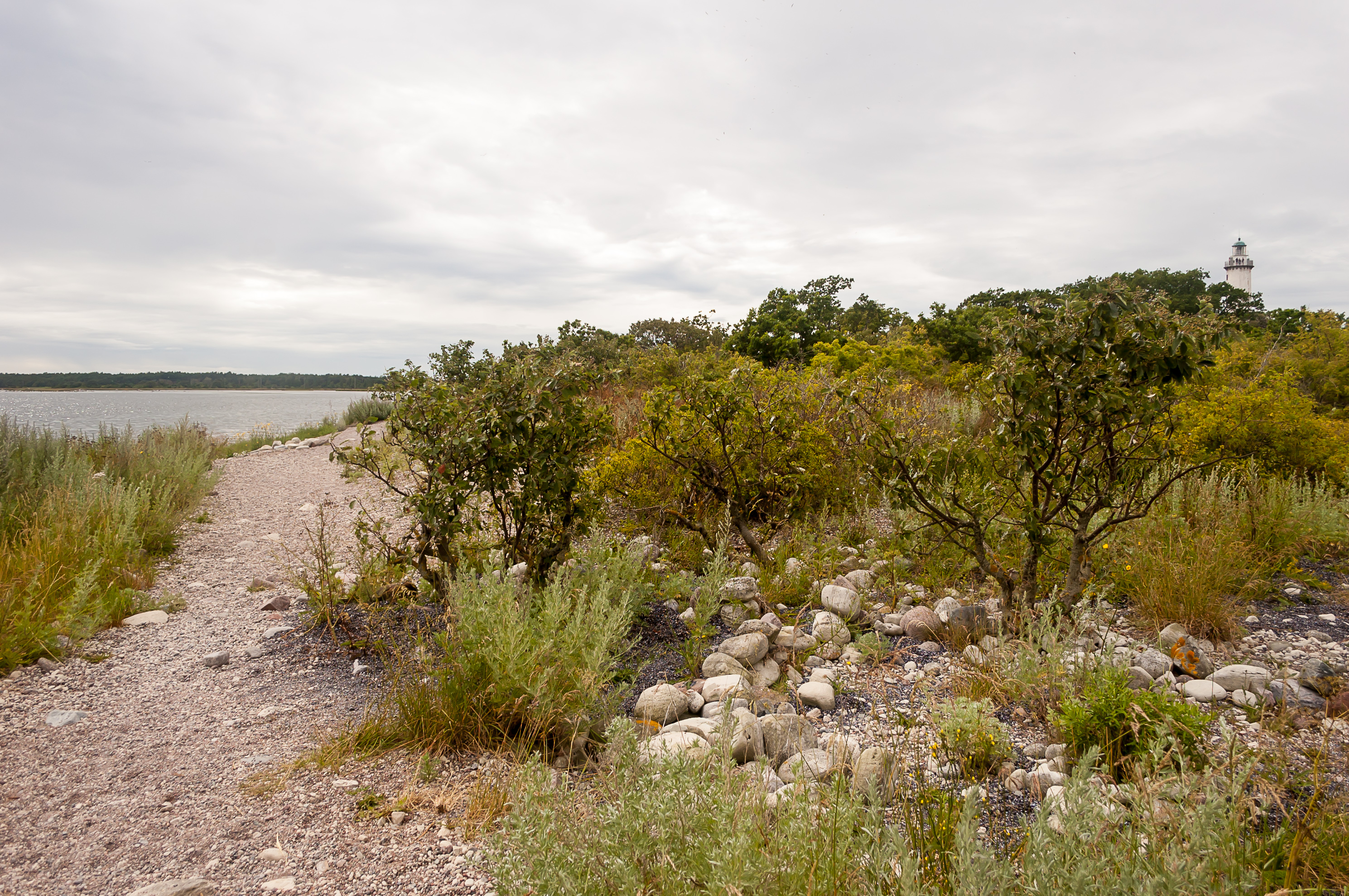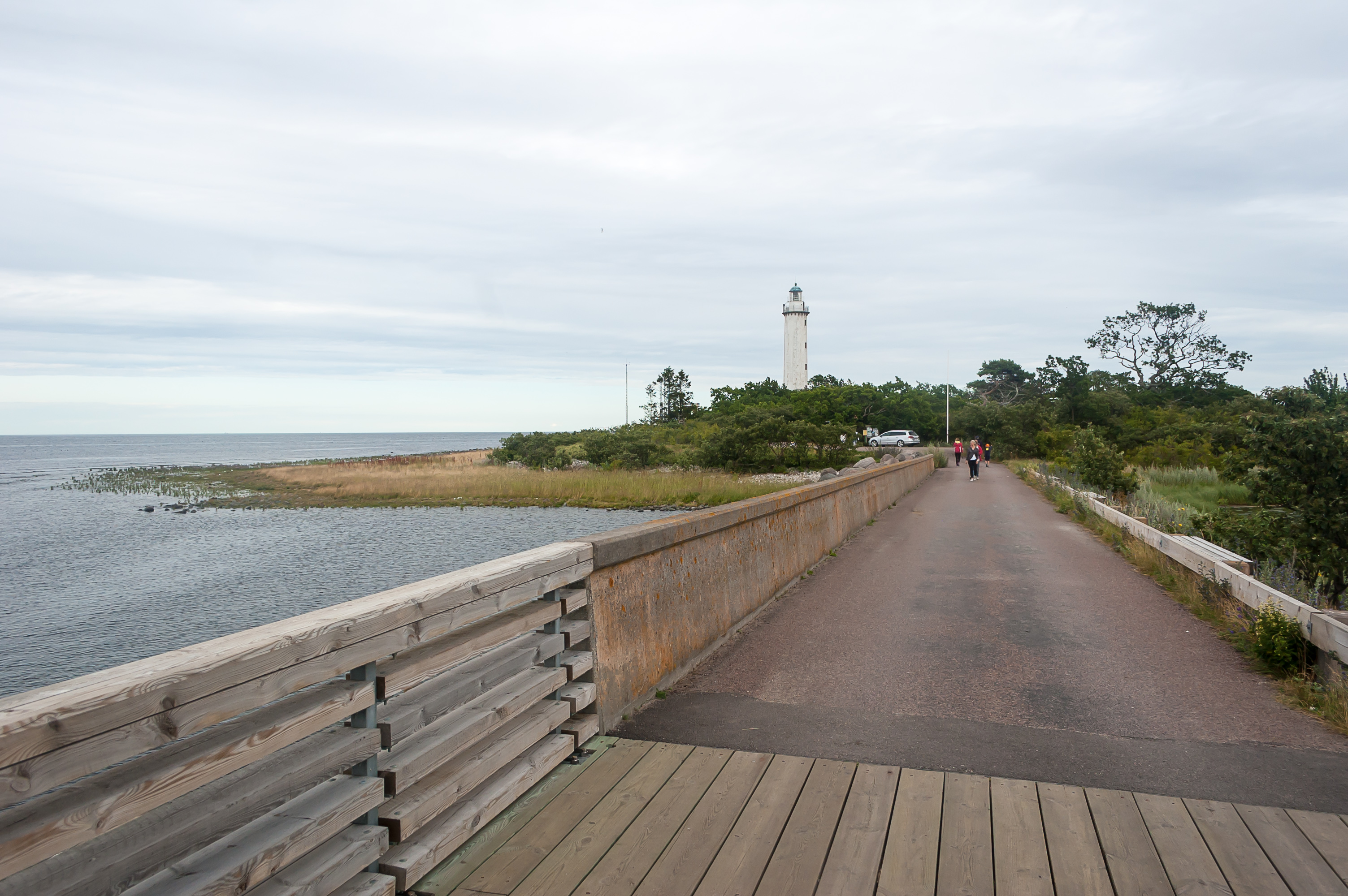 2. Мы проехали через поселки Бёда (Böda) и Бушелькрук (Buxelkrok), каменистый берег, называемый Нептуновыми полями, и наконец свернули налево на местную дорожку к маяку, нервничая в процессе все больше и больше. В 15:52 мы оставили машину на парковке и побежали к маяку. Он находится на отдельном небольшом островке под названием Стура-Грундет (Stora Grundet, швед. Большая отмель), размерами 500×150 м, соединенном с Эландом вот этим вот мостом (по которому на машине нам уже нельзя). К счастью 32-метровый маяк уже рядом.