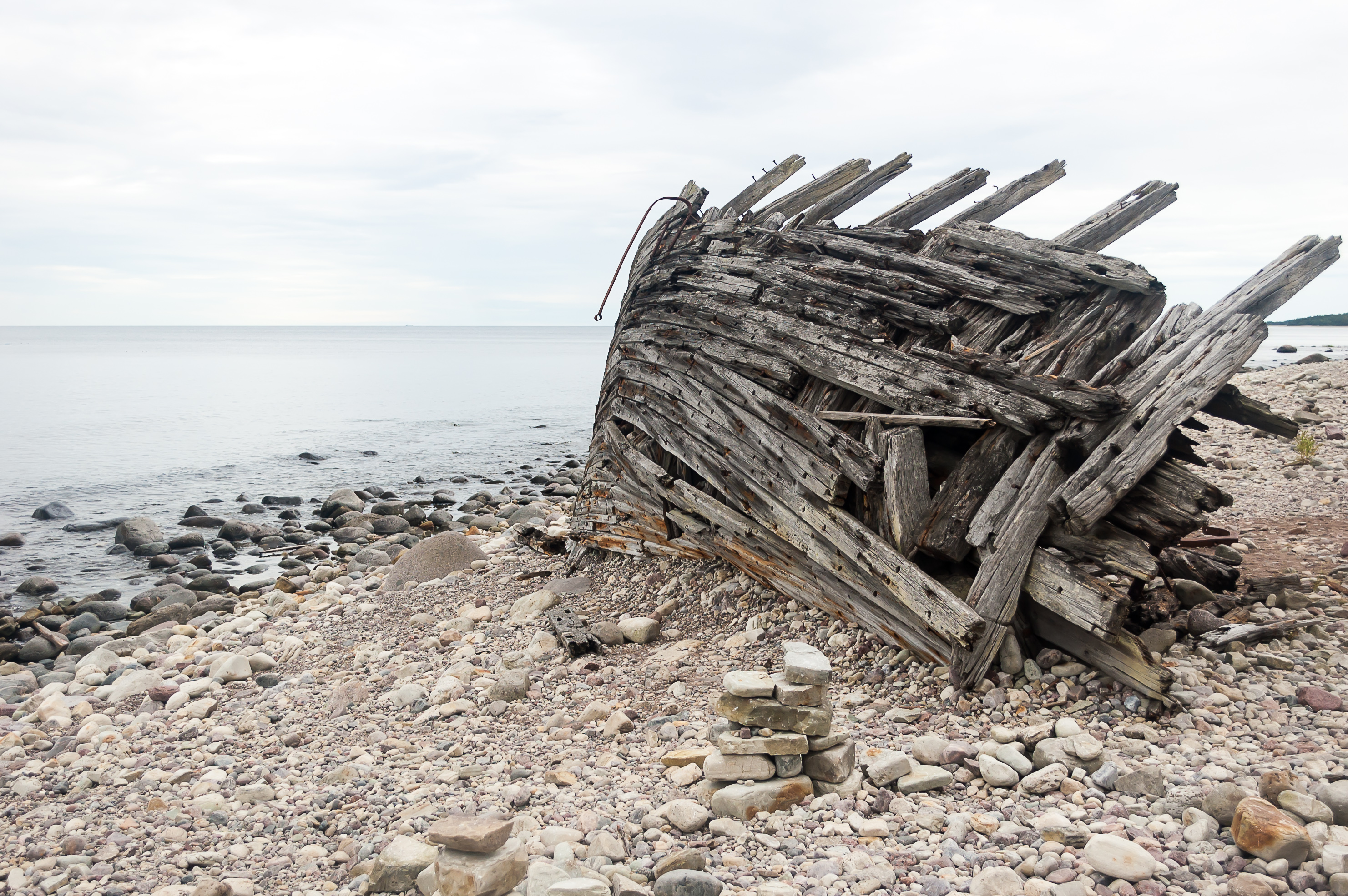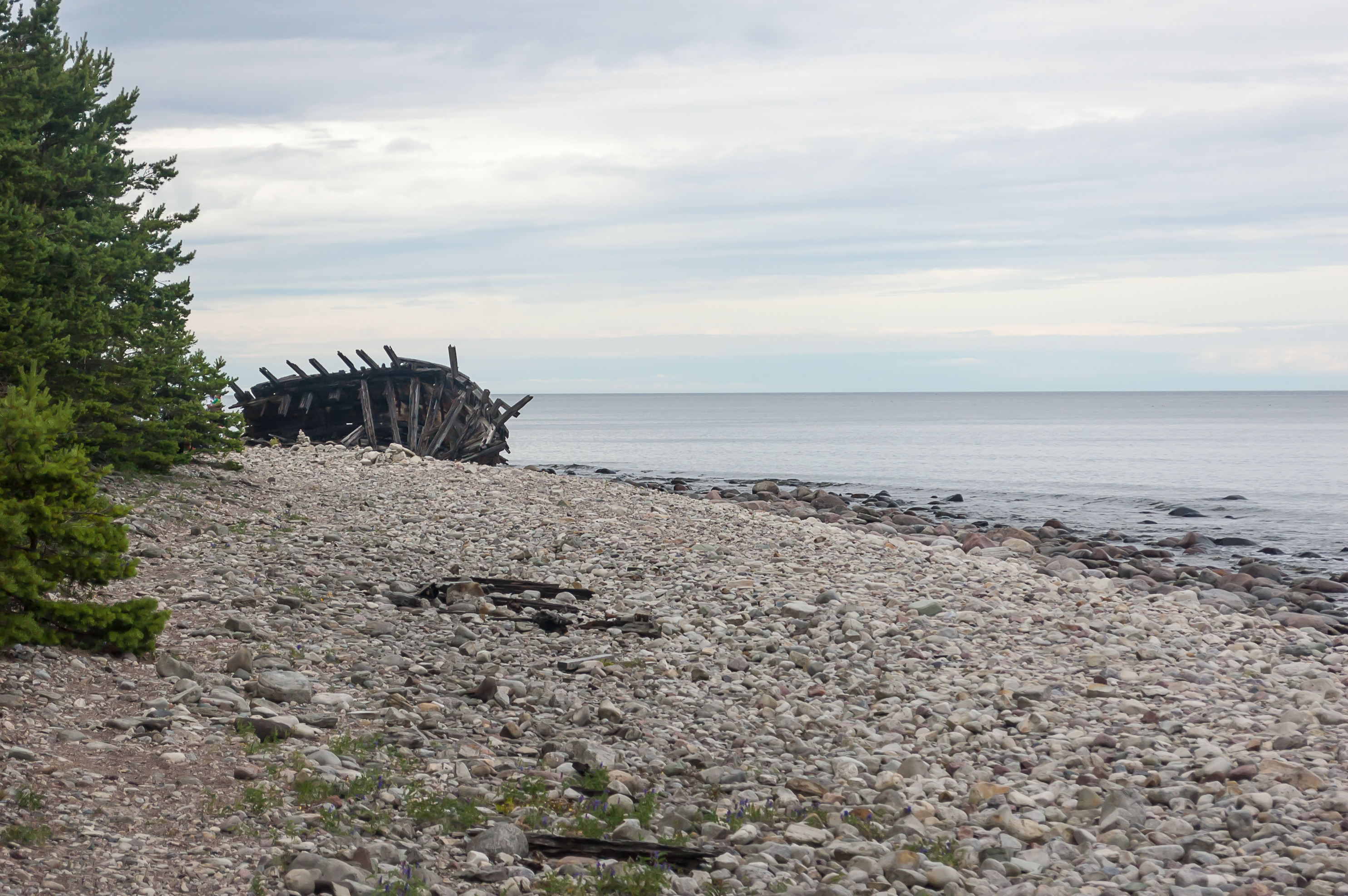 33. А вот и место кораблекрушения! Это аландская шхуна под названием «Свикс» (Swiks), построена в 1902 в Латвии, и разбилась здесь в 1926 году. Я и не думал, что выброшенный на берег деревянный остов судна (34 м длиной) может сохранять форму почти век. История кораблекрушения не такая уж увлекательная; шхуна с экипажем из семи человека плыла из Фленсбурга, Германия, в Мариехамн, Аландские о-ва, и попала в шторм. Попытались обогнуть Эланд, чтобы укрыться в гавани Кальмара, но что-то пошло не так, и сели на мель у Тролльскугена. Команда покинула судно и после некоторых блужданий благополучно вышла к близлежащей деревне Гранкуллавик. Остов «Свикса» со временем был выброшен с отмели на каменистый берег другим штормом в 1950-х годах.