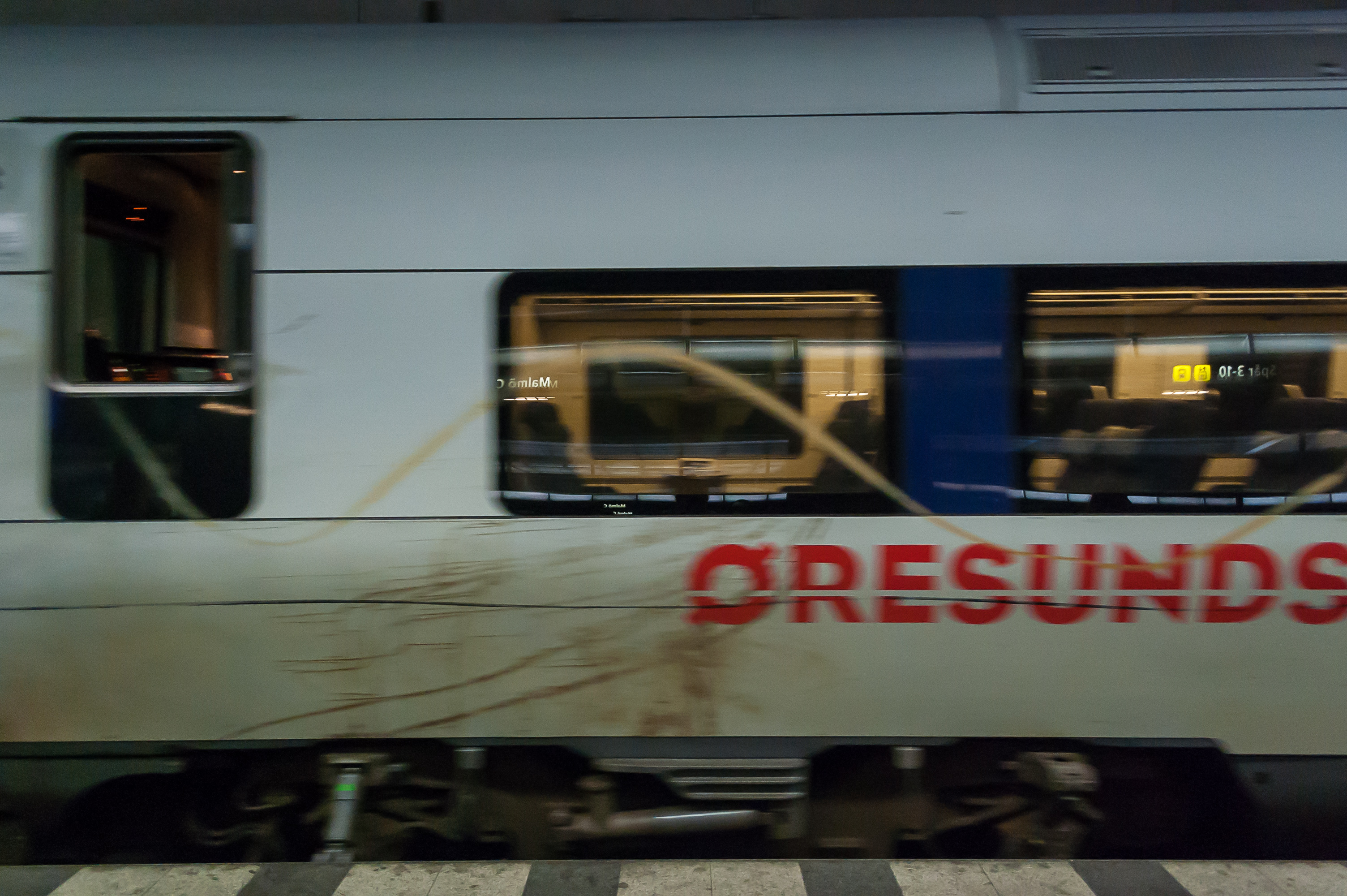 44. И вот мы заходим на Эресуннстог. Øresundståg буквально и означает «Эресуннский поезд». Эти электрички, связывающие Мальмё и Копенгаген, ходят в течение дня с 20-минутными интервалами, а ночью — с часовыми. (Есть и некоторые другие поезда, пересекающие Эресуннский мост.) Поезд делает далее остановку под центром Мальмё, потом довольно долго едет по мосту и туннелю — уже темно было и ничего в окошко не видно — далее останавливается в копенгагенском аэропорту, и наконец, вокзал Копенгагена. (Подробнее про поезда, с фотографиями, будет дальше, когда буду писать про возвращение из Копенгагена.)