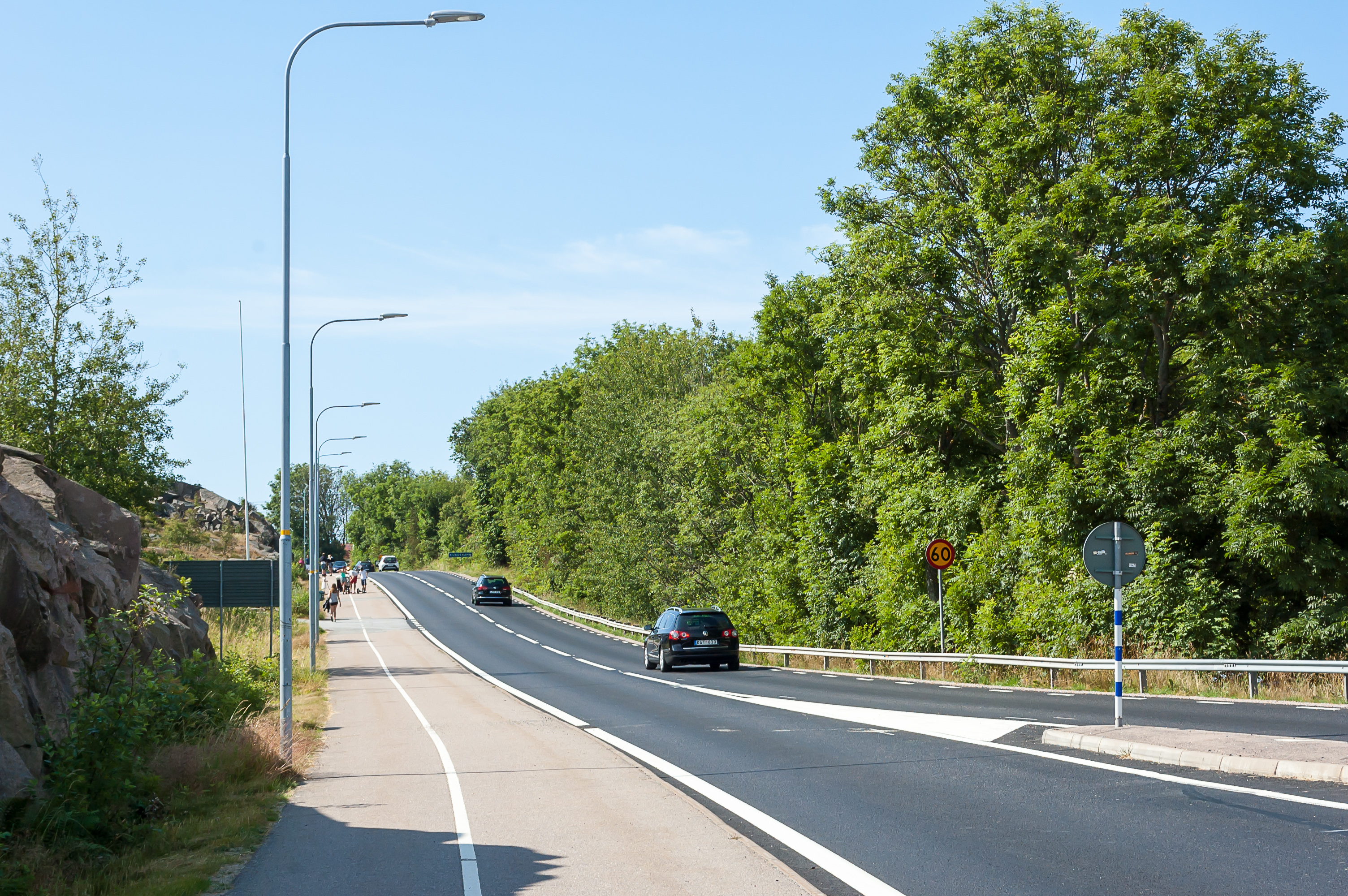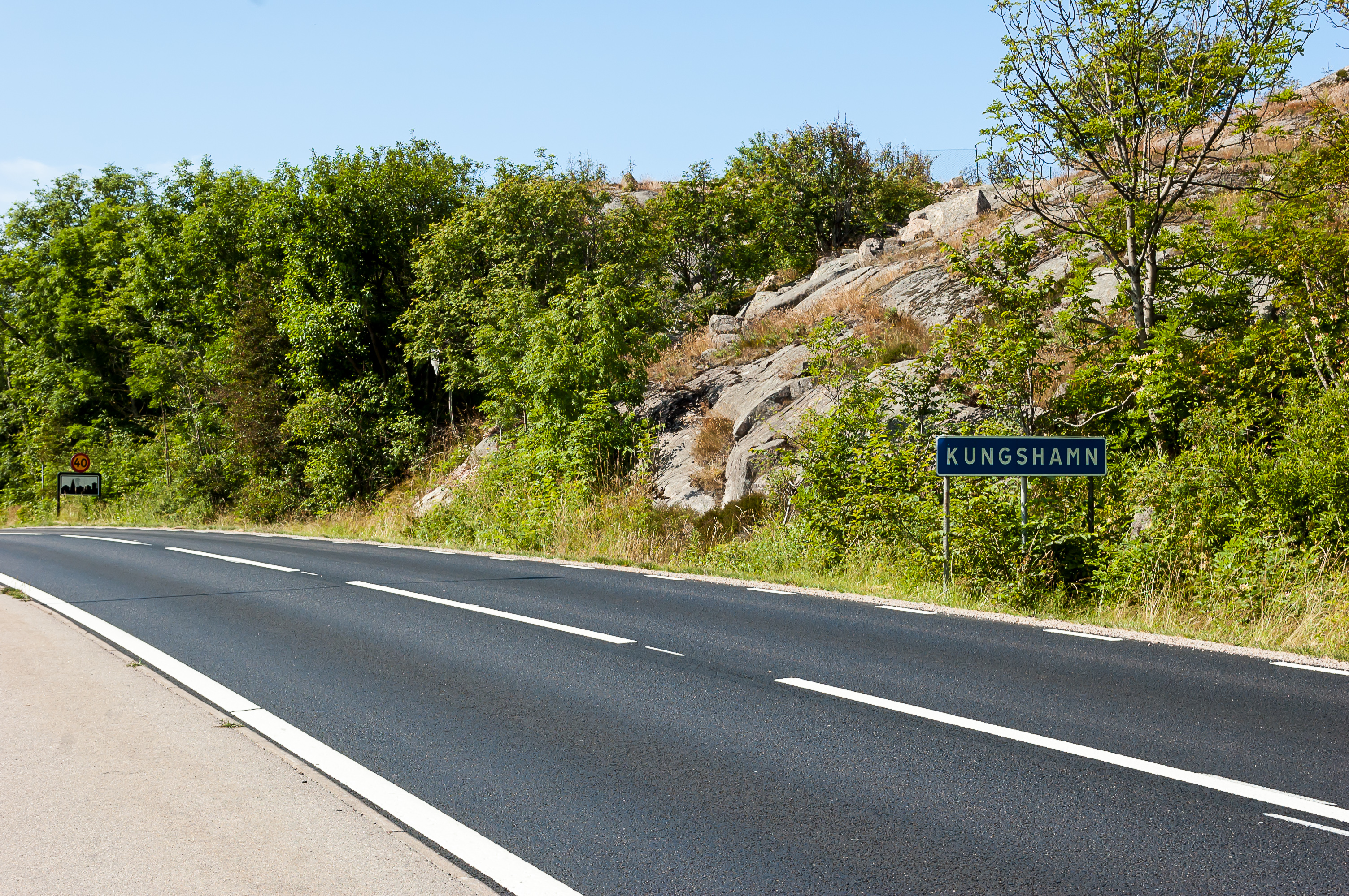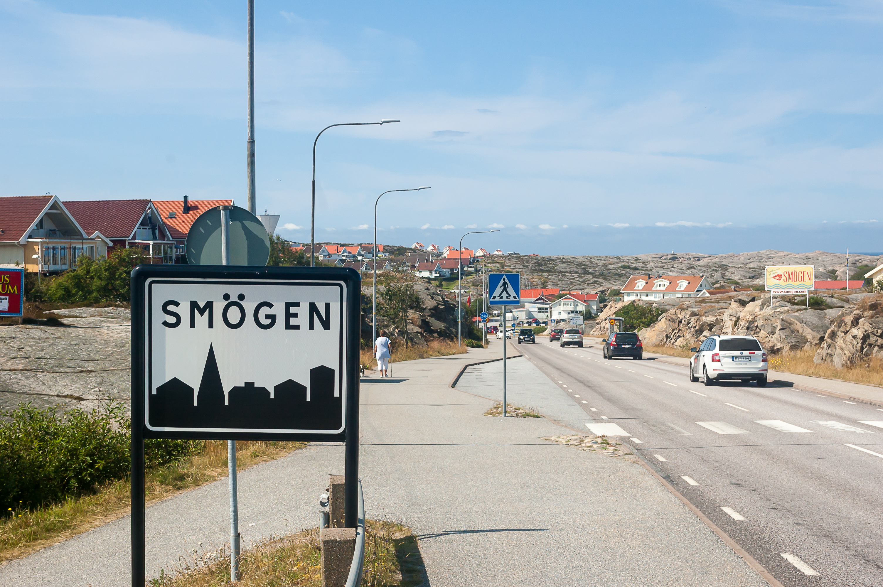 8. Знак «Смёген» встречает сразу на съезде с моста. Смёген почти полностью состоит из тех же довольно больших частных домиков, что и Кунгсхамн. Сам остров, на котором они находятся, представляет собой по сути одну огромную скалу, почти без деревьев и с редкими участками травы. Собственное население Смёгена — всего 1300. Наряду с Кунгсхамном, он относится к муниципалитету Сотенес (Sotenäs).