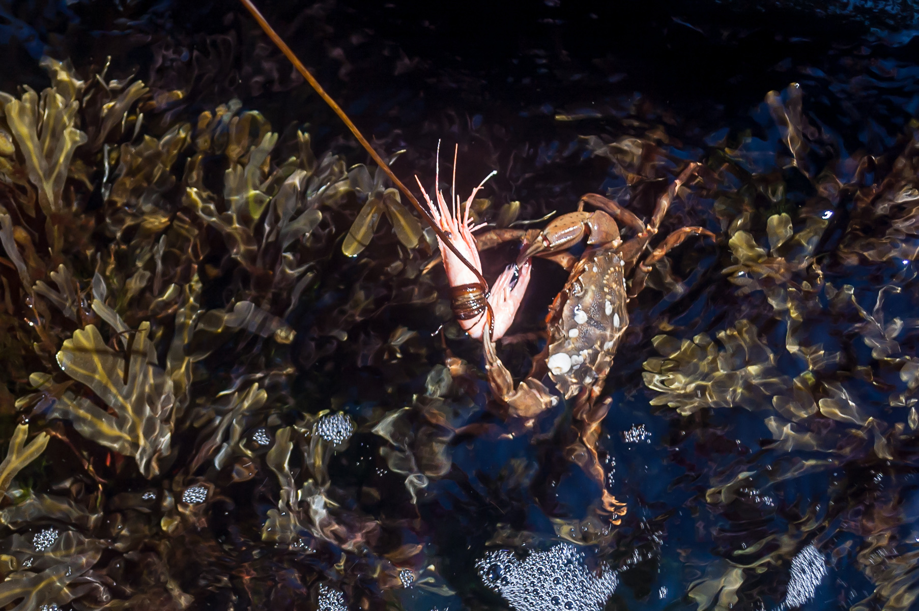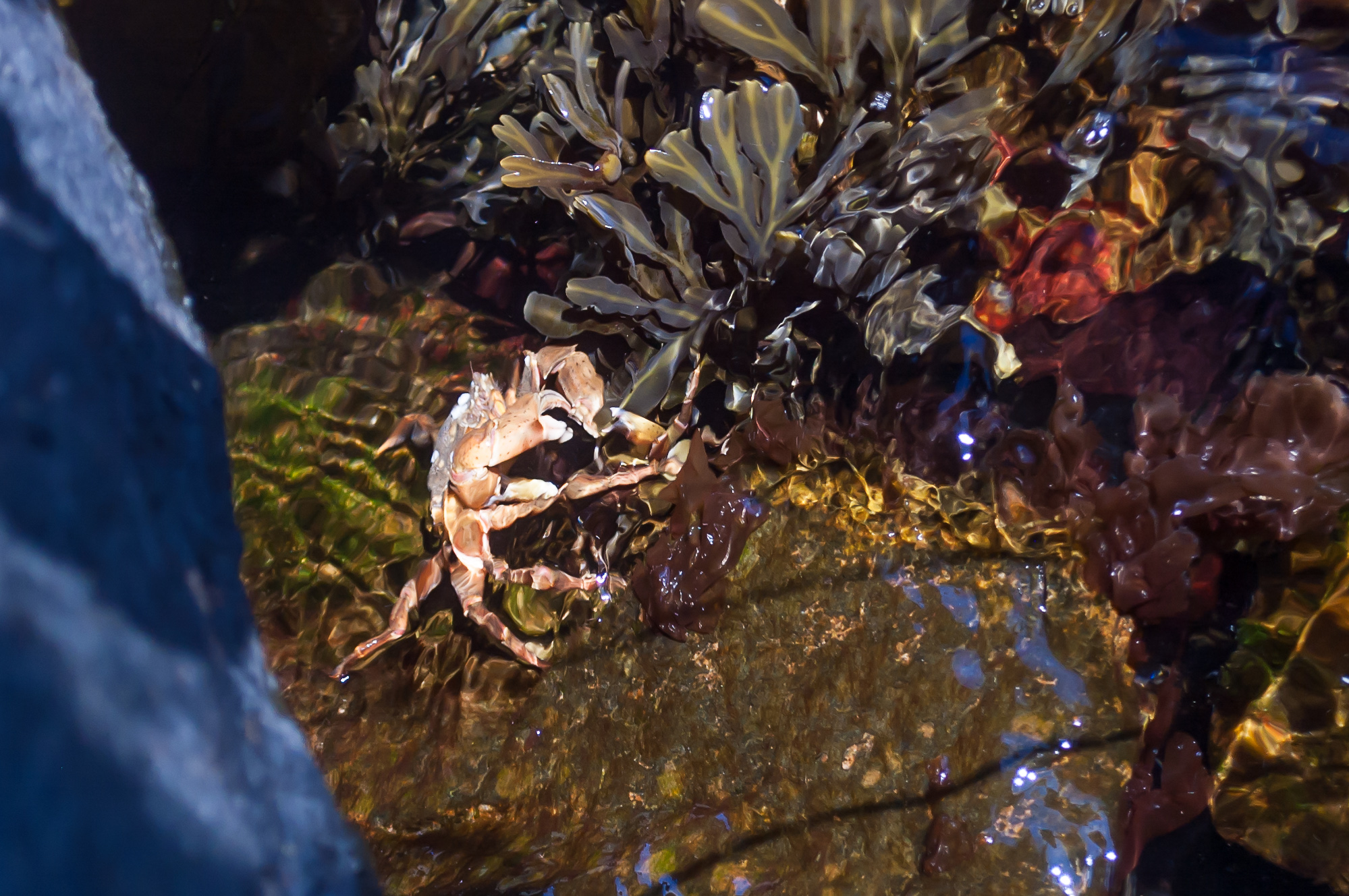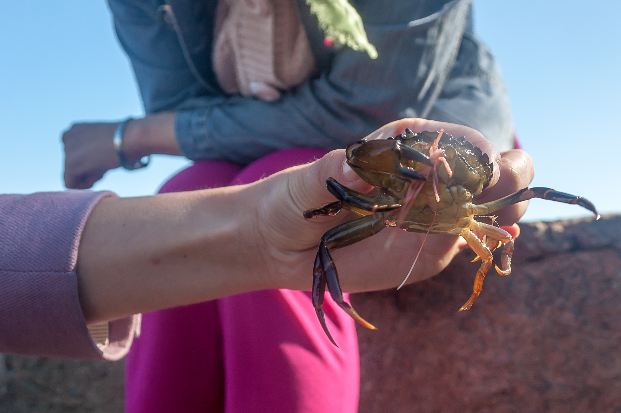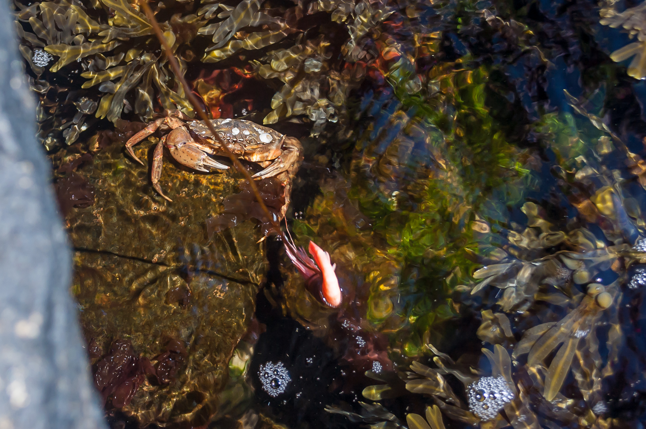 13. Именно в Люсешиле мы решили попробовать половить крабов. Их много в трещинах и водорослях у берега живет. Крабы жрут практически все (насколько я знаю), так что мы захватили с собой пару креветок с завтрака из «Экелёфс» в качестве приманки. Сначала у нас выходило не очень. Мы выбрали место с довольно заметным прибоем, и привязали креветку к концу длинной скользкой водоросли. Когда мы бросили ее в воду, крабы через минуту-другую действительно начали появляться, но тут креветка выпала. Она утонула среди водорослей, и через какое-то время оттуда выплыли ее ошметки. Сожрали-таки ее крабы. Вторую креветку привязали покрепче, и с ней что-то стало получаться. Но все равно крабы в прибое очень легко срывались обратно, когда мы пытались вытащить их из воды. Один раз таки вытащили одного, но он тут же упал на мокрый камень и убежал с удивительной скоростью.