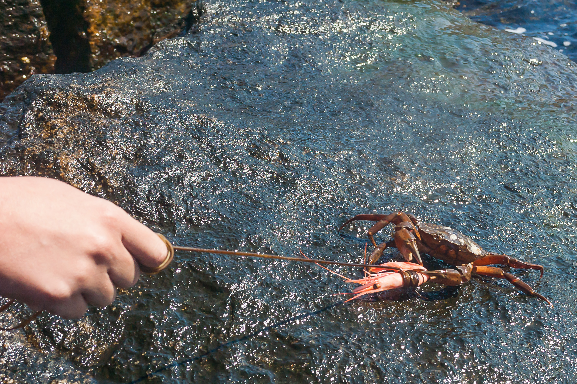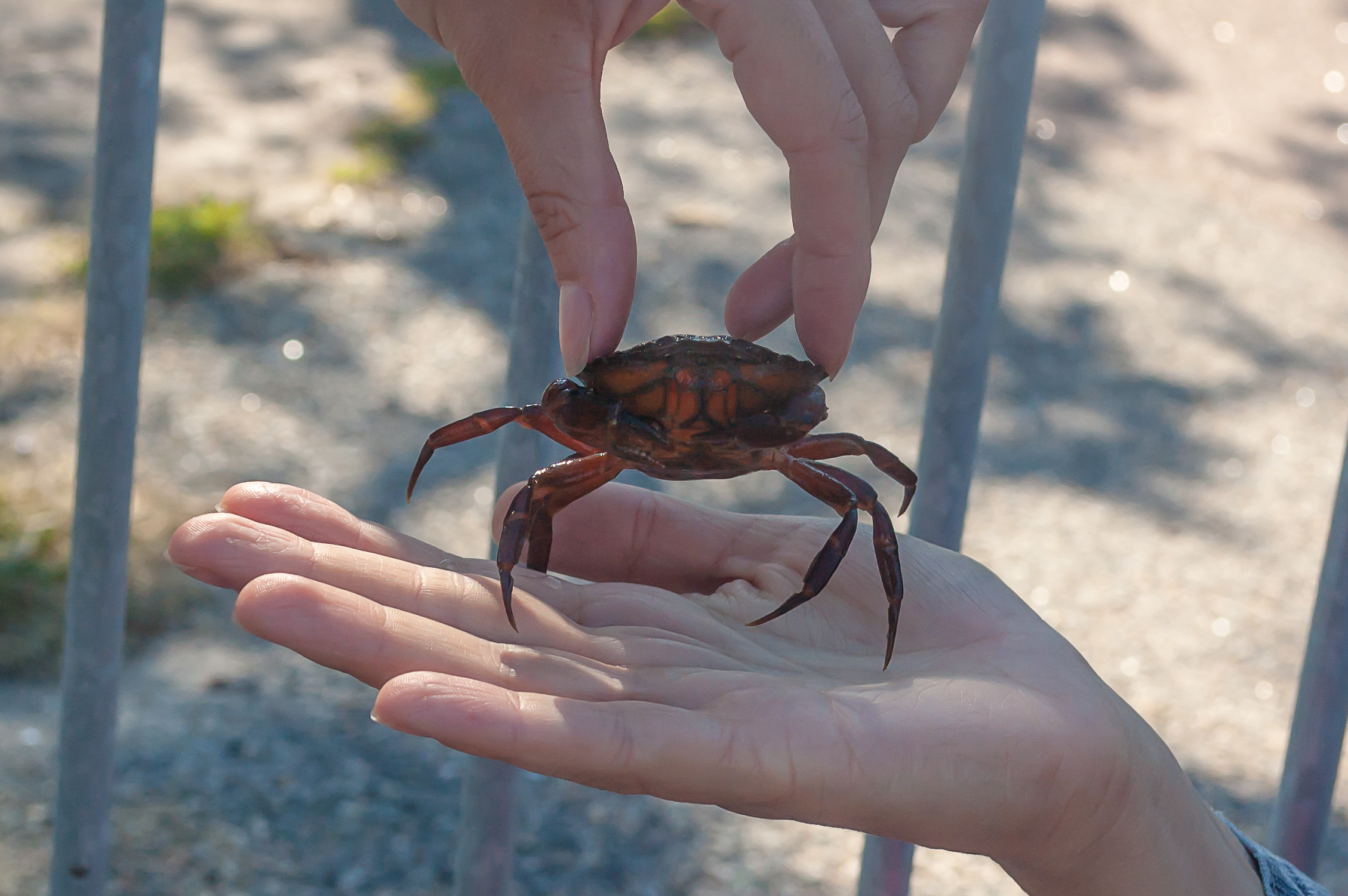 18. Потом мы перешли в тихое место у пирса. Здесь кто-то уже оставил прищепку на веревочке, с которой закрепить креветку стало намного проще. Мы без труда вытащили несколько крабиков размером 5-8 см (не считая ног). Если их взять за бока их жесткого панциря, они не достанут клешнями (да и вообще особо ничего сделать не смогут).