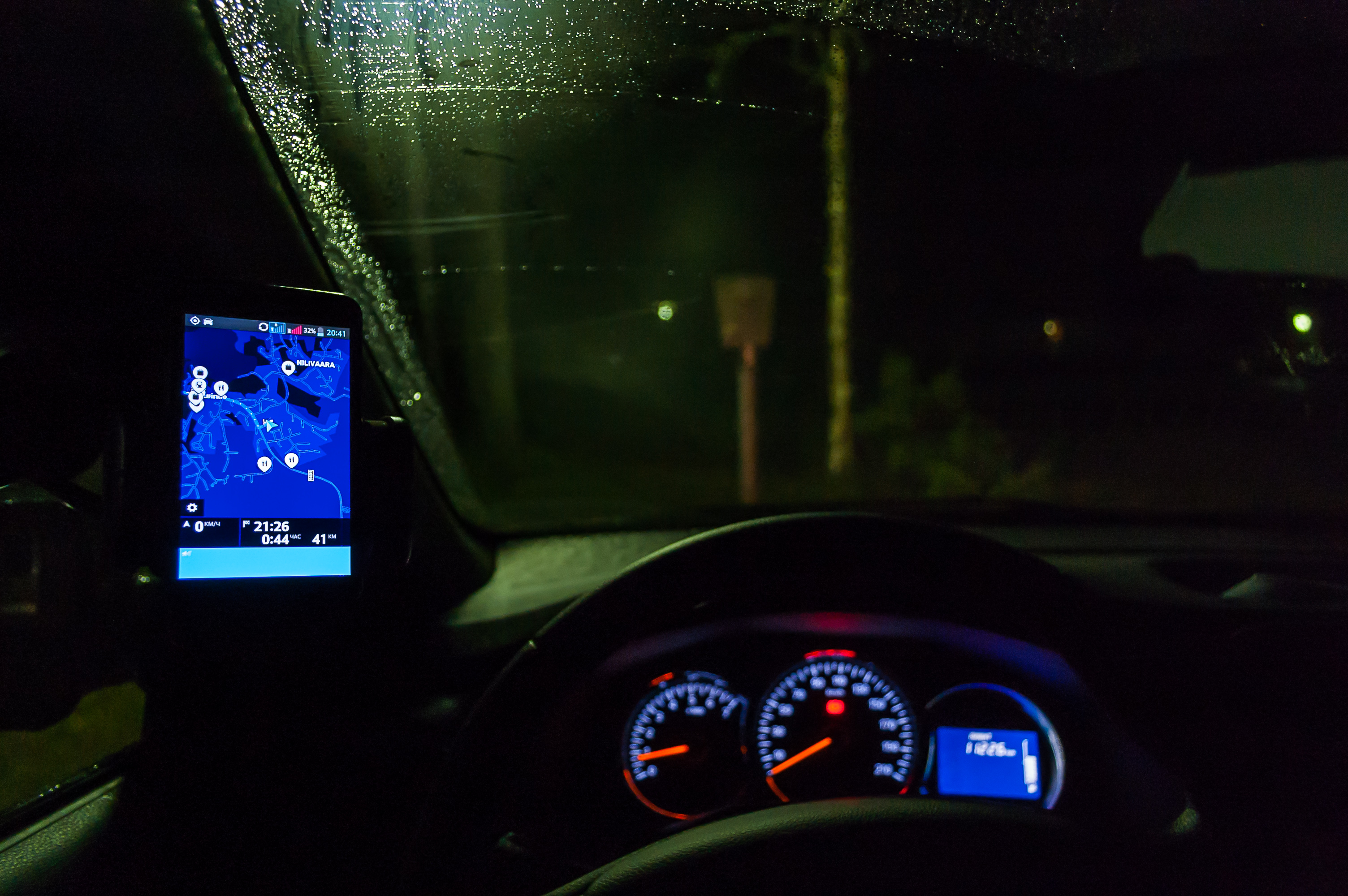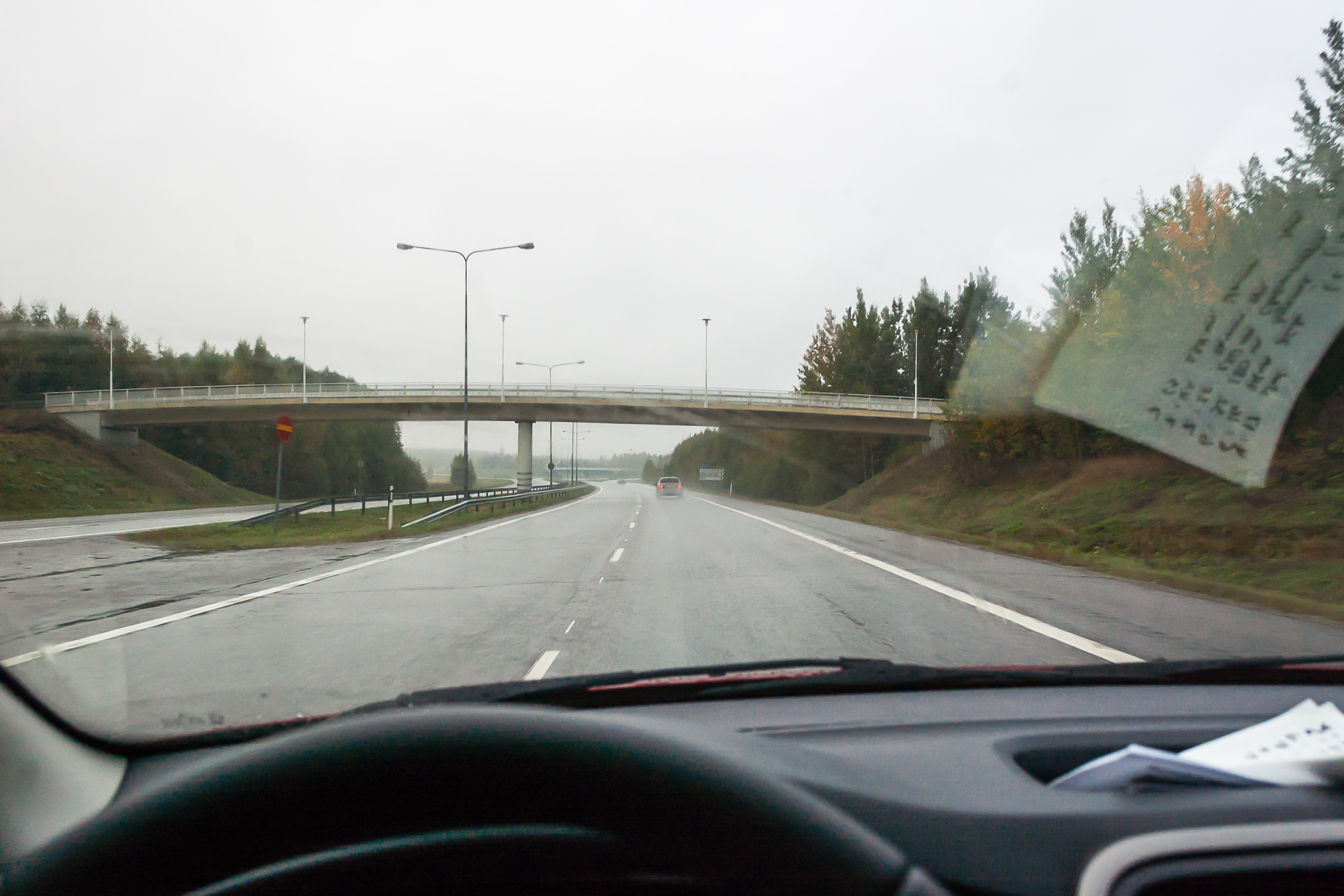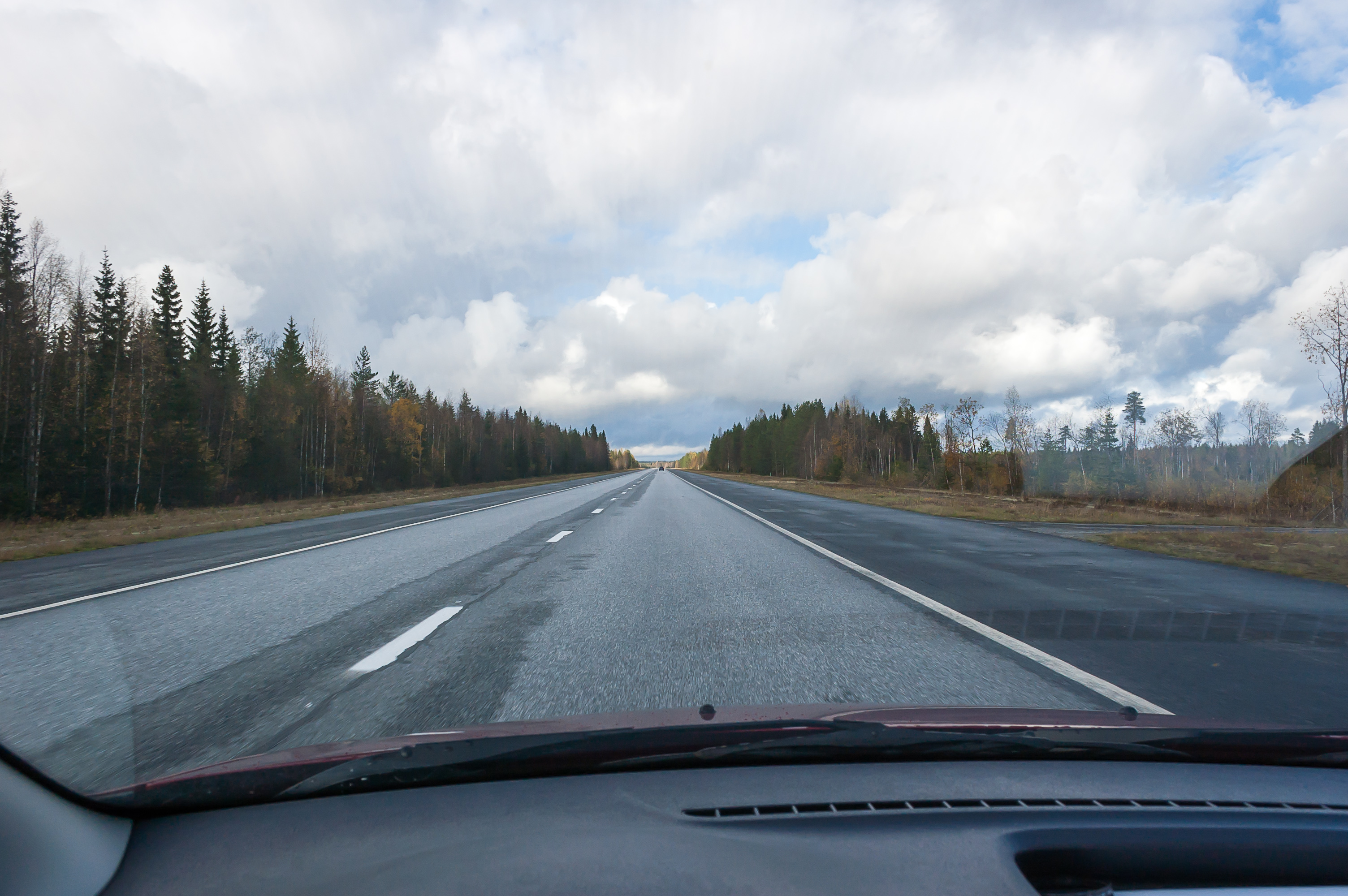 1. 4:17, 0 км: поехали! Выезжаю прямо в жуткий ливень посреди ночи. Быстро съехал на КАД (Кольцевую автодорогу) и объехал Петербург против часовой стрелки. В колеях стояла вода, ехать было очень неуютно. Где-то у съезда на Московское шоссе увидел разбитую в хлам, и, похоже, выгоревшую машину, торчавшую из отбойника. У нас тут как на войне.