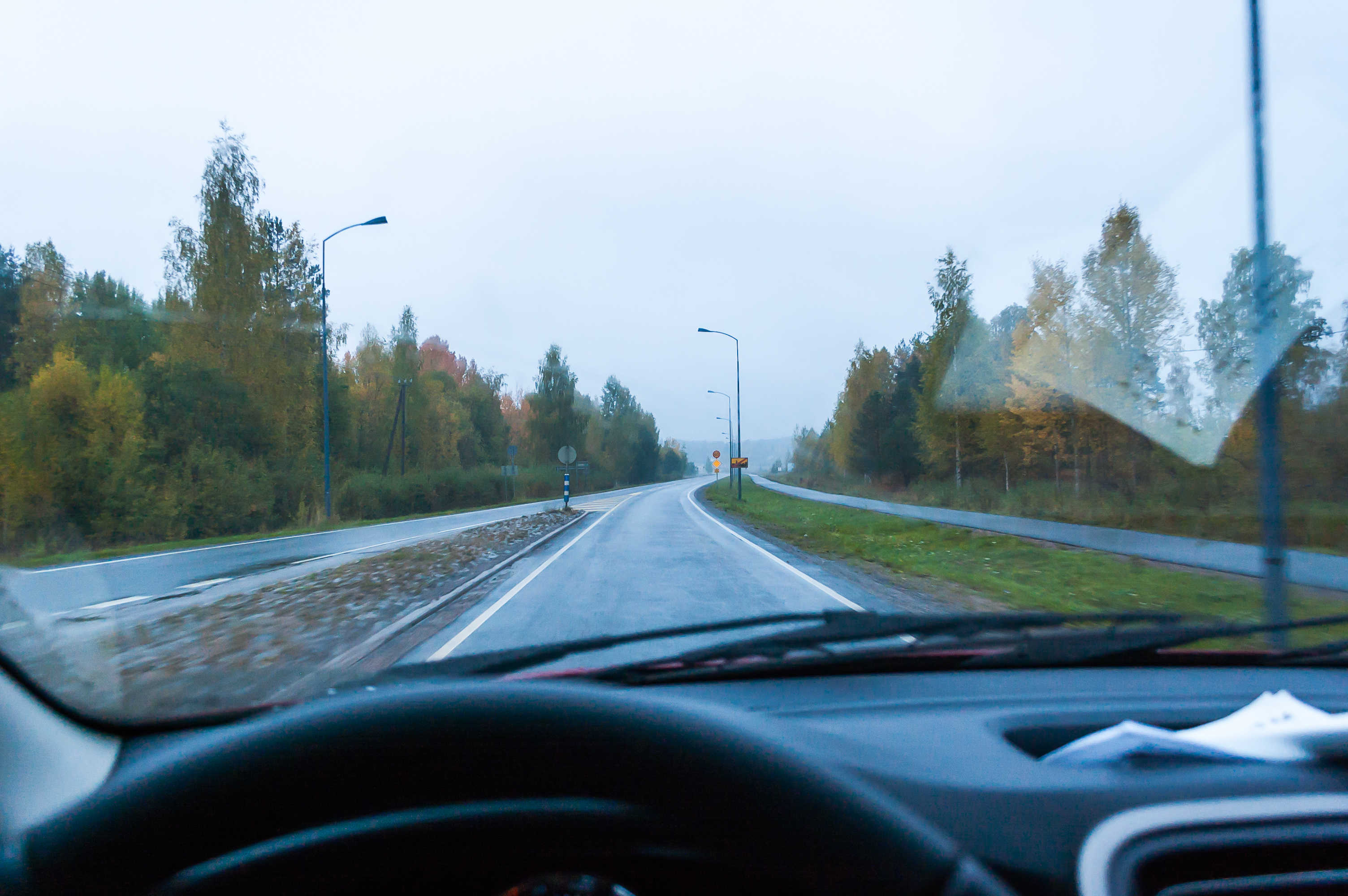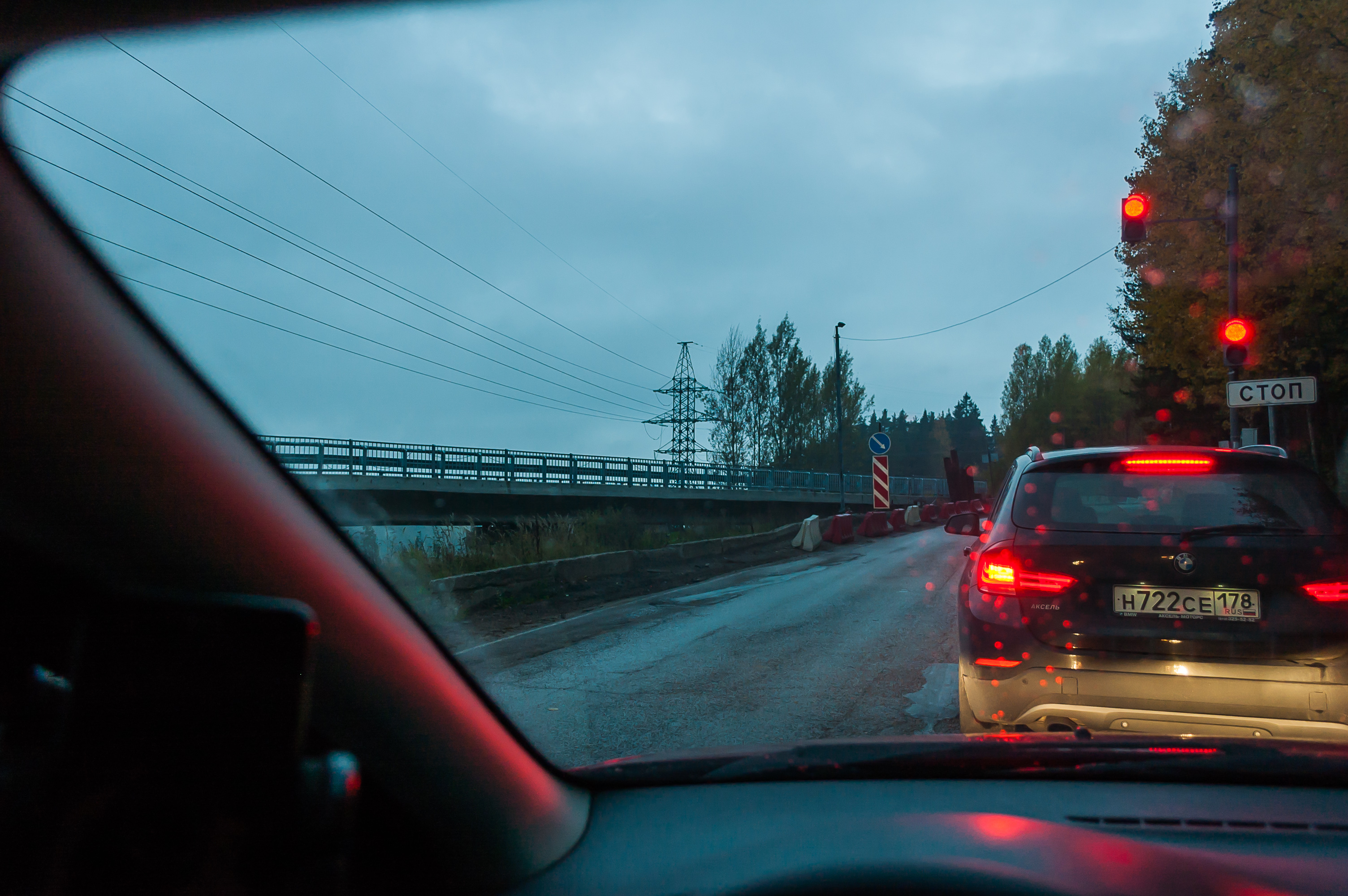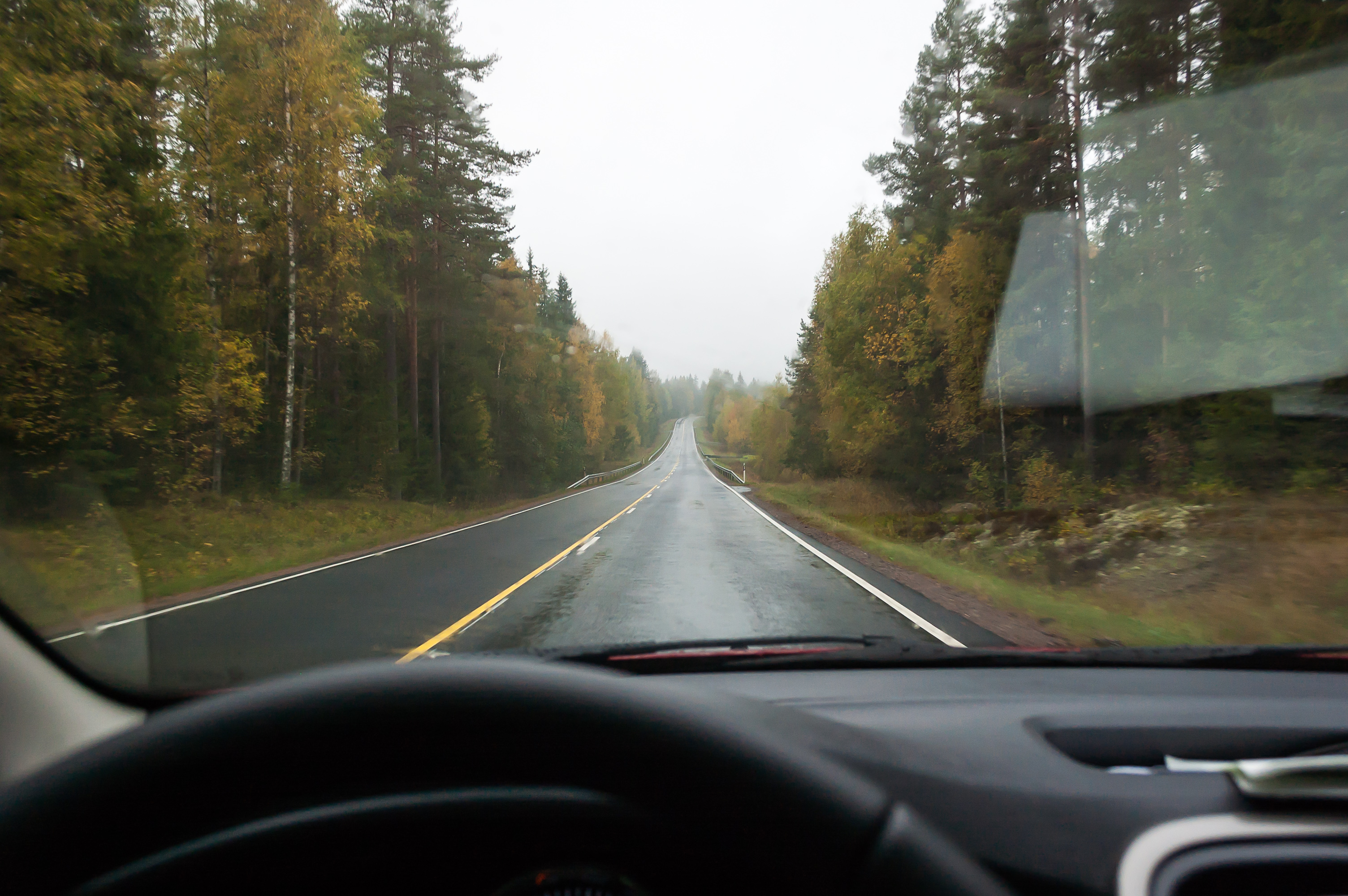 1. 4:17, 0 км: поехали! Выезжаю прямо в жуткий ливень посреди ночи. Быстро съехал на КАД (Кольцевую автодорогу) и объехал Петербург против часовой стрелки. В колеях стояла вода, ехать было очень неуютно. Где-то у съезда на Московское шоссе увидел разбитую в хлам, и, похоже, выгоревшую машину, торчавшую из отбойника. У нас тут как на войне.