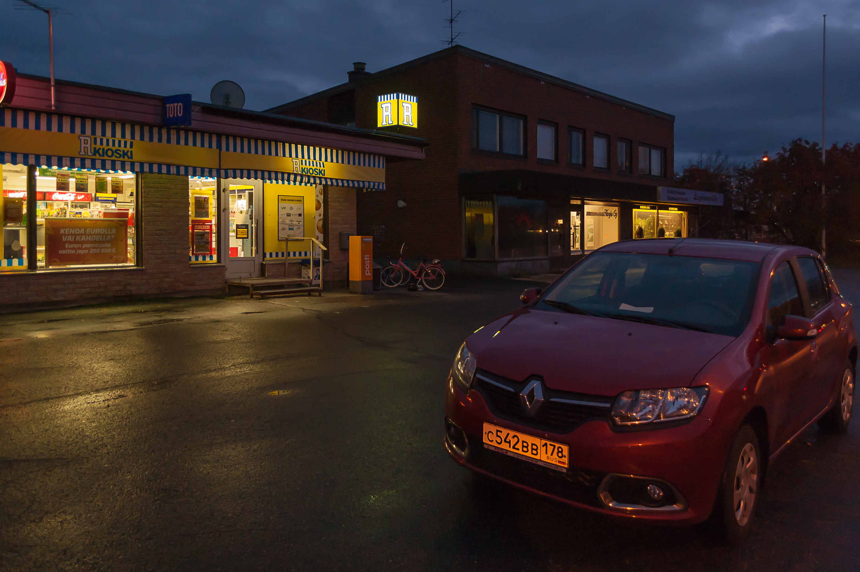Тем не менее, в Колари мне все же нужно было заехать, чтобы попасть в «Р-Киоски». «Р-Киоски» (R-Kioski) — финская сеть небольших магазинчиков, похожих на «7-11» во многих других странах. Можно купить здесь готовую еду или что-нибудь для микроволновки, пиво, газеты, и другие предметы первой необходимости. А еще можно купить предоплаченную SIM-карту для звонков и/или Интернета. Я не был до конца уверен, но похоже было, что Wi-Fi в моем коттедже нет (так и вышло), так что я решил купить SIM-карту для Интернета. Я заранее до выезда записал адрес «Р-Киоски» в Колари, и без труда нашел его с помощю навигатора. Ну, в Колари вообще заблудиться трудно, здесь по большому счету одна улица (субъективно Колари даже кажется значительно меньше Экясломполо).