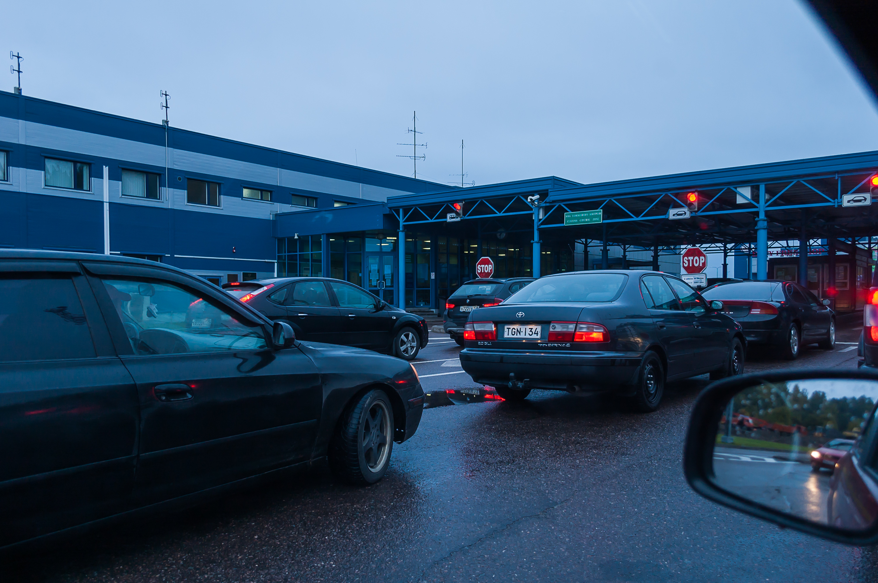5. 7:28, 230 км: протащившись через весь Светогорск за фурой-лесовозом на скорости 30 км/ч (у них тут целлюлозно-бумажная фабрика), я добрался до погранперехода. Очередей в восьмом часу утра ожидаемо не было. Между российским и финским терминалами есть круглосуточный магазин дьюти-фри, где я надеялся купить чего-нибудь выпить, но он был закрыт на полчаса, так что ждать я не стал.