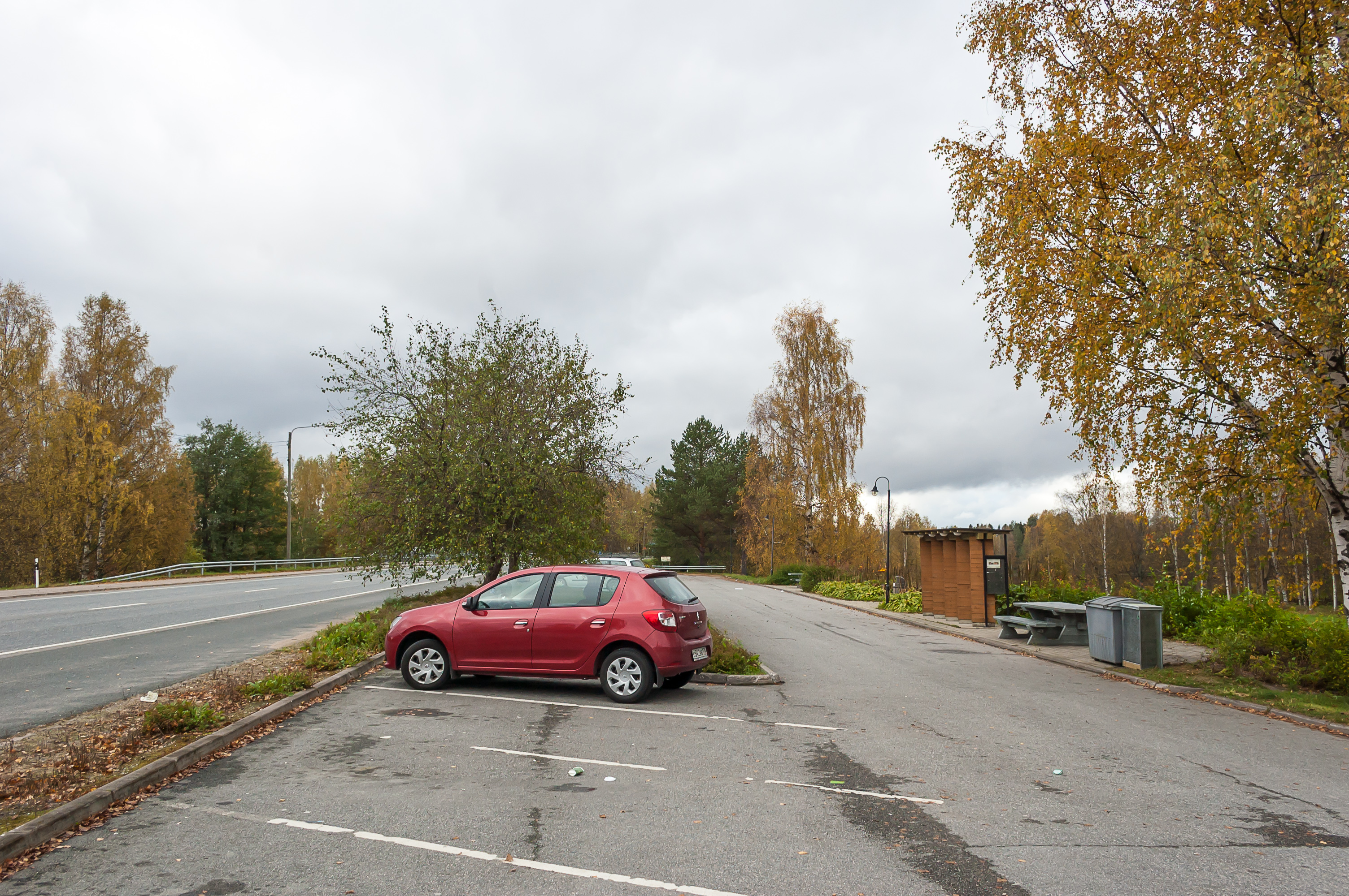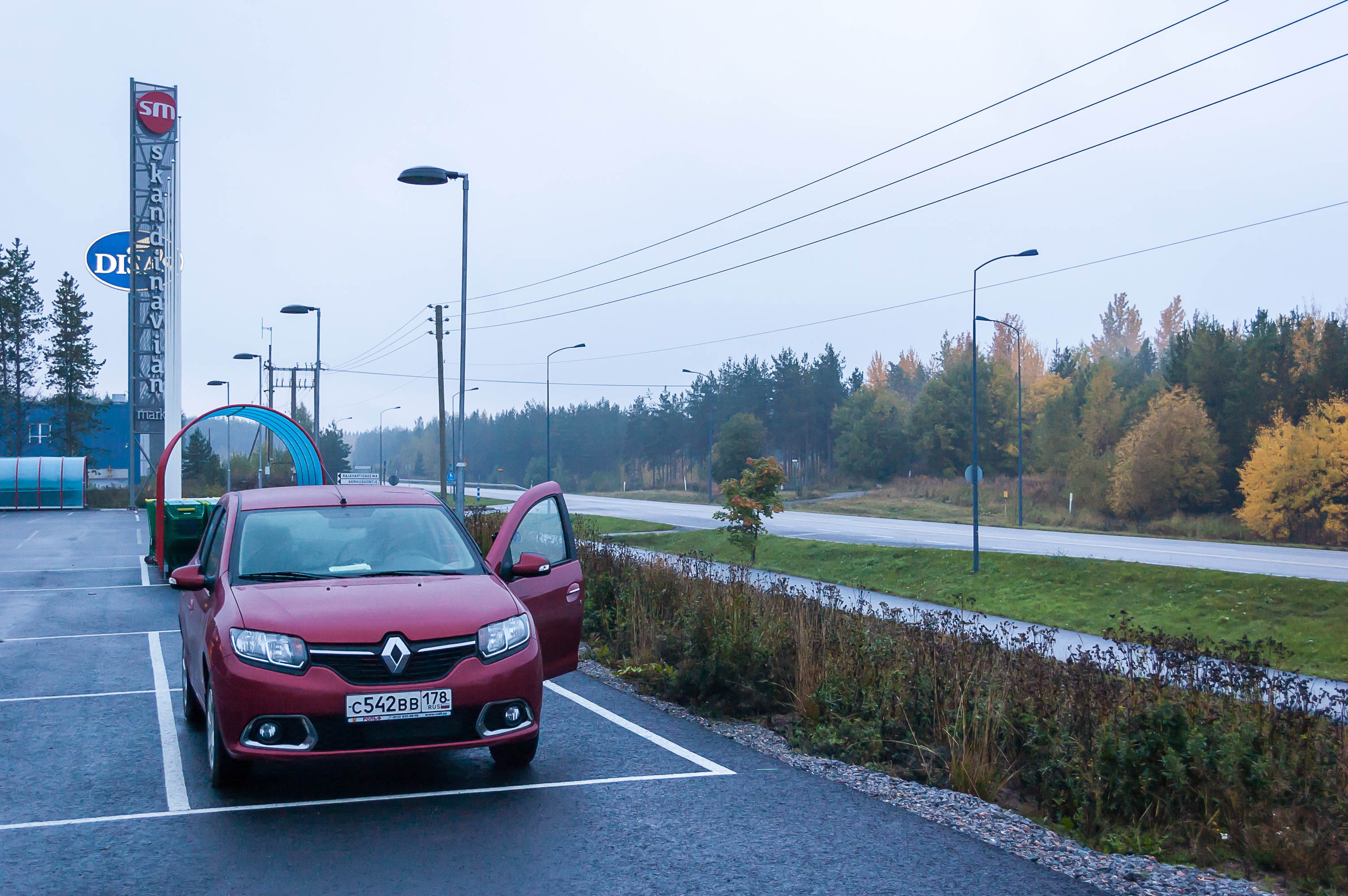 6. 7:52, 234 км: ура, Финляндия! Регион Южная Карелия, если быть точным. Я сразу же заехал на парковку супермаркета «Скандинавия-Маркет», совсем рядом с той «Лапландией», и вышел размять ноги. Спустя несколько минут из динамиков над входом в супермаркет понеслась какая-то финская попса, и работник вышел отпереть двери; у них с восьми утра часы работы. Я сходил там в туалет и поехал дальше.