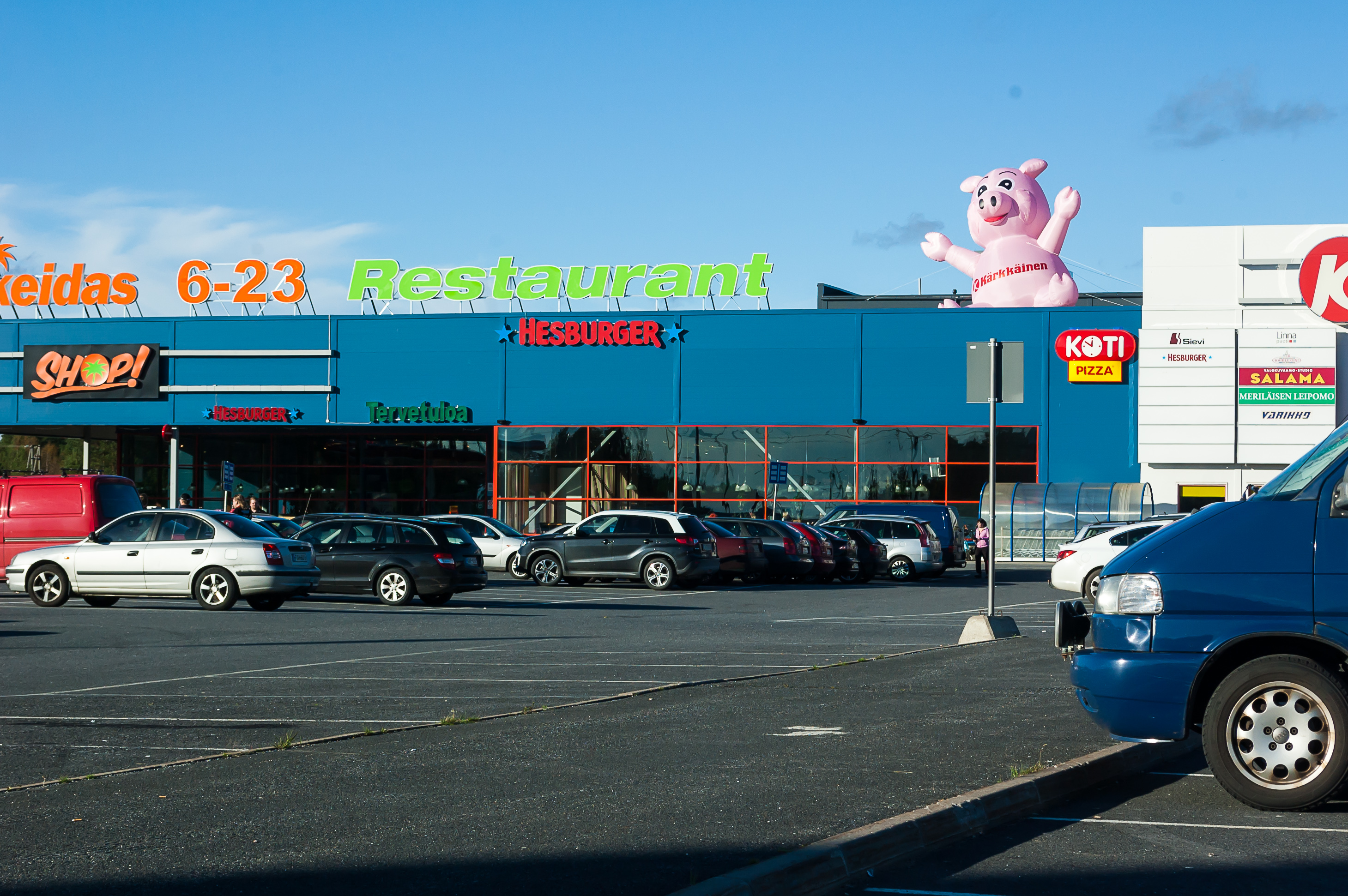 36. 15:46, 797 км: бензин, которым я заправился уже около 600 км назад в России, стал потихоньку подходить к концу, так что я остановился на заправке на парковке какого-то супермаркета с надувной свиньей на крыше. Интересно, можно ли почувствовать разницу между российским и финским бензином? Финны в свой 10% спирта подливают, для экологии или что-то в этом роде, но при езде это вроде вообще никак не ощущается.