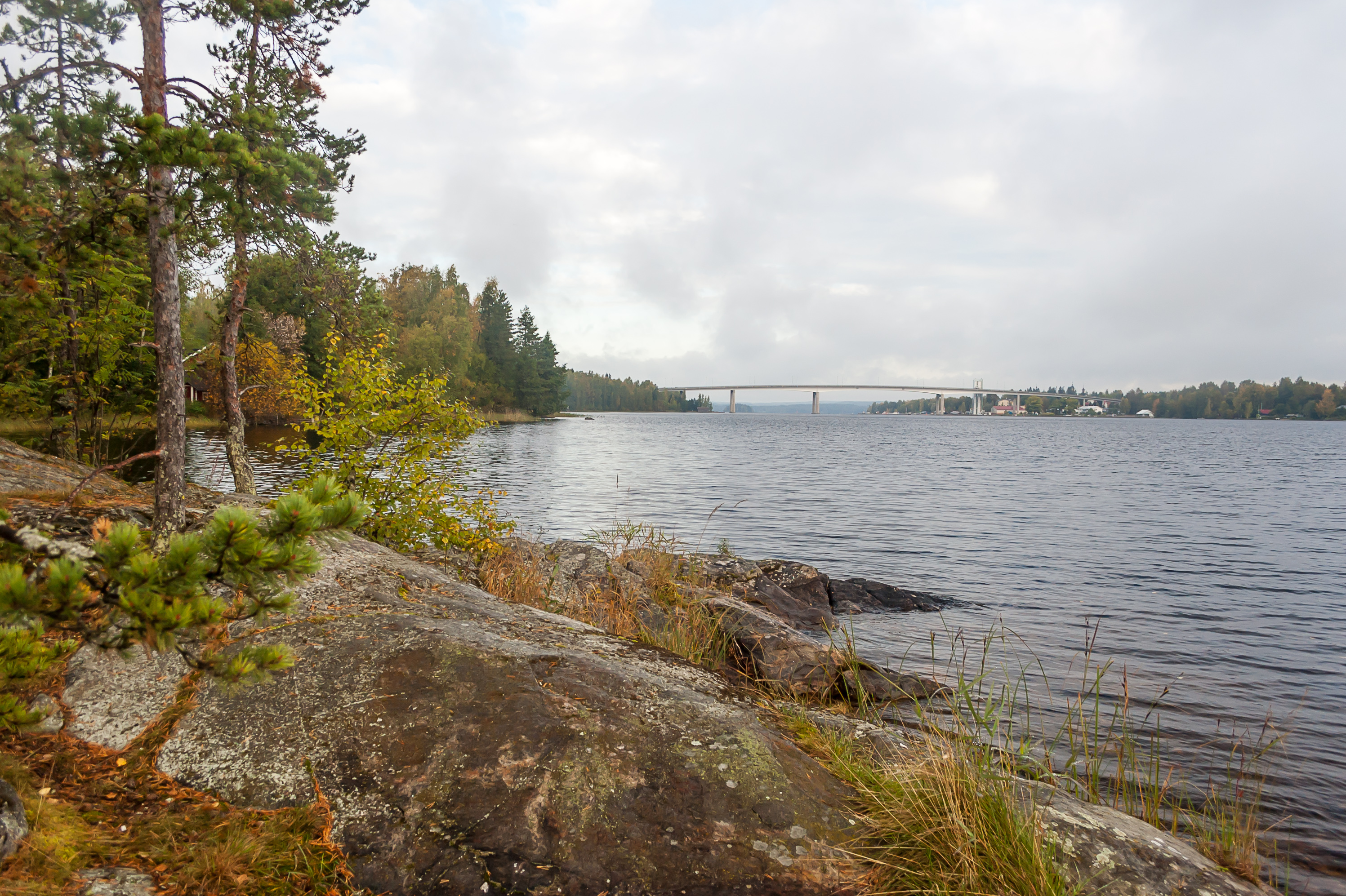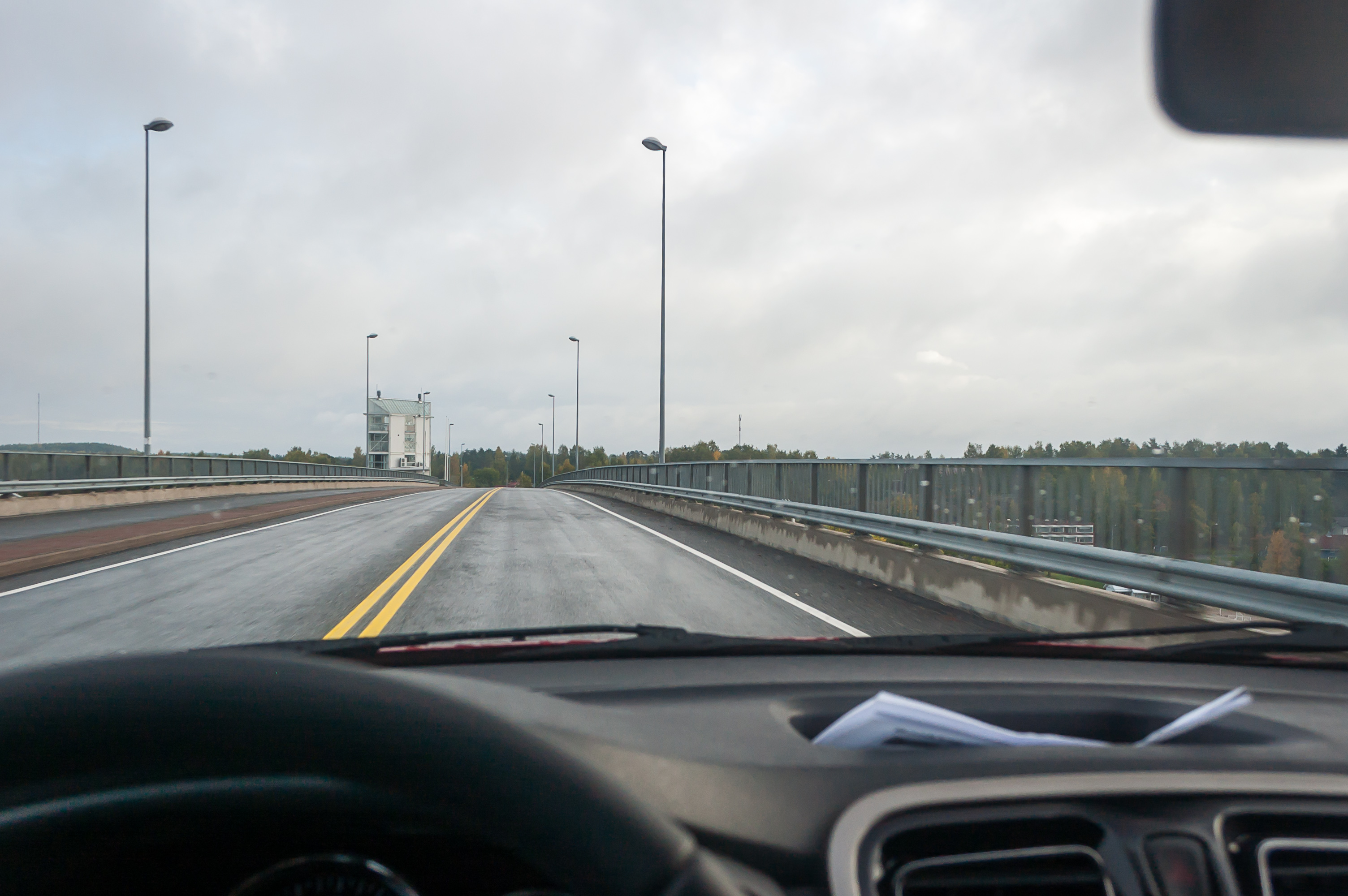 13. 9:01, 299 км: еще одна стоянка на той же дороге, с видом на Пуумальский мост. Мост на трассе 62 кажется совершенно огромным на фоне крошечного городка Пуумала (Puumala). Это четвертый по длине мост Финляндии (780 м). Он построен в 1995 году, и заменил последнюю паромную переправу на сети национальных и главных (одно- и двузначных) дорог.