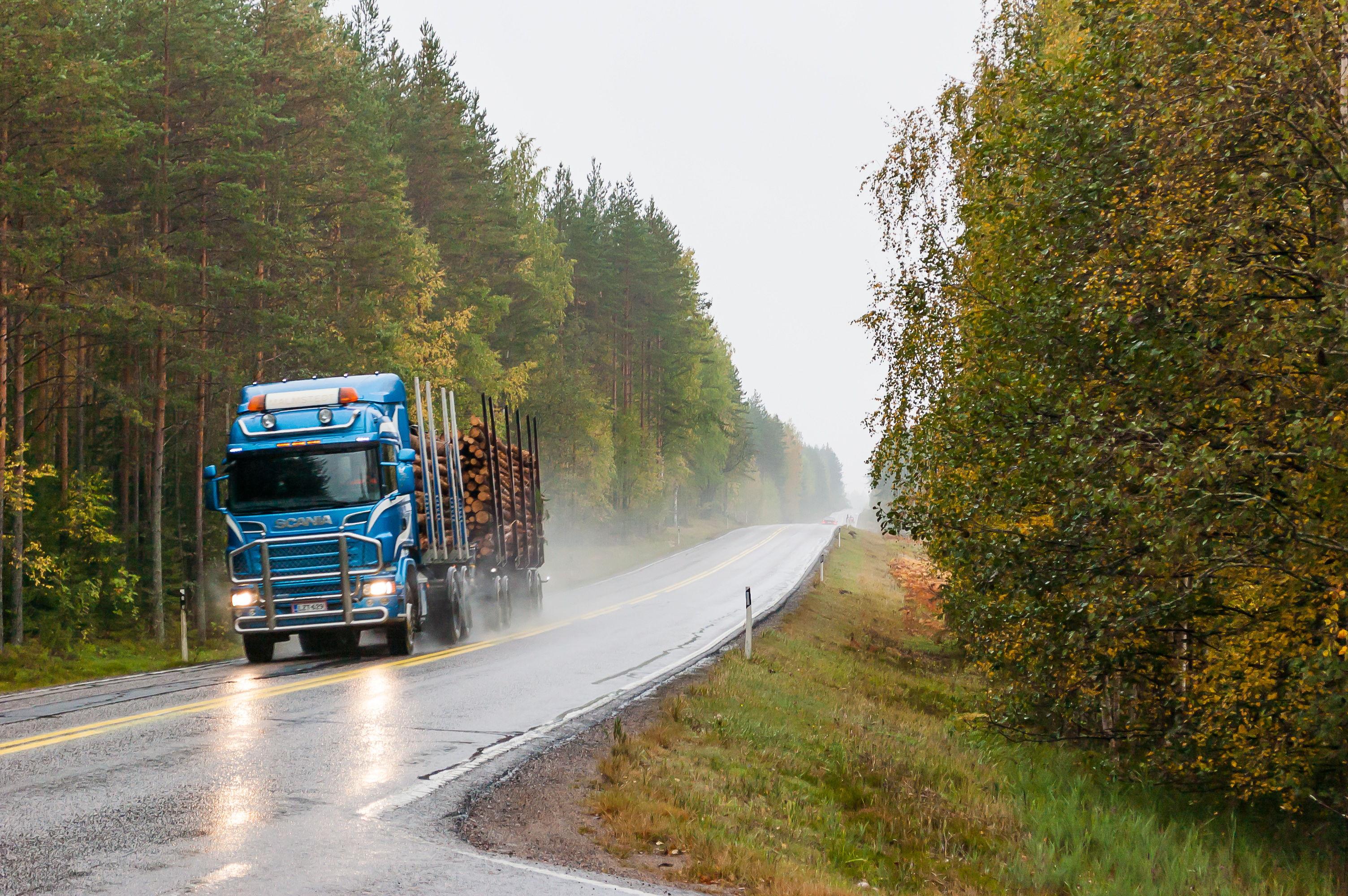 11. Финский лесовоз проезжает по трассе 62. В Финляндии сильно бросается в глаза, что многие машины и грузовики ставят силовые бамперы-«кенгурятники» и/или дополнительные фары-прожекторы. В России и то, и другое запрещено. Когда финская фура с дальним светом ночью едет, это больше на поезд похоже. По мере движения на север эти модификации попадаются все чаще.