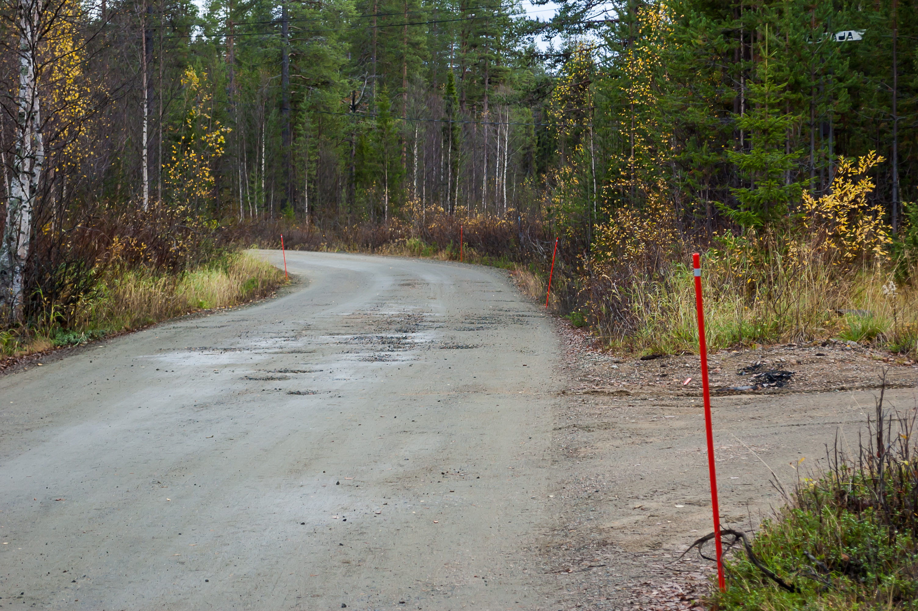 32. В Лапландии даже у самых мелких грунтовых дорожек ставят такие вот оранжевые светоотражающие колышки, чтобы очертания дороги было видно, даже если ее полностью заметет снегом. На юге Финляндии иногда такие тоже попадаются, но куда как реже.