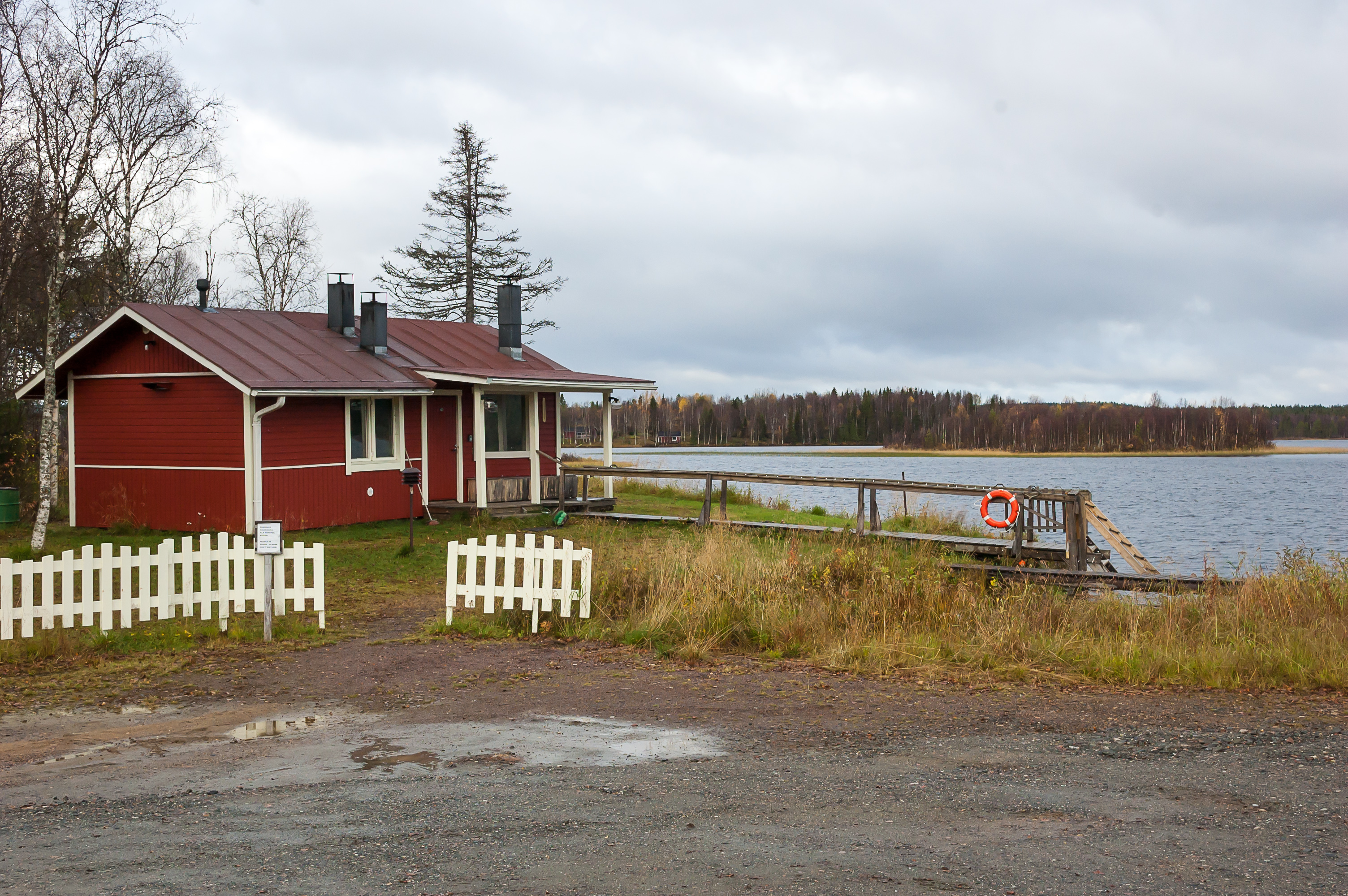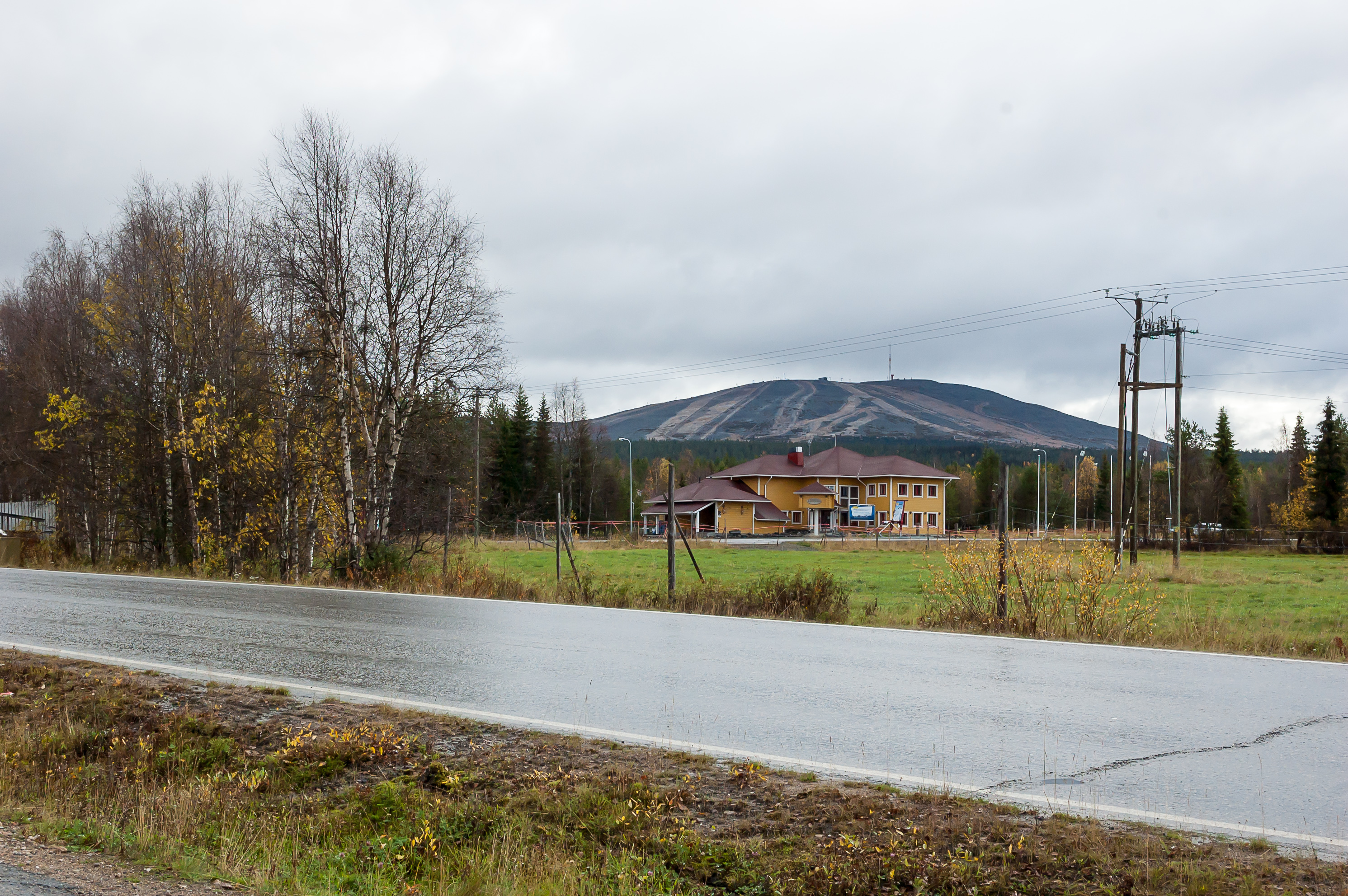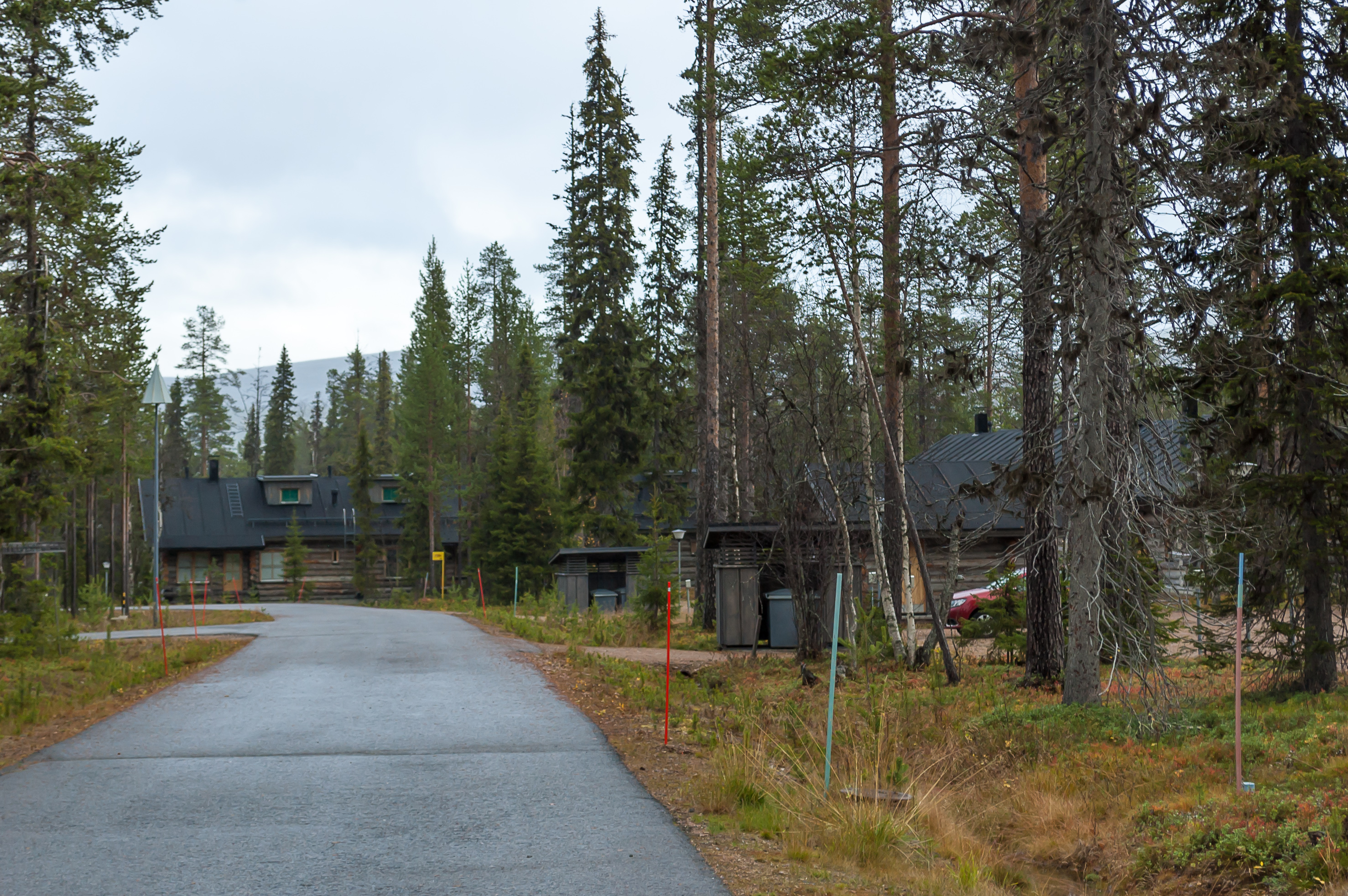 28. Это здание выглядит более похожим на традиционную гостиницу, чем на коттеджи, но народу здесь тоже, похоже, особо нет. Я обычно стараюсь фотографировать так, чтобы в кадре было поменьше людей, но вы, наверное, заметили, что на этих фотографиях, не считая «Йоунин Кауппас», вообще нет ни единой души. Поселок ждет лыжного сезона. Тем не менее, я все же изредка встречал немногочисленных живых людей, и в поселке, и в окрестностях — идущих в поход, сидящих на пикниках, катающихся на велосипедах; а в «Йоунин Кауппас» для мертвого-то сезона вообще весьма людно было. Я обратил внимание, что абсолютно все машины, которые я здесь видел, были с финскими номерами; всего одно исключение встретилось, у чьего-то частного дома машина со шведскими номерами припаркована. Так что осенью здесь, видимо, только местные да редкие финские же туристы.