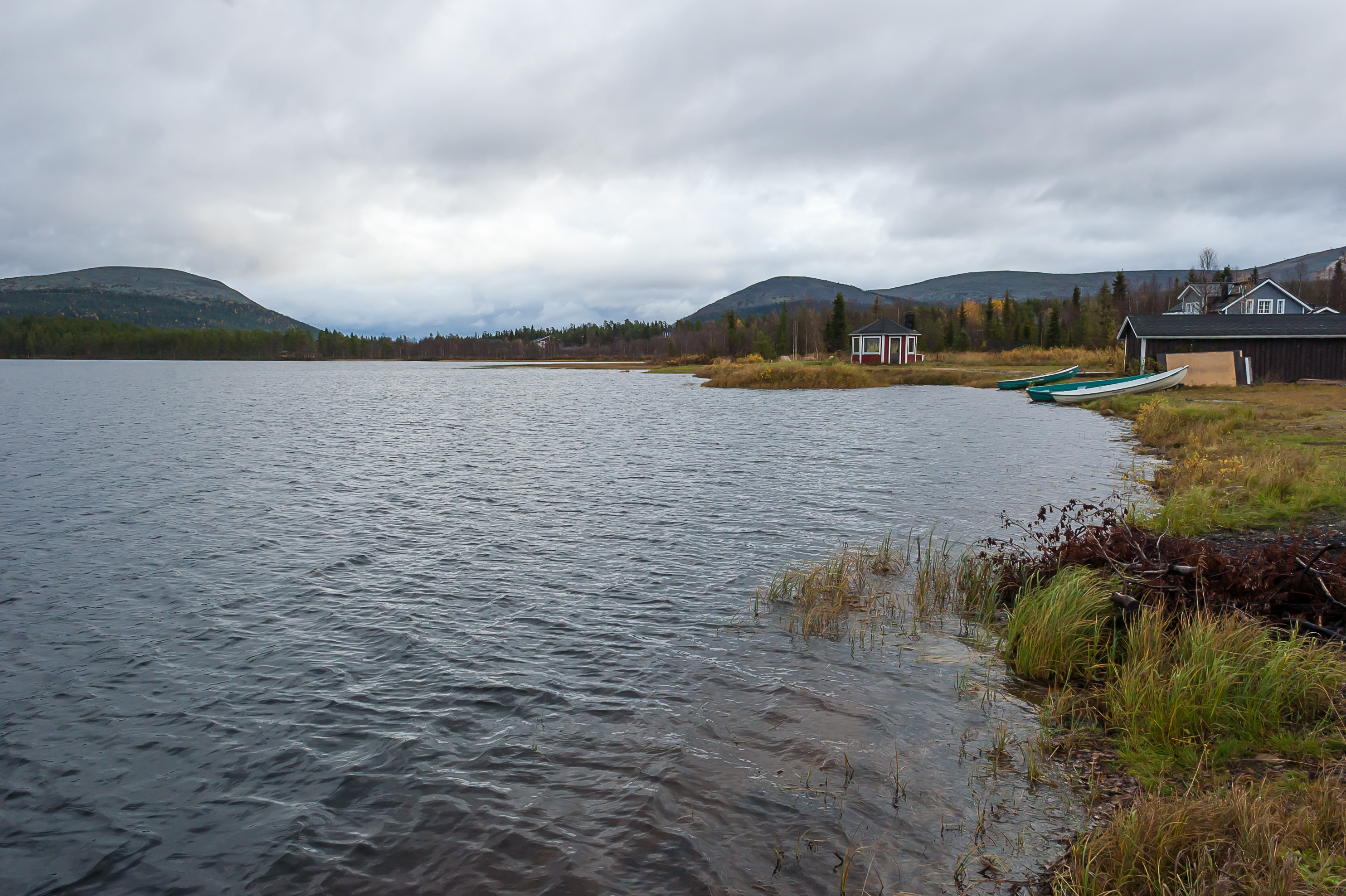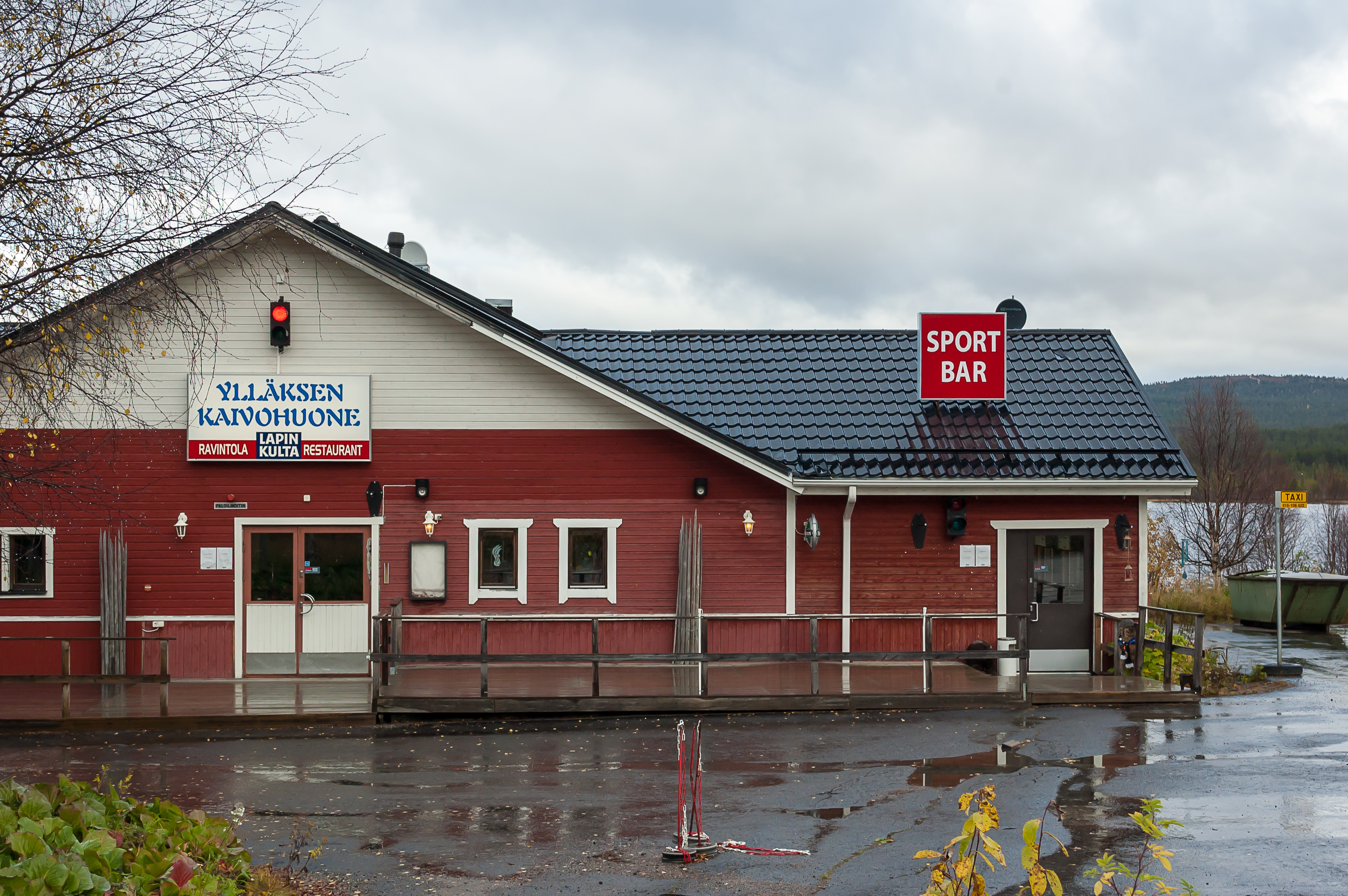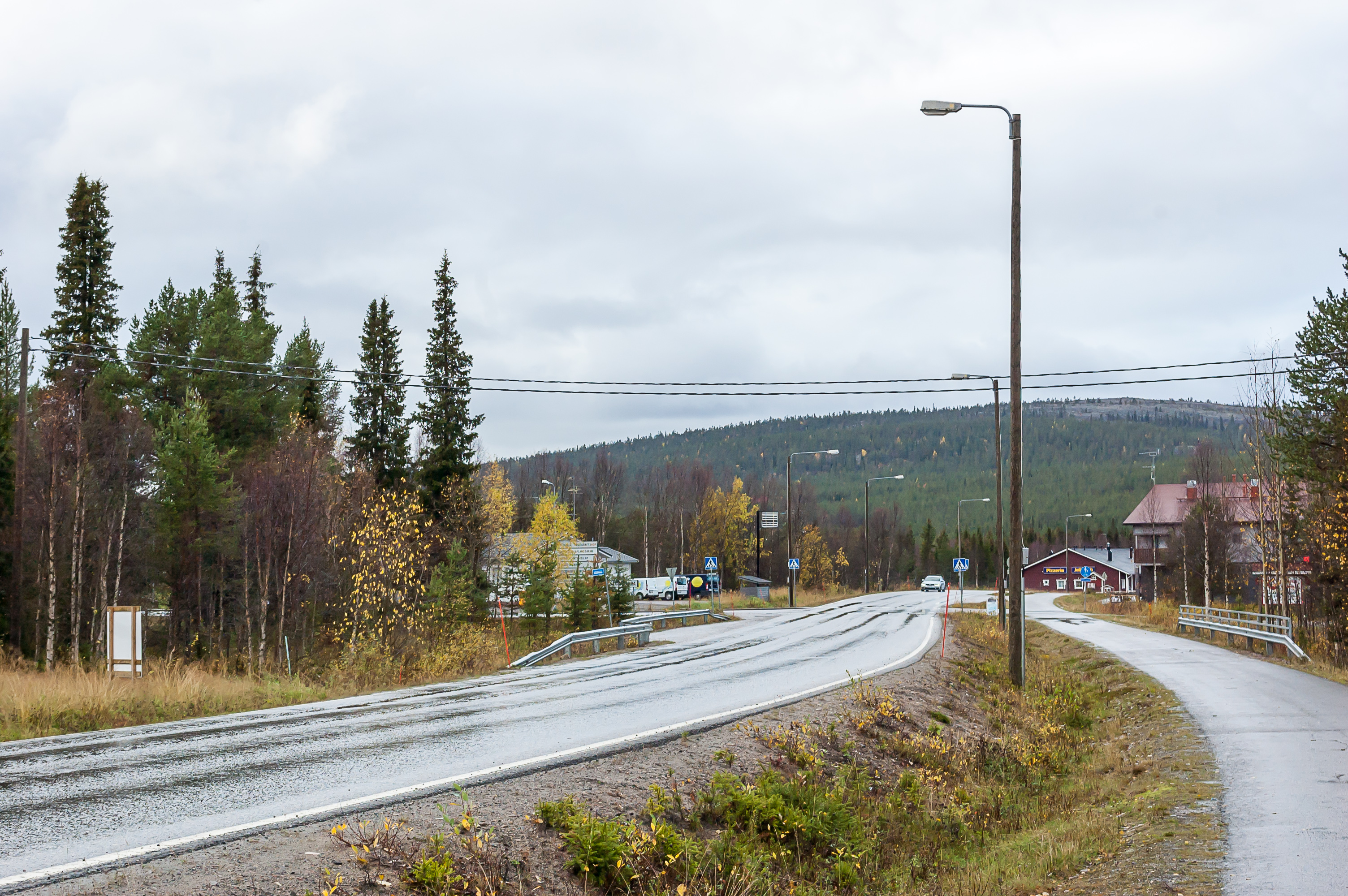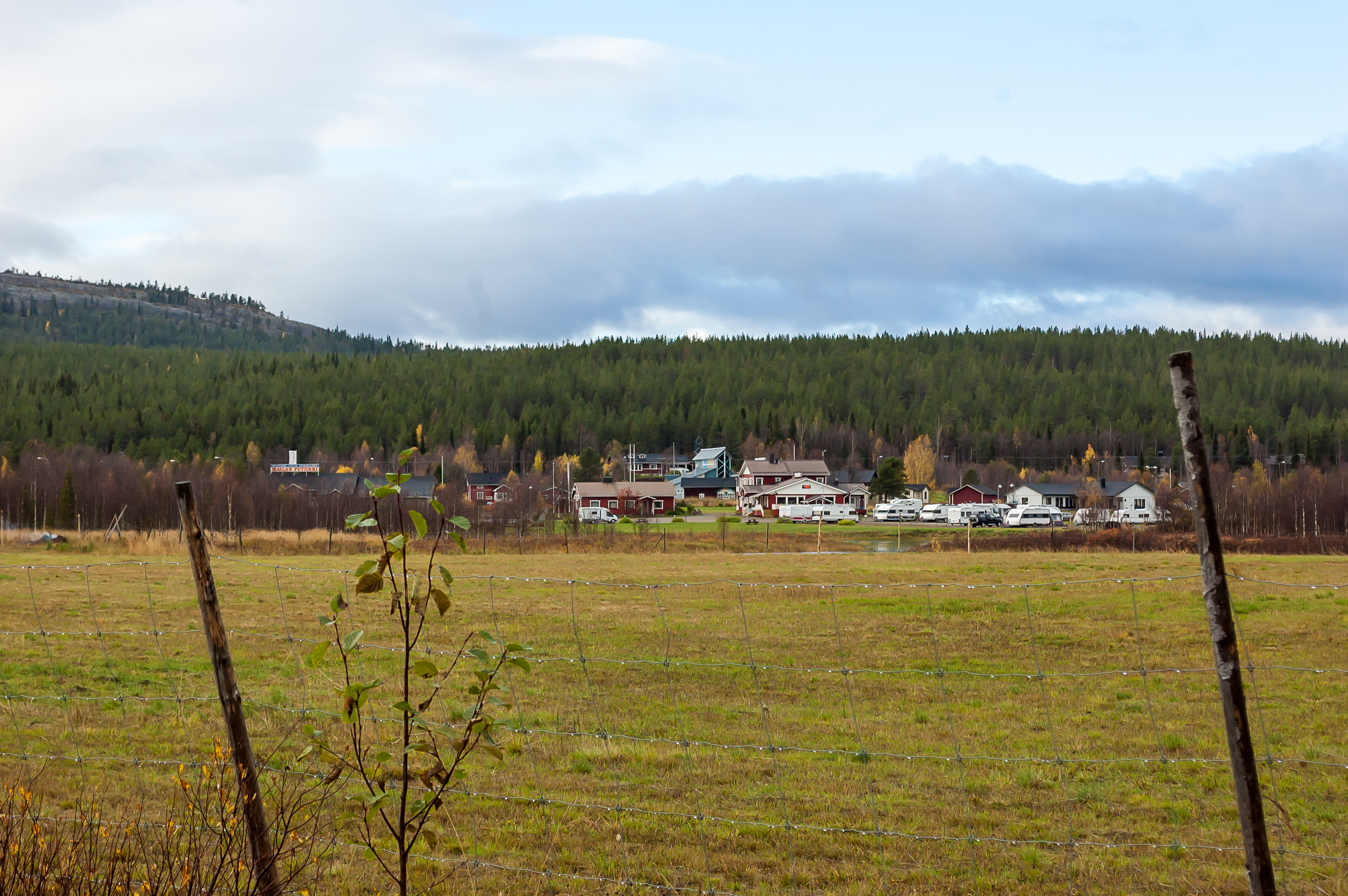 28. Это здание выглядит более похожим на традиционную гостиницу, чем на коттеджи, но народу здесь тоже, похоже, особо нет. Я обычно стараюсь фотографировать так, чтобы в кадре было поменьше людей, но вы, наверное, заметили, что на этих фотографиях, не считая «Йоунин Кауппас», вообще нет ни единой души. Поселок ждет лыжного сезона. Тем не менее, я все же изредка встречал немногочисленных живых людей, и в поселке, и в окрестностях — идущих в поход, сидящих на пикниках, катающихся на велосипедах; а в «Йоунин Кауппас» для мертвого-то сезона вообще весьма людно было. Я обратил внимание, что абсолютно все машины, которые я здесь видел, были с финскими номерами; всего одно исключение встретилось, у чьего-то частного дома машина со шведскими номерами припаркована. Так что осенью здесь, видимо, только местные да редкие финские же туристы.