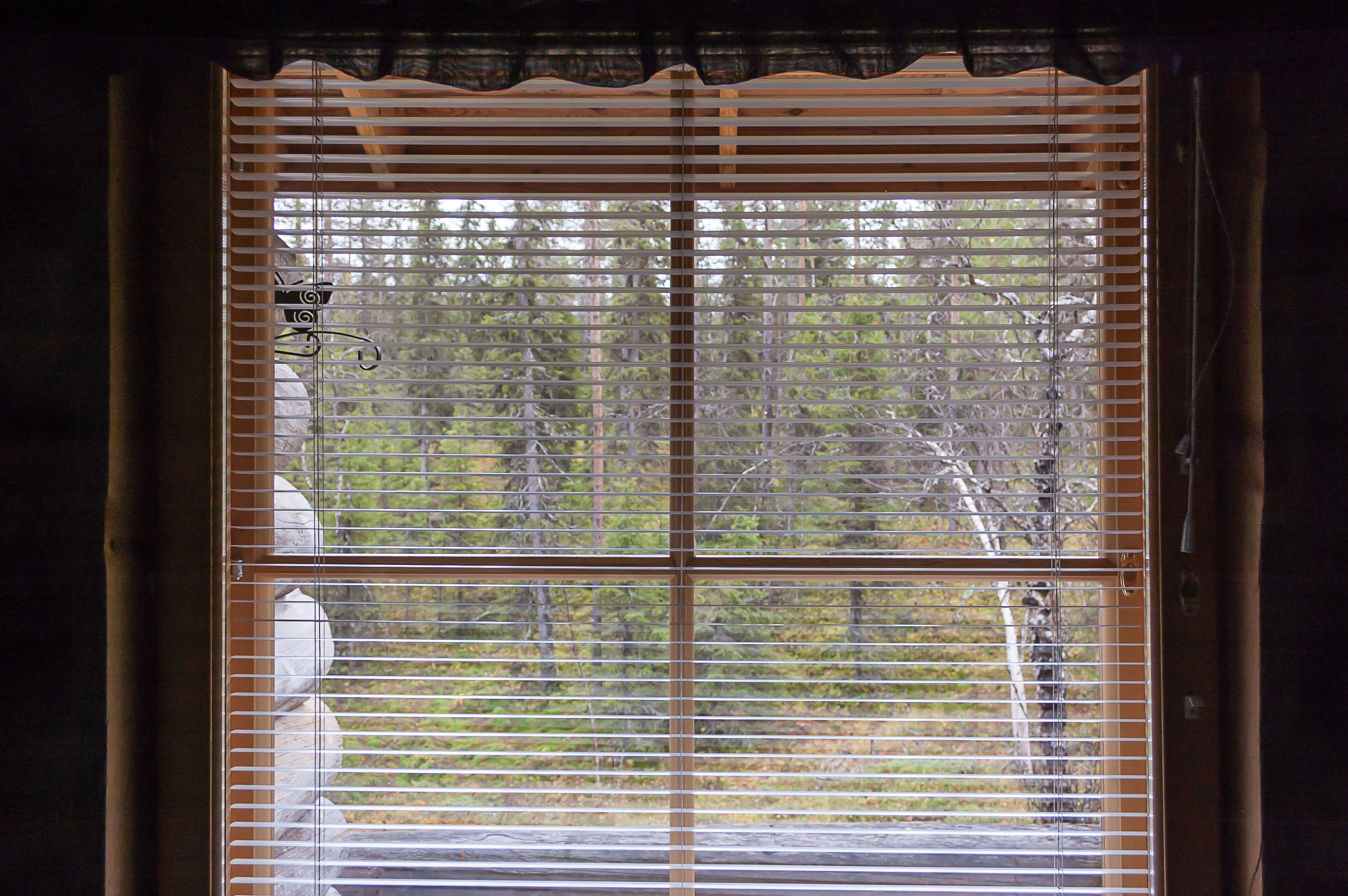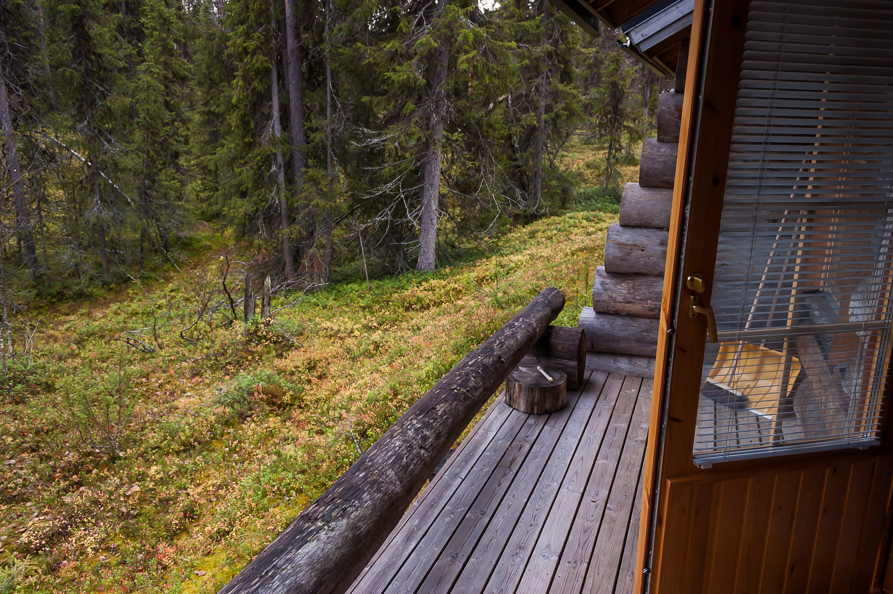 Окна и дверь выходят на маленькую веранду, которая смотрит прямо на большой кусок сурового вида елового леса.