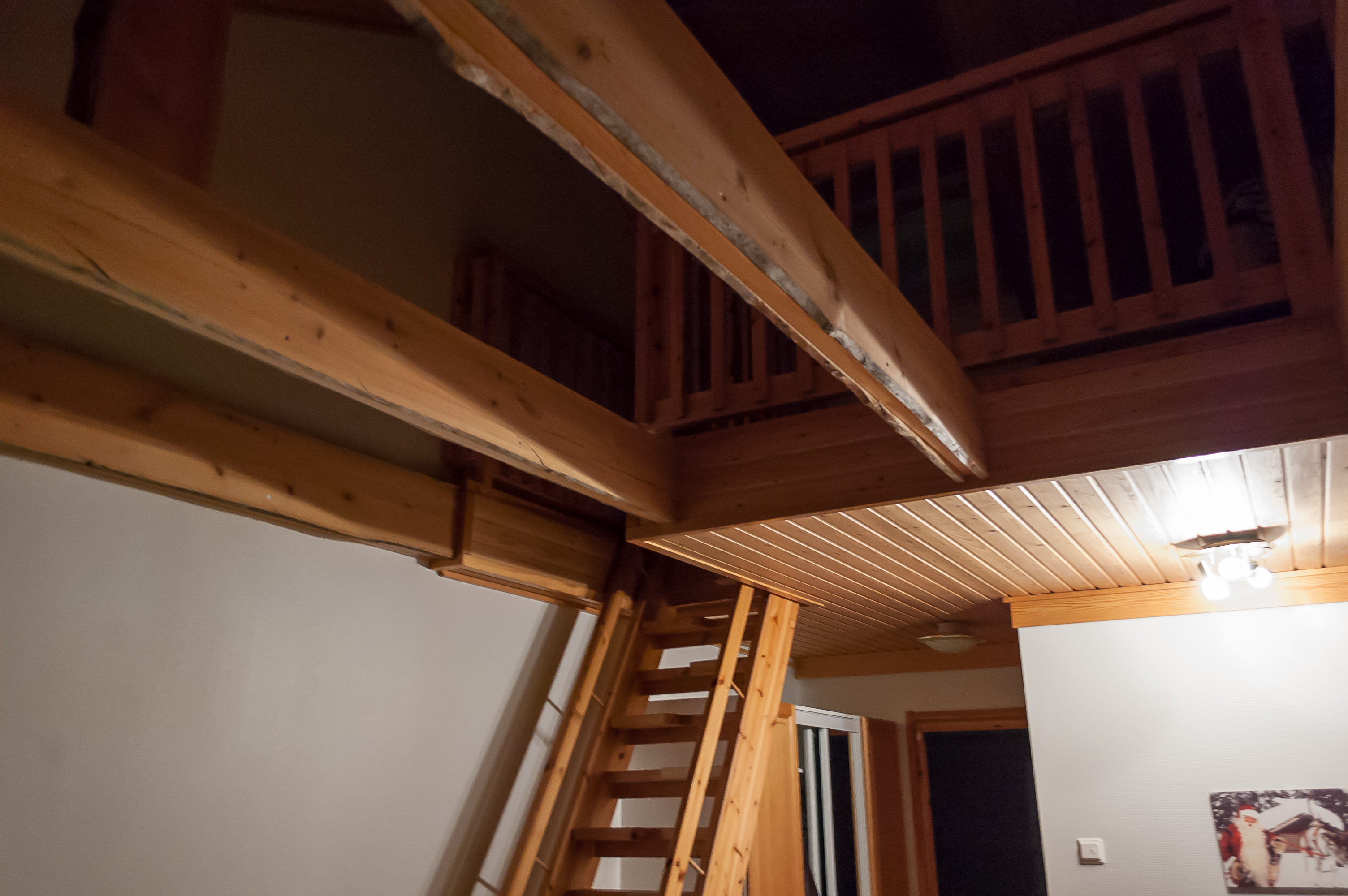 5. Лестница на мансарду. Мансардный этаж по площади вдвое меньше основной комнаты, и просто нависает над ней, как балкон. Благодаря этому домик, несмотря на скромную в общем-то площадь, кажется очень просторным.