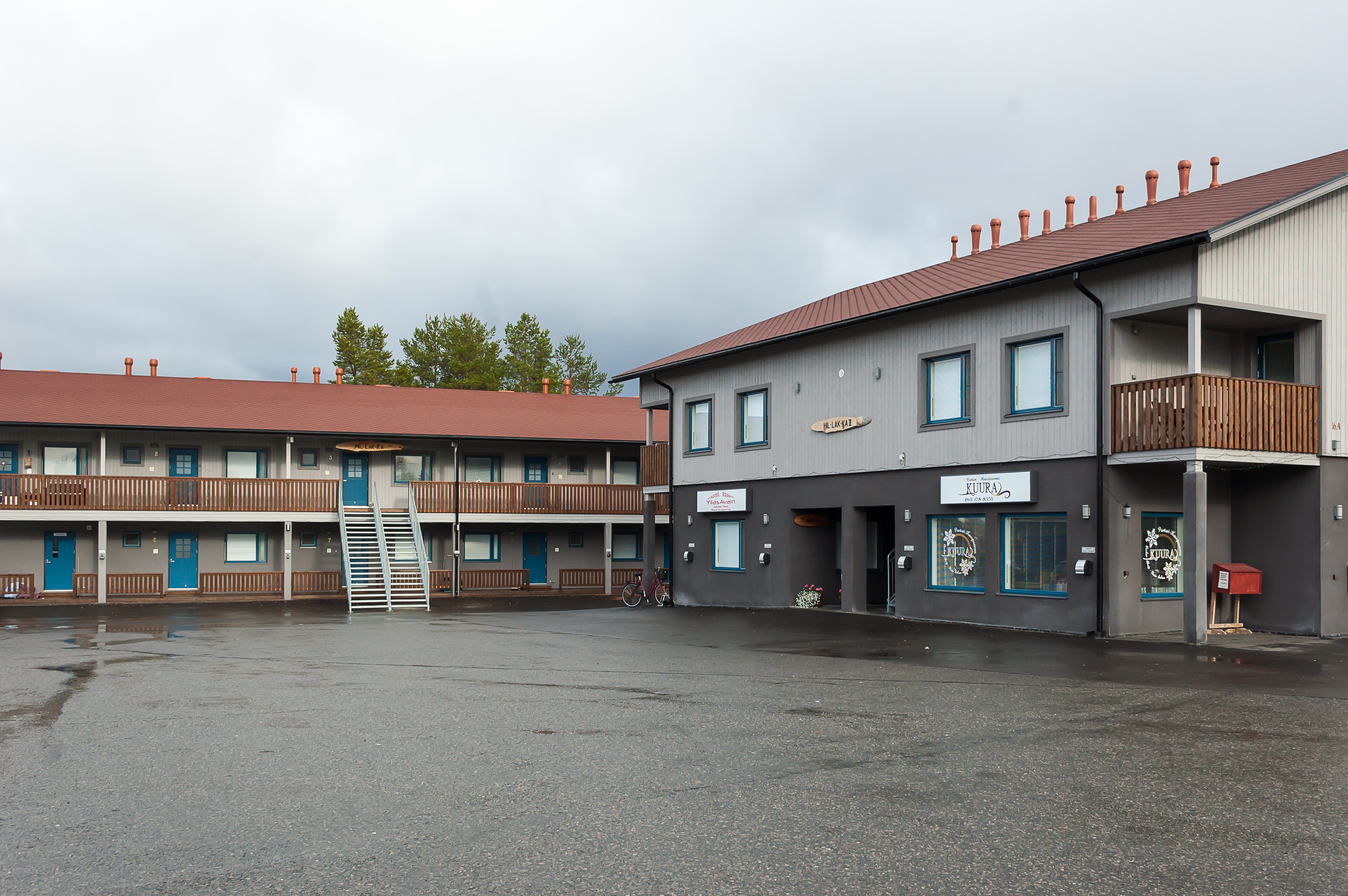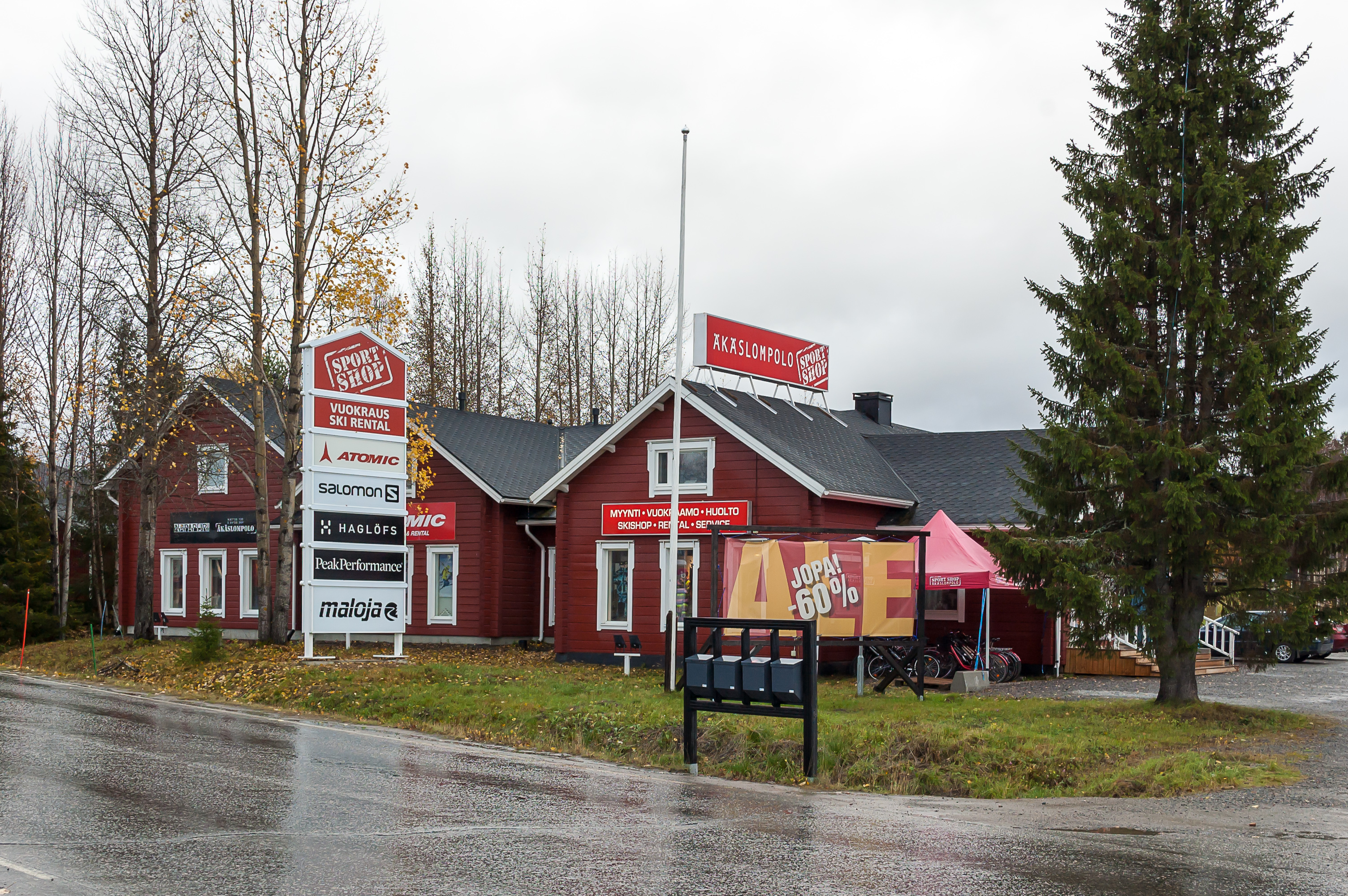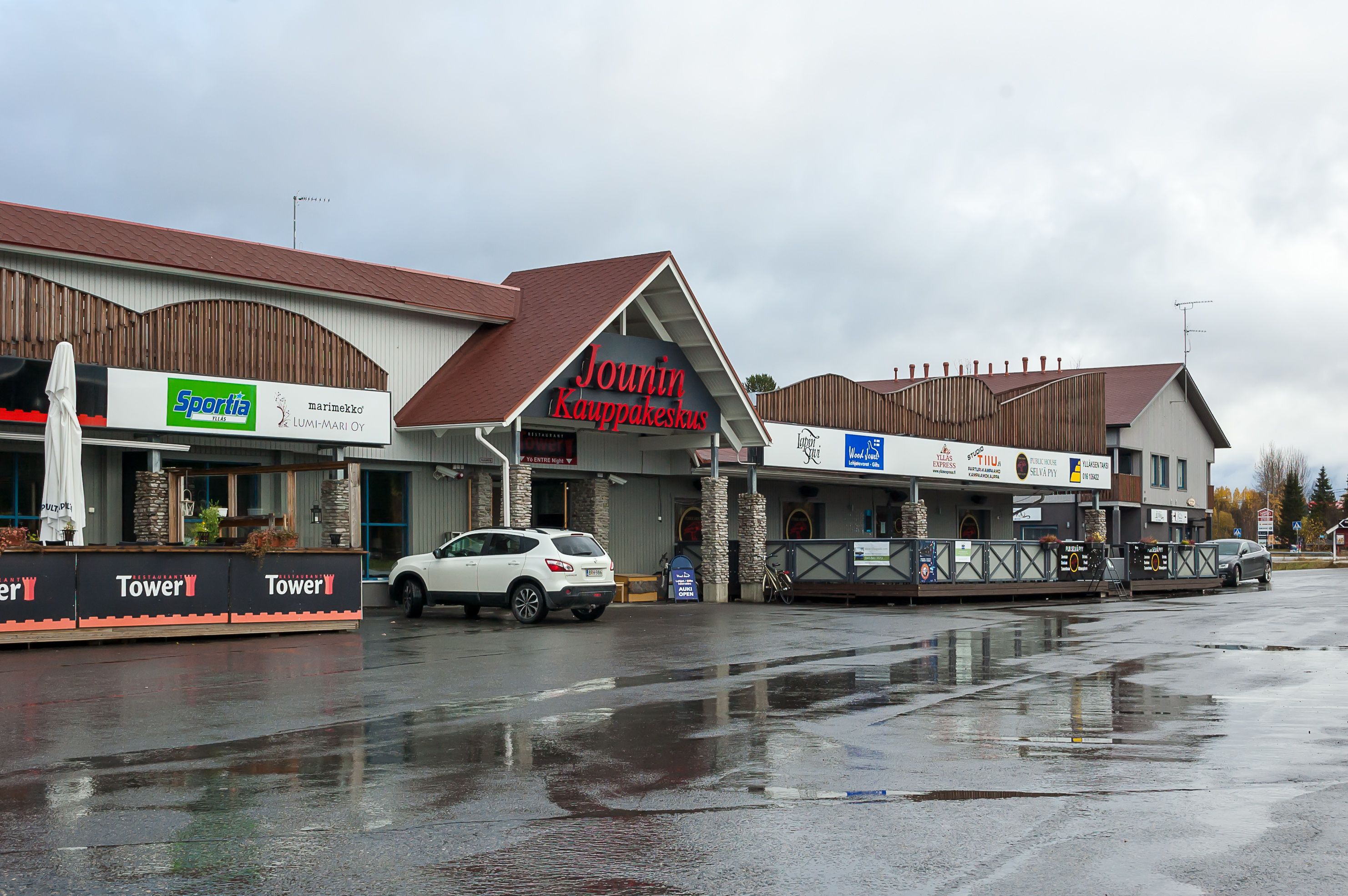 19. «Йоунин Кауппас» (Jounin Kauppas, фин. Магазин Йоуни? Йоуни — мужское имя) служит естественным центром притяжения для всего Экясломполо. Он состоит из двух зданий; в одном — гипермаркет «К-Маркет» и алкогольный магазин «Алко», а в другом — несколько небольших магазинов сувениров, спортивного снаряжения и одежды. В обоих зданиях также есть по паре баров/ресторанов. Меня обрадовало, что во втором (на фото) здании в коридоре можно сесть на диванчик, и там ловится бесплатный Wi-Fi из одного из баров; благодаря ему я в дальнейшем смог хотя бы отправлять письма по работе и родителям.