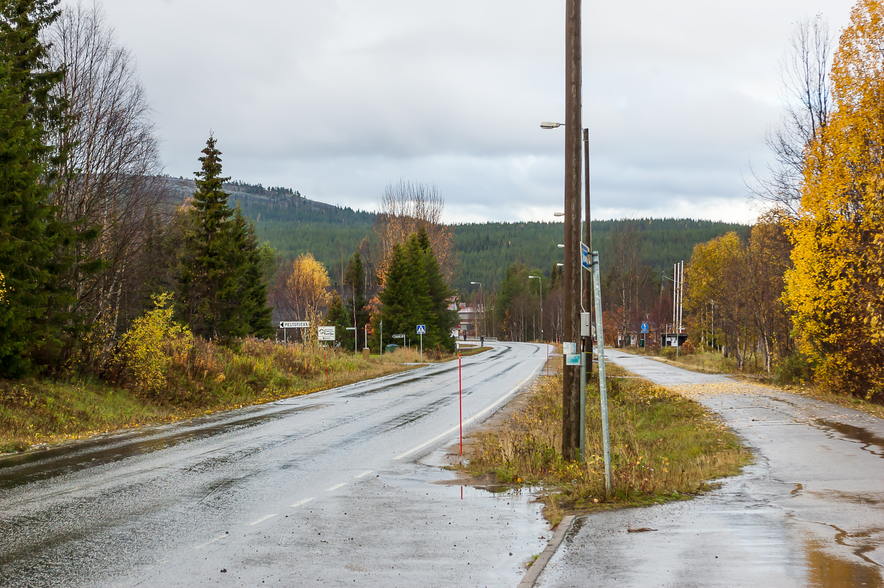 15. А это — главная улица Экясломполо, под названием Тунтуринтие (Tunturintie). Слово tunturi и означает «фьельд» — невысокую сопку с плоской голой вершиной. Слово «тундра» как раз и происходит от слова «тунтури», хотя на фьельдах Экясломполо растительности, похожей на тундру, маловато и только на большой высоте.