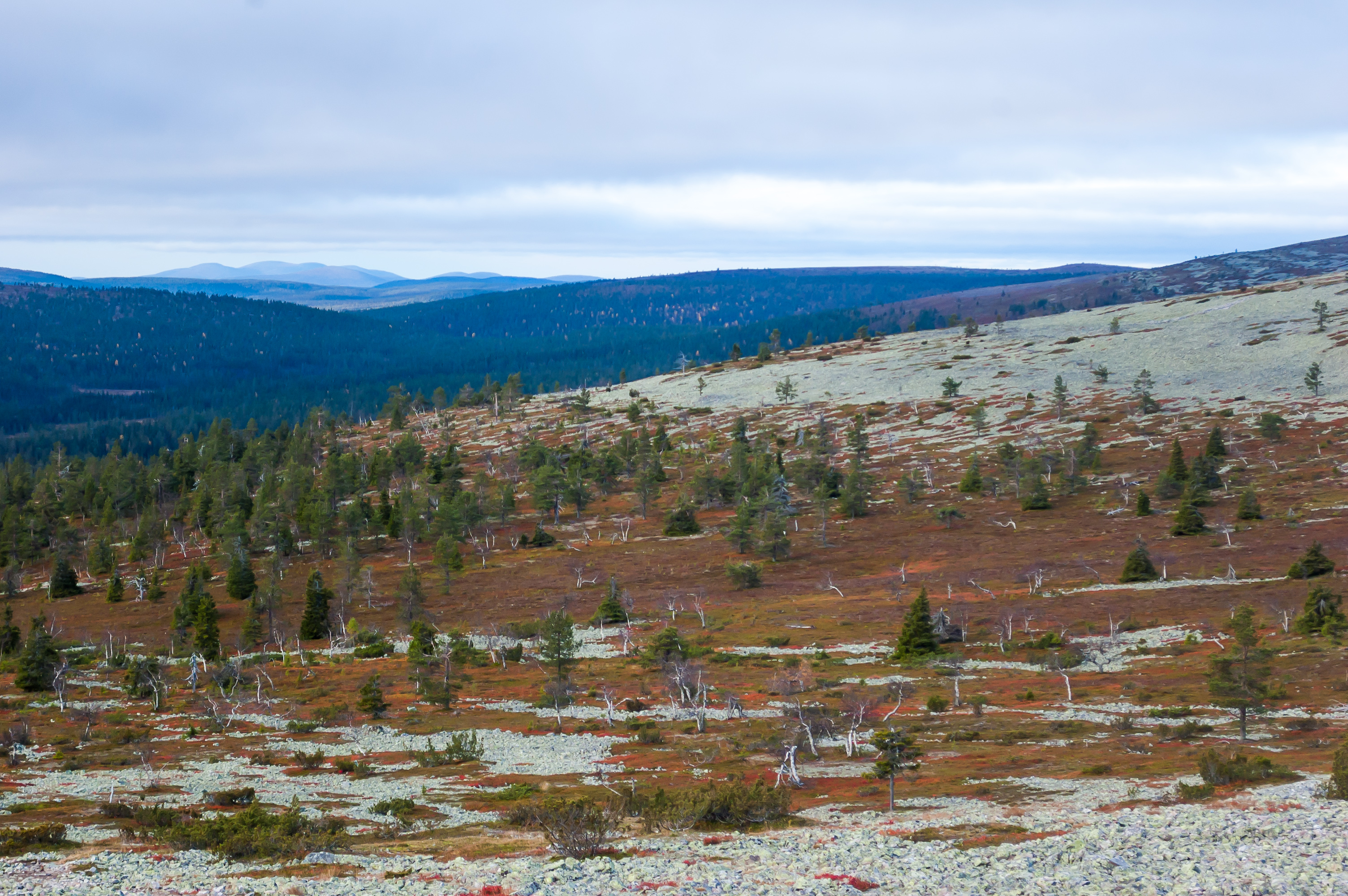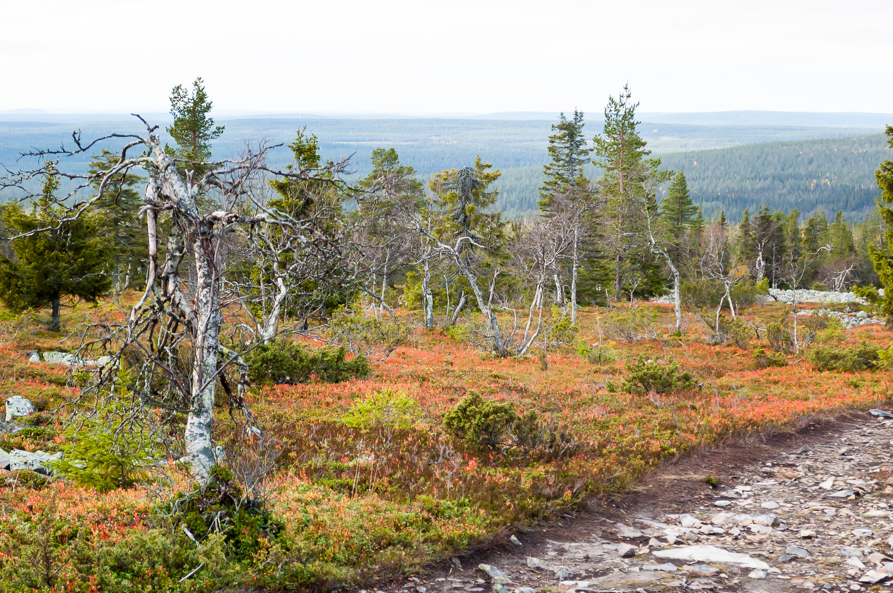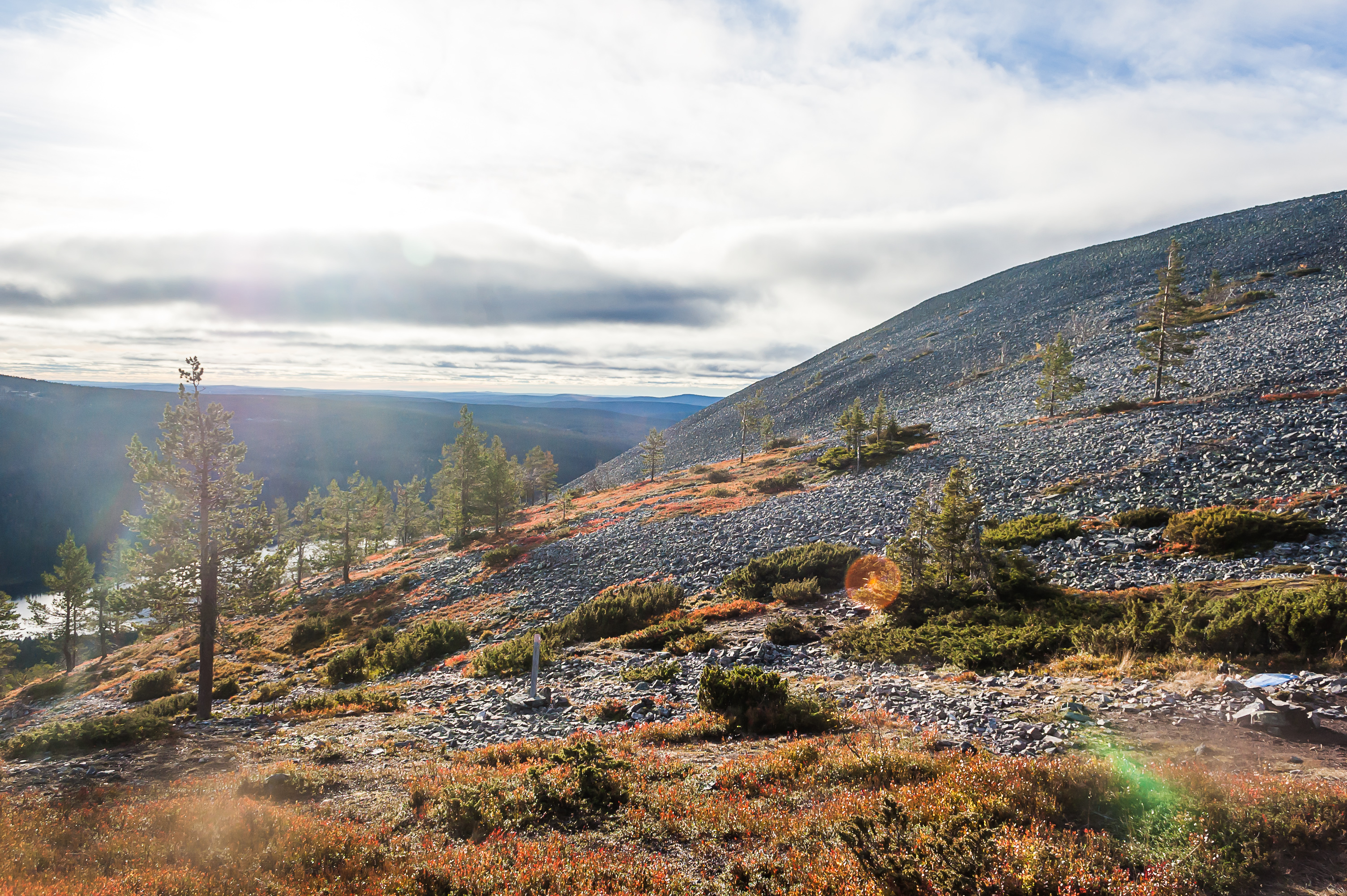 22. К тому времени, как крутая часть подъема заканчивалась, из-за облаков выглянуло солнце. Как вы уже могли заметить, погода в течение моего лапландского отпуска была довольно так себе. Не холодно, но почти все время пасмурно, и моросило периодически. На самом деле это моя любимая погода, но для фотографий она, конечно, не очень подходит. Так что повезло мне, что в подходящий момент солнце показалось.