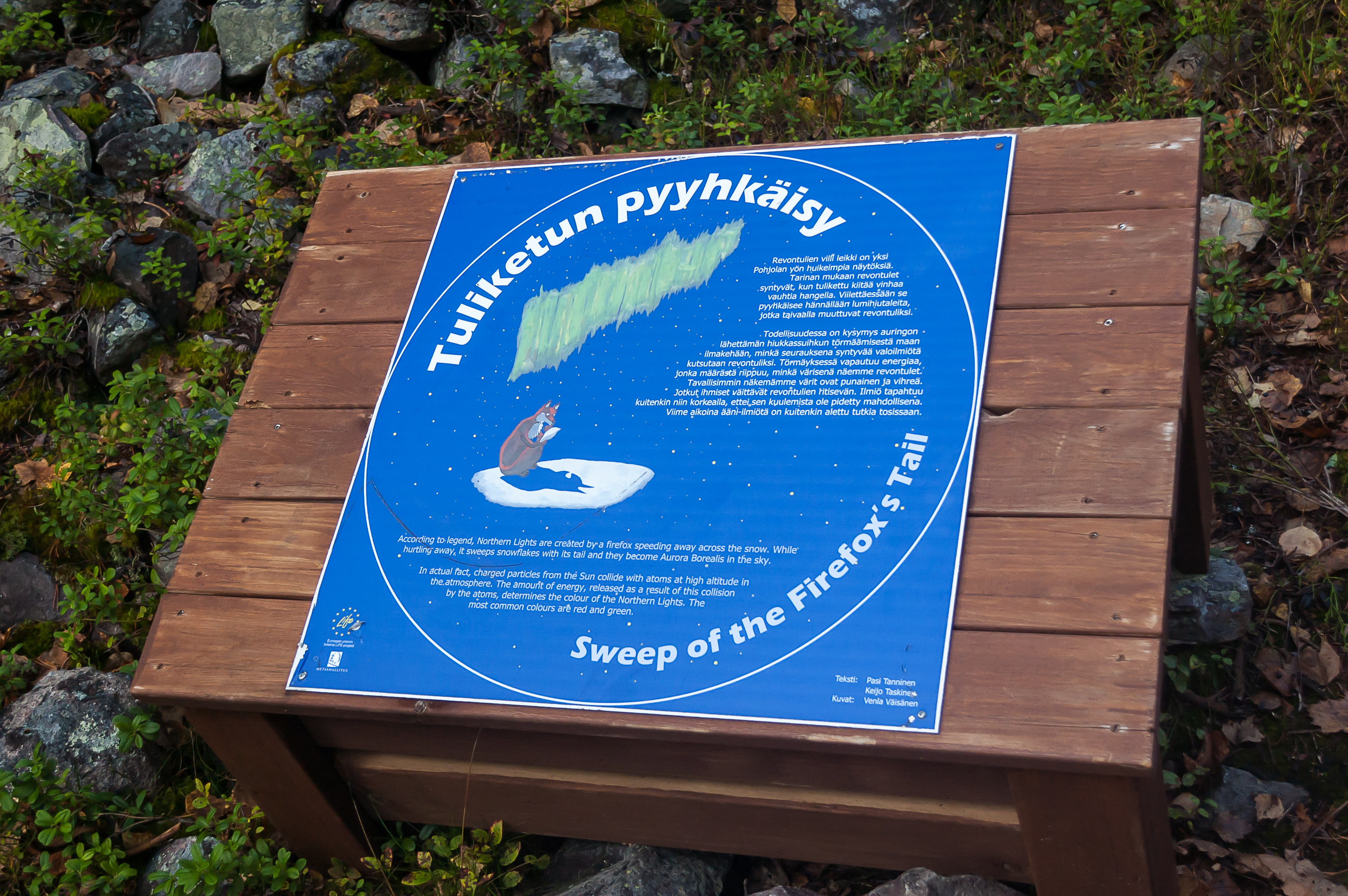 13. После кафе тропа Хиллаполку поворачивает дальше вдоль берега озера, а в гору на фьельд Кесянки начинает забираться уже тропа Тяхтиполку. Не знаю точно, почему ее назвали «Звездная тропа», но вдоль нее расставлены таблички с фактами на астрономическую тематику. Они были переведены на английский, но ничего особо интересного в них не было, на уровне детской книжки «Я познаю мир».