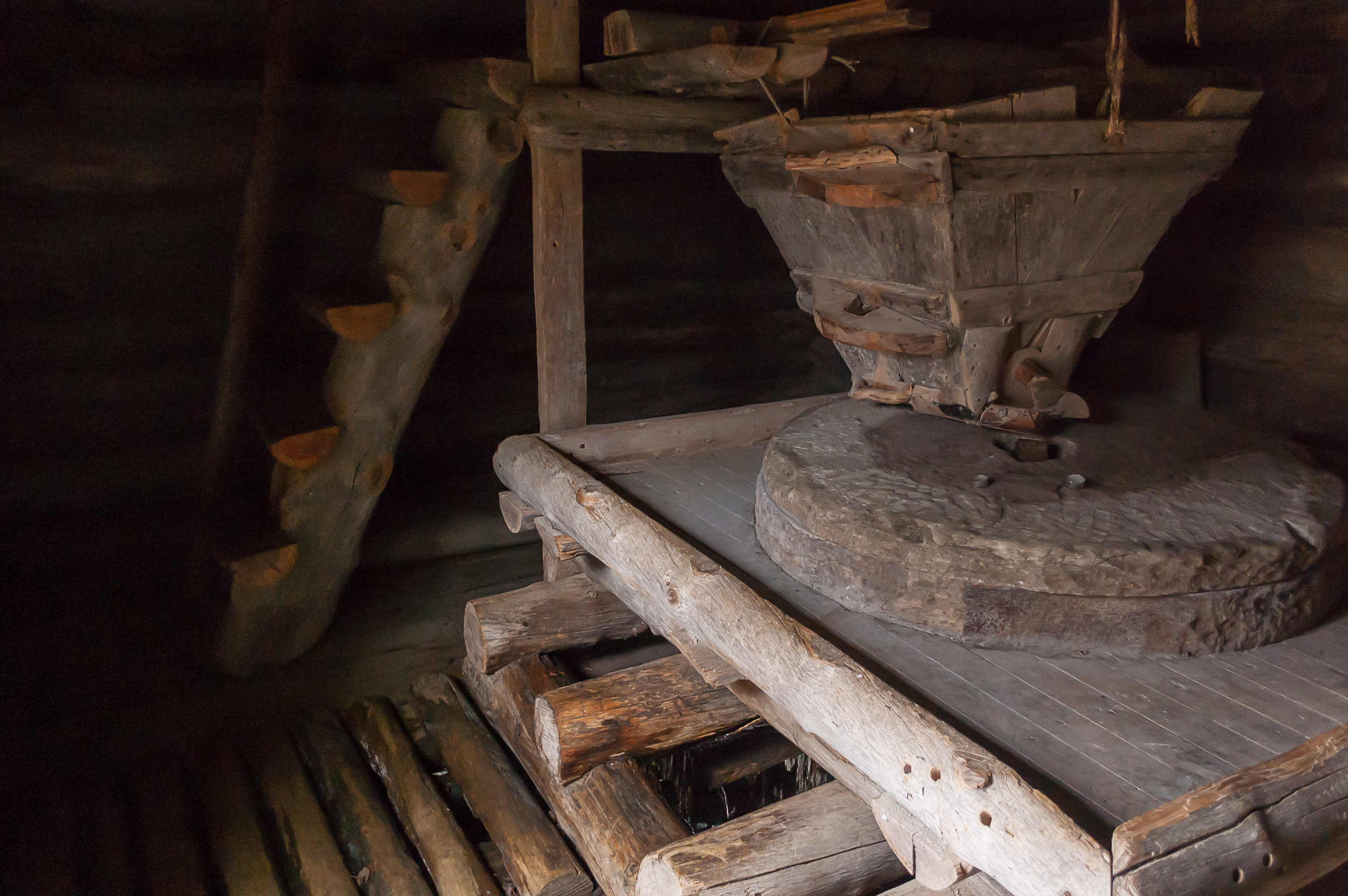 10. Дверь не заперта, и можно заглянуть внутри и осмотреть механизм мельницы. Он заклинен, но в остальном выглядит вполне аутентично. В воронку сыпали зерно, а камень-жернов молол его в муку — это я заключил как всемирно известный специалист по мельничному делу.