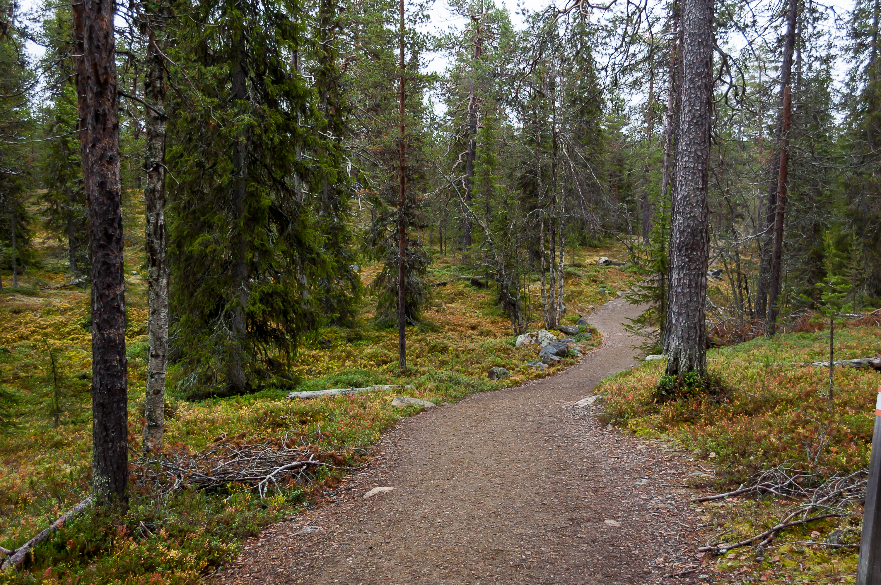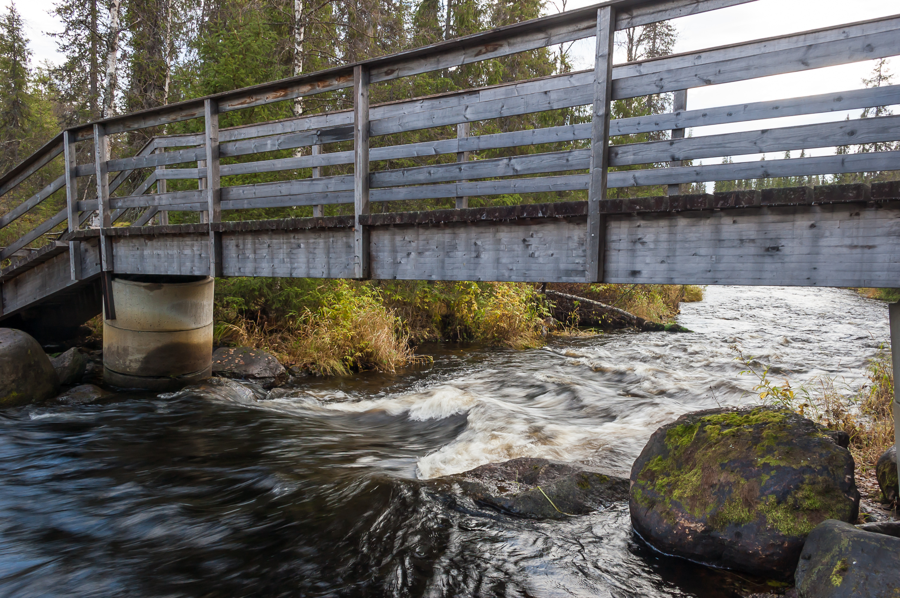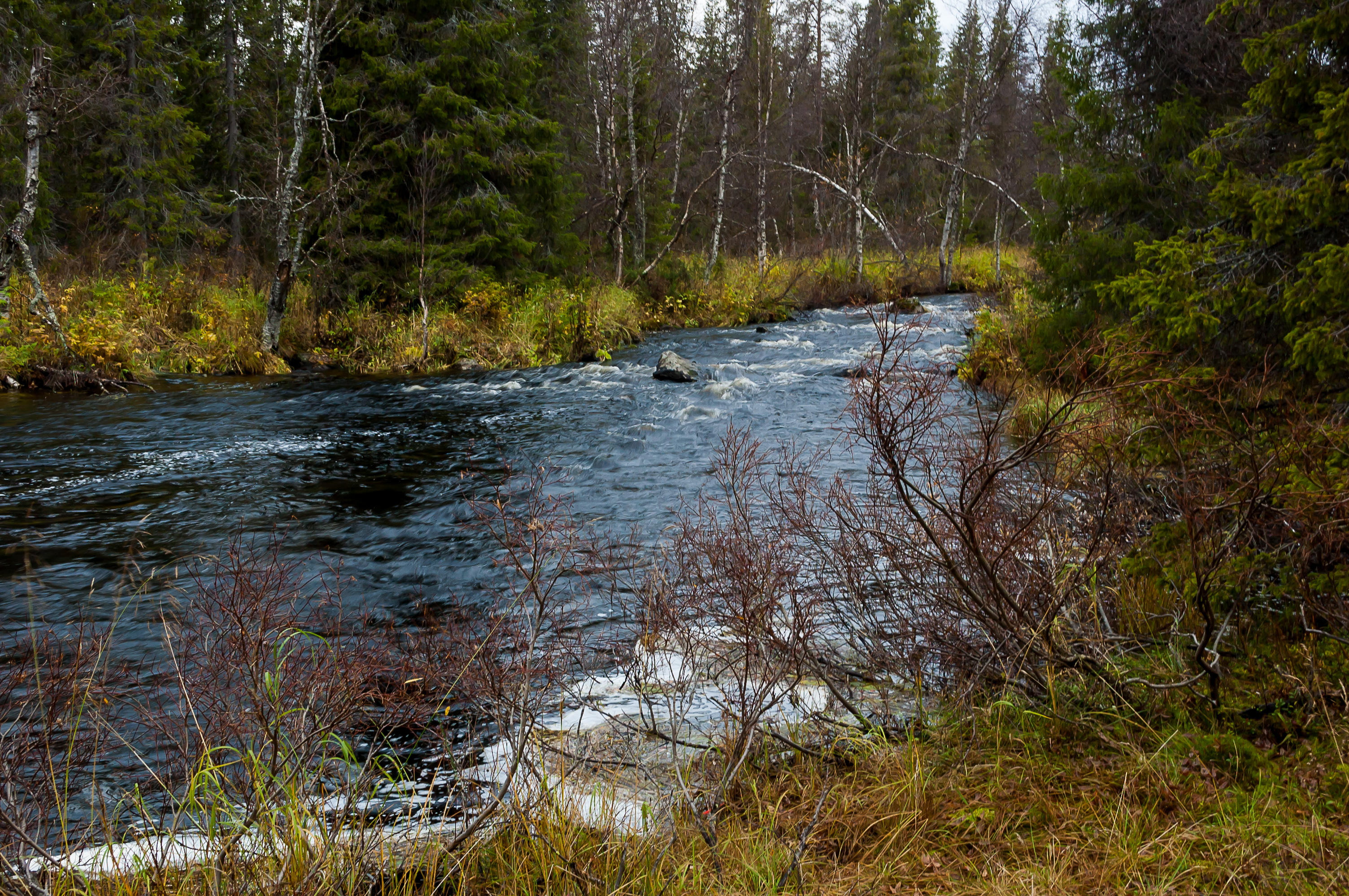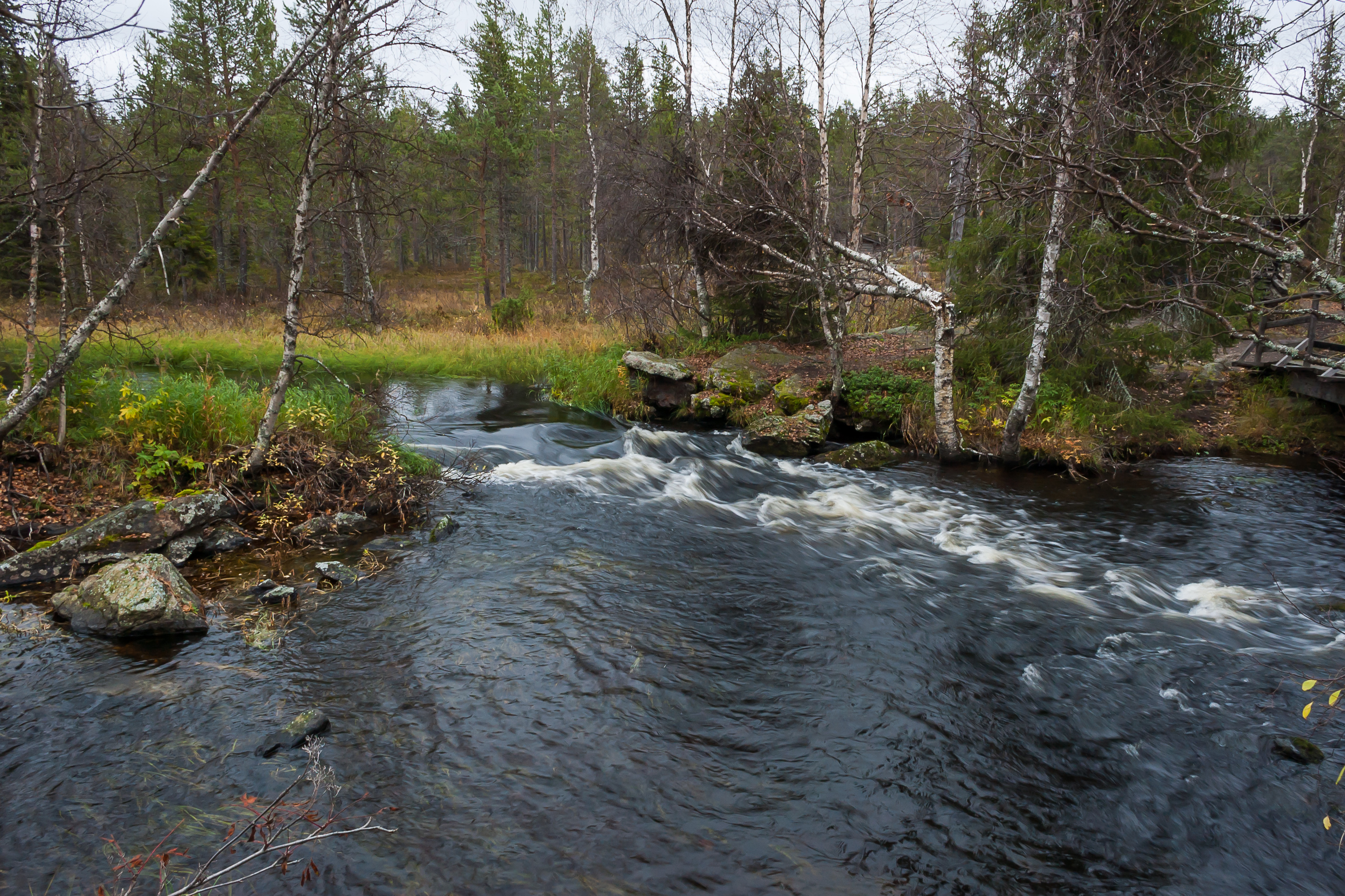 15. Тропинка идет в основном через лес, параллельно реке Экяс. Места выглядели как-то намного более безлюдными и дикими, чем под Экясломполо, и я начал думать о медведях. Я когда машину веду, боюсь лосей, а когда пешком на природе гуляю — медведей. Ну, на самом деле в Финляндии и Скандинавии медведи нападают на людей исчезающе редко. Насколько я понял, за весь двадцатый век в Финляндии зарегистрирована ровно одна смерть от нападения медведя.