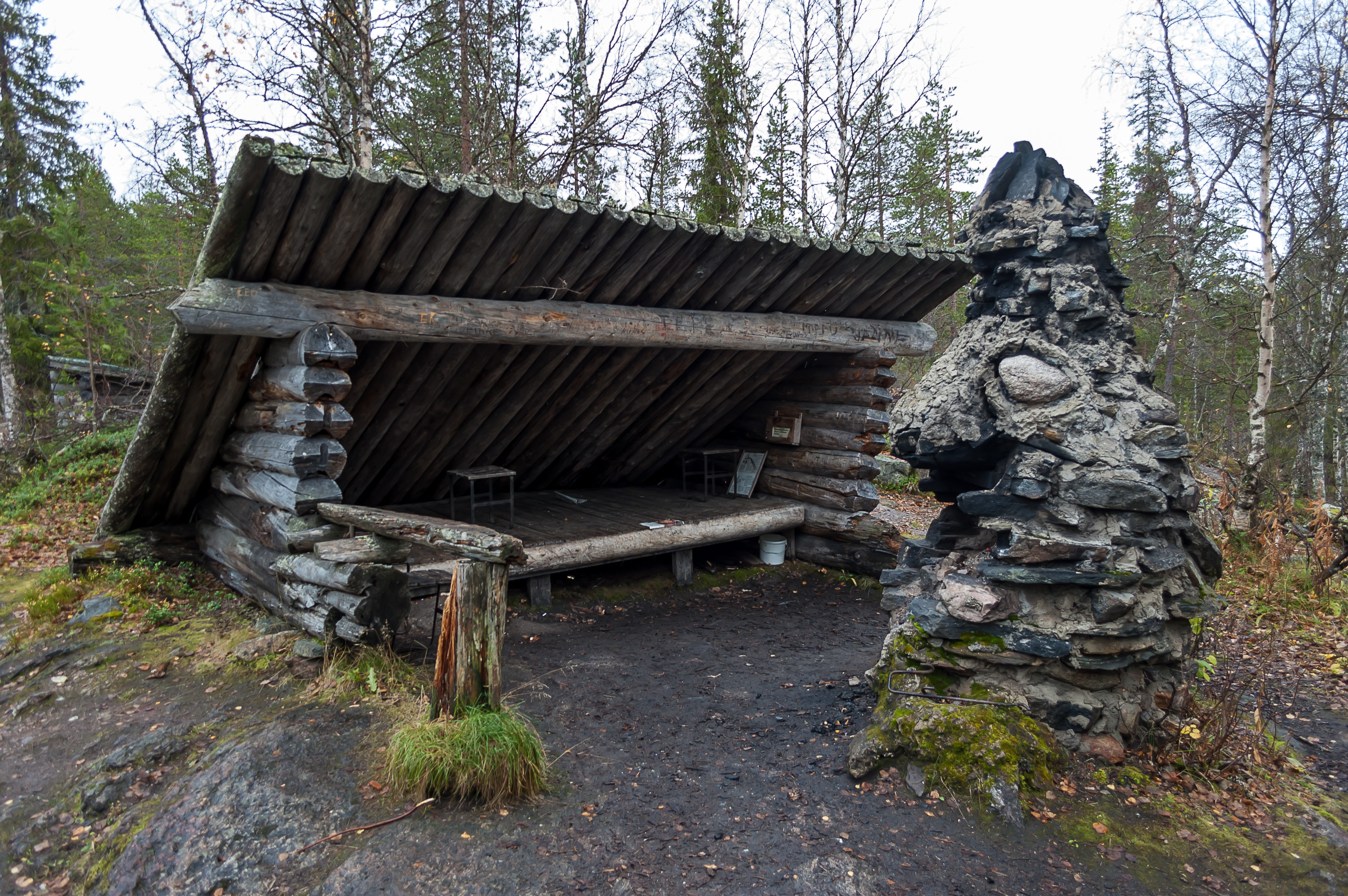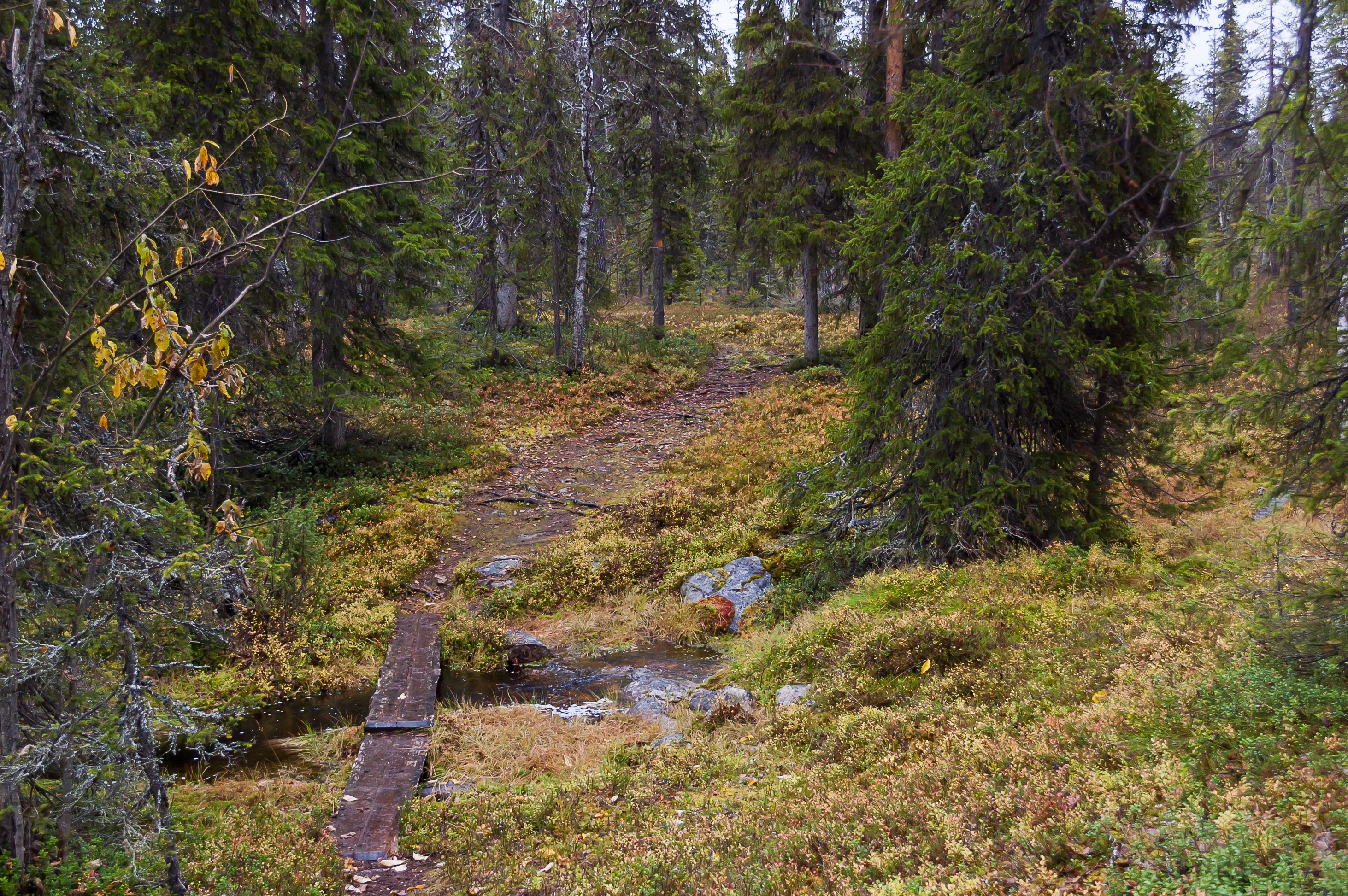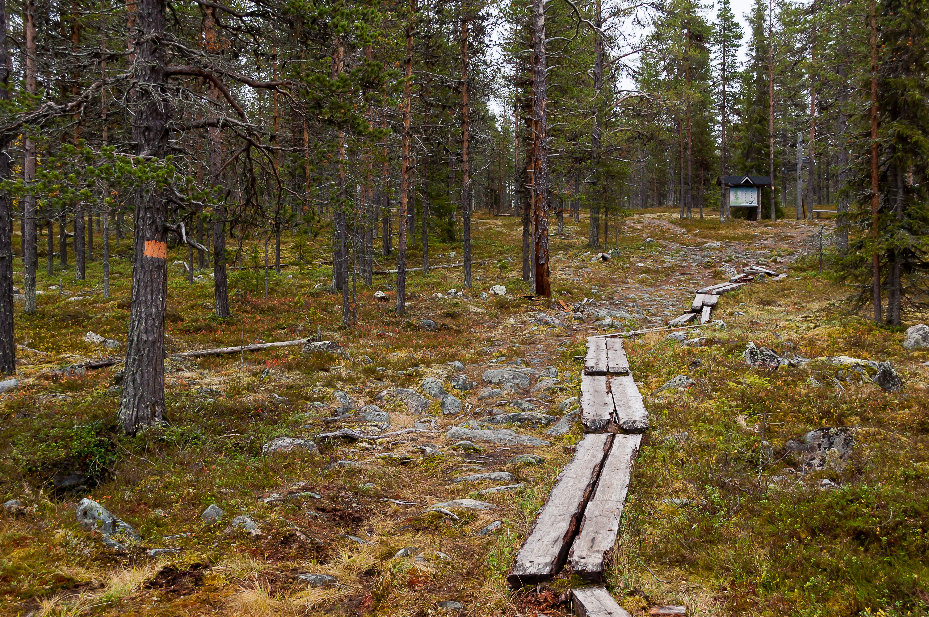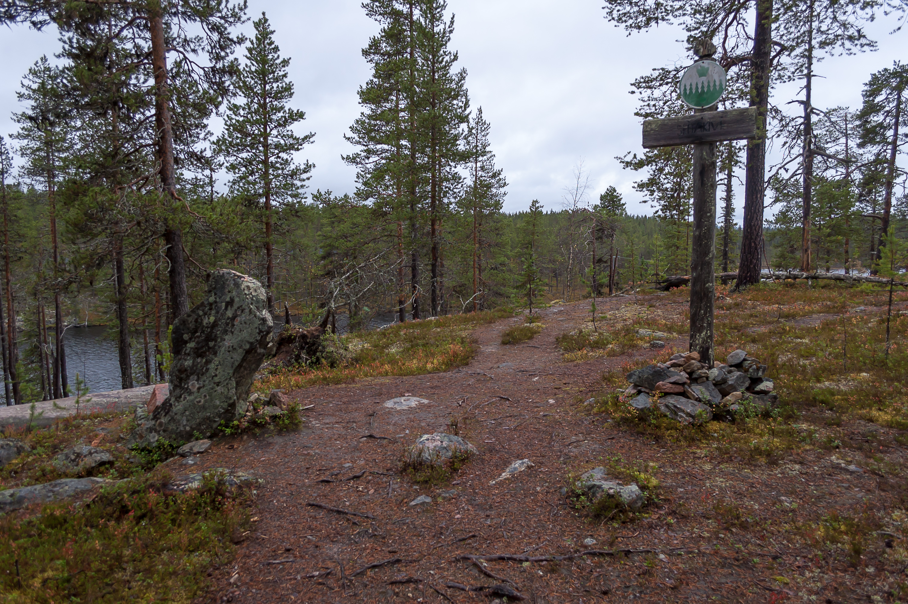 14. На другом берегу стоял навес-лааву, под которым сидели четыре финна и молча пили. Большинство посетителей дальше не заходят, но тропинка идет дальше и разветвляется. Правый путь ведет обратно к Экясломполо, а левый — к камню Сейтакиви (Seitakivi, фин. буквально и будет камень-сейд), а от него к Приюту Экяскеро у одноименного фьельда. От мельницы до Сейтакиви примерно 3 км. Я отправился дальше.