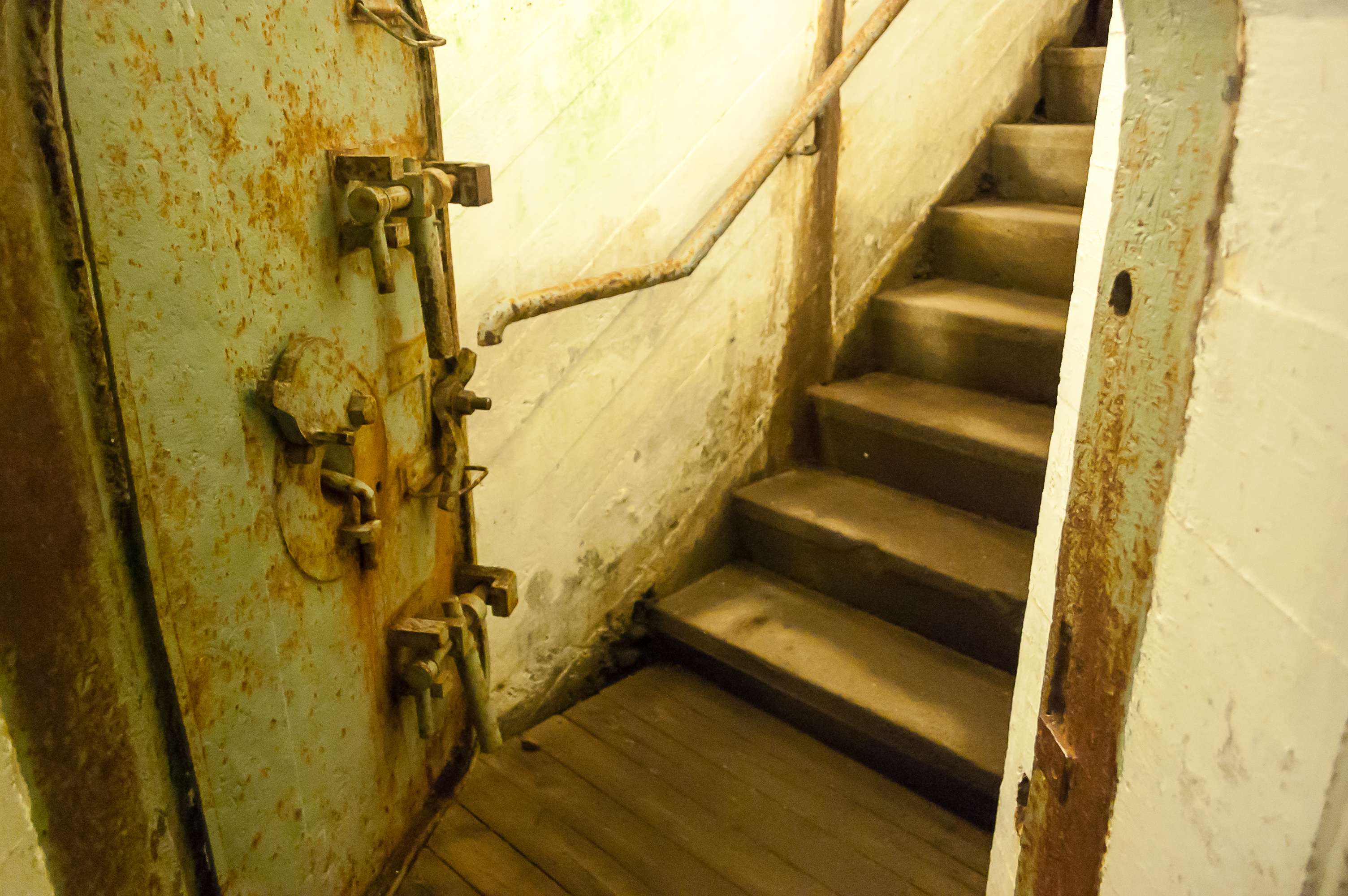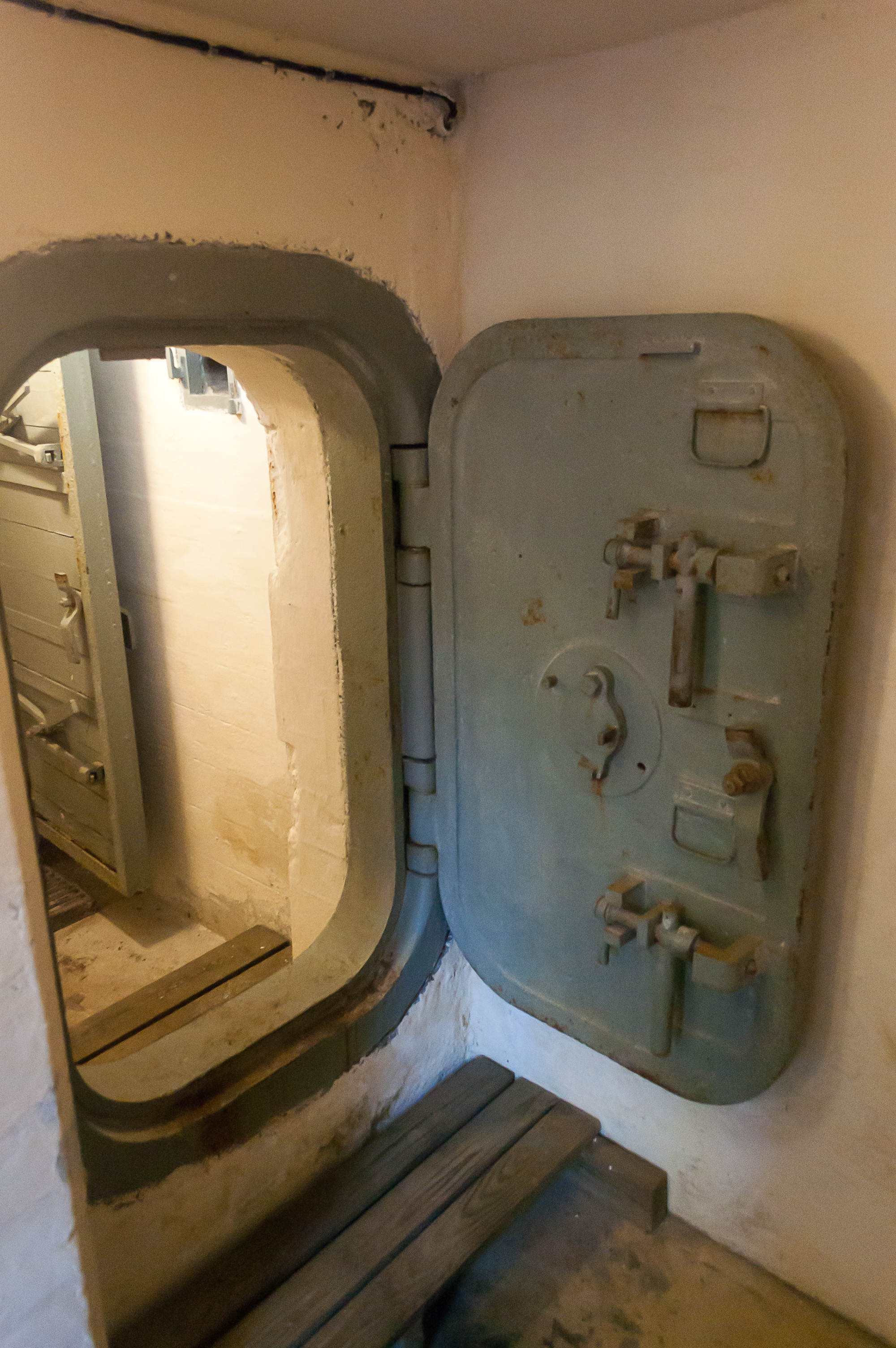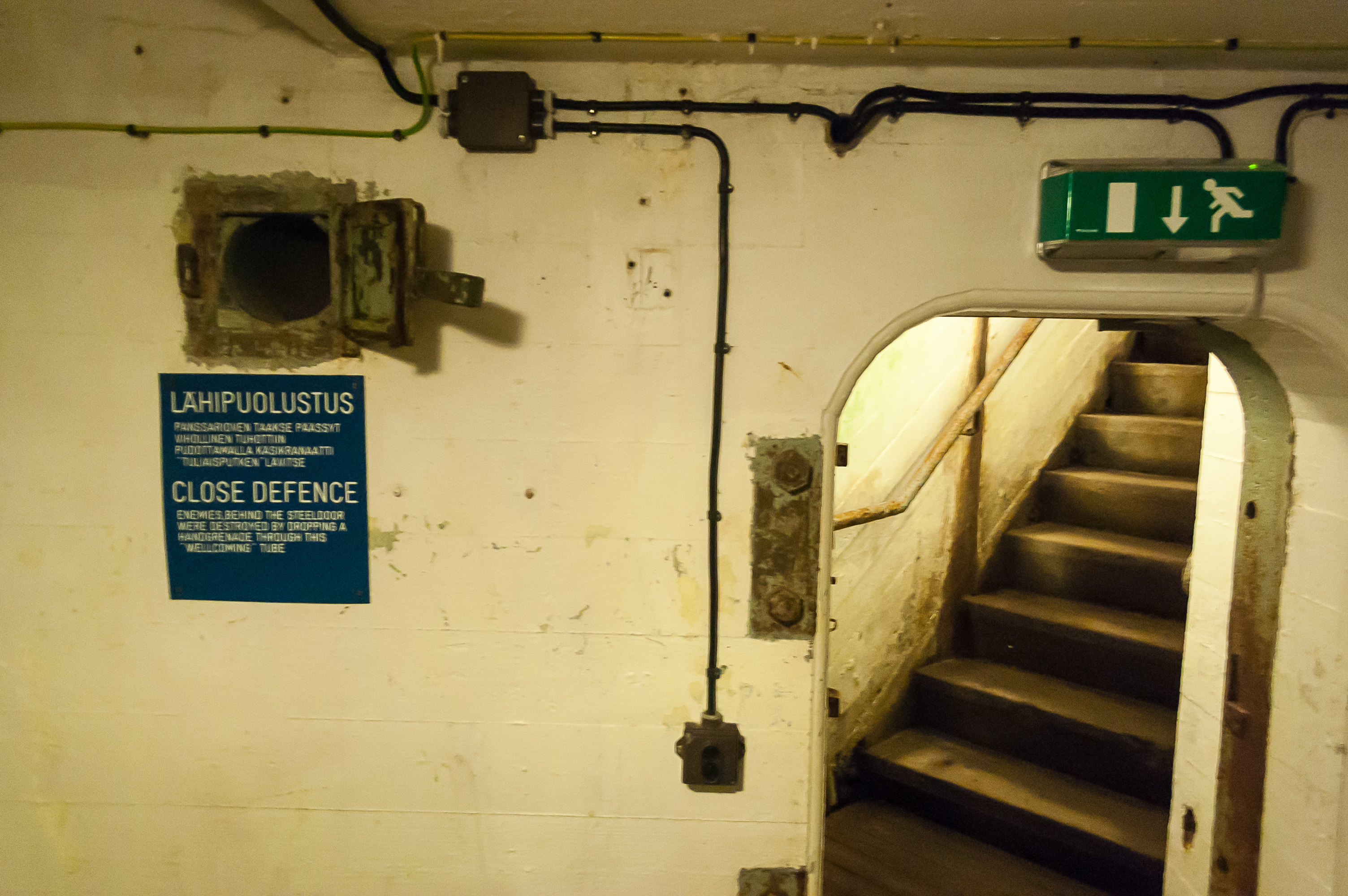 23. У двери устроено гениальное в своей простоте устройство для обороны защитников бункера. Допустим, вас в этом бункере окружили, и солдаты врага уже спускаются к вам по лестнице. Что вы делаете? Запираете дверь, ждете, пока они не будут совсем близко, и кладете гранату вот в эту вот дырку слева от двери. Граната по узкой трубе выкатывается им под ноги, и бабах! Осталось только отскрести ошметки от стенок. Мне очень впечатлило это изобретение. Я бы в жизни до такого не додумался.