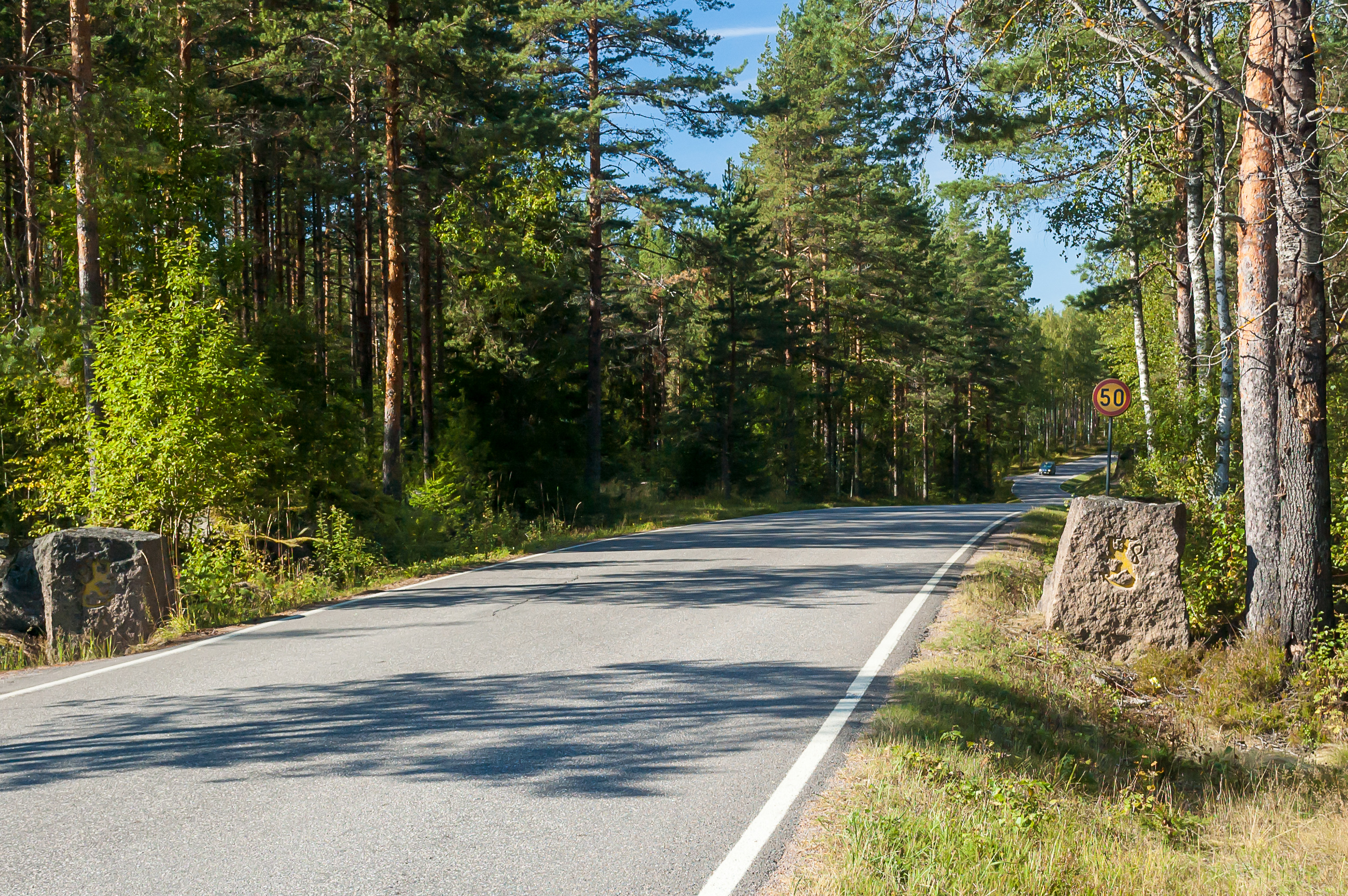 43. В месте, где ряды надолбов пересекают дорогу 384, установлены два больших камня с вырезанным на них желтым финским «упоротым львом».