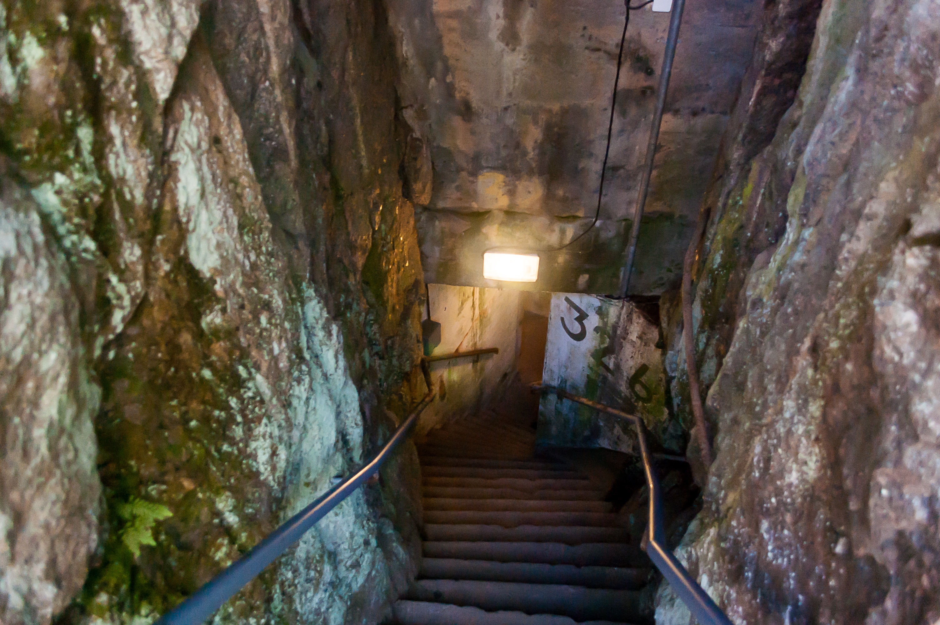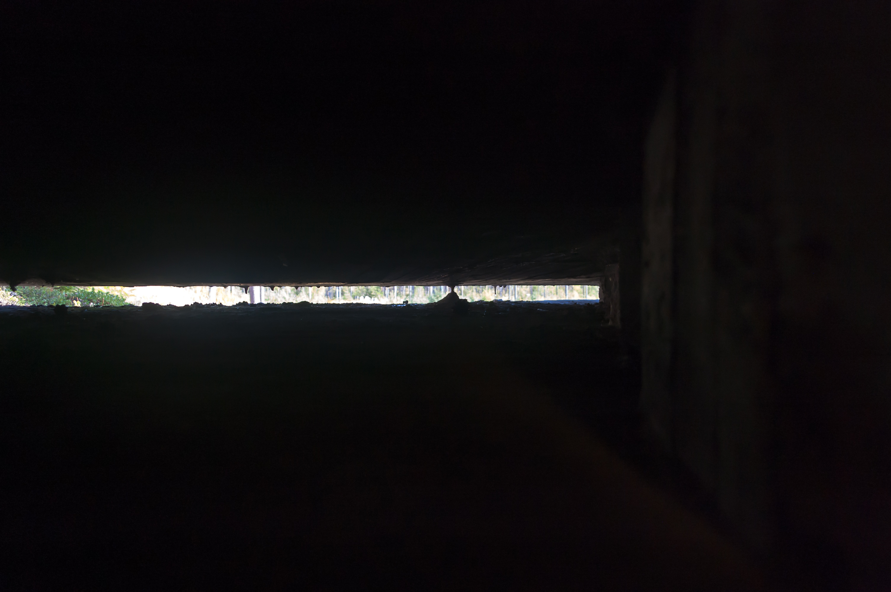 38. Один из заброшенных бункеров (точнее, бункеров, которые не восстанавливали специально). На территории музея два таких — один просто пустой и темный, а другой подтопленный. Таблички предупреждают, что во второй бункер заходить очень опасно — можно подскользнуться в воде и, если не повезет, упасть в невидимое под водой отверстие колодца.