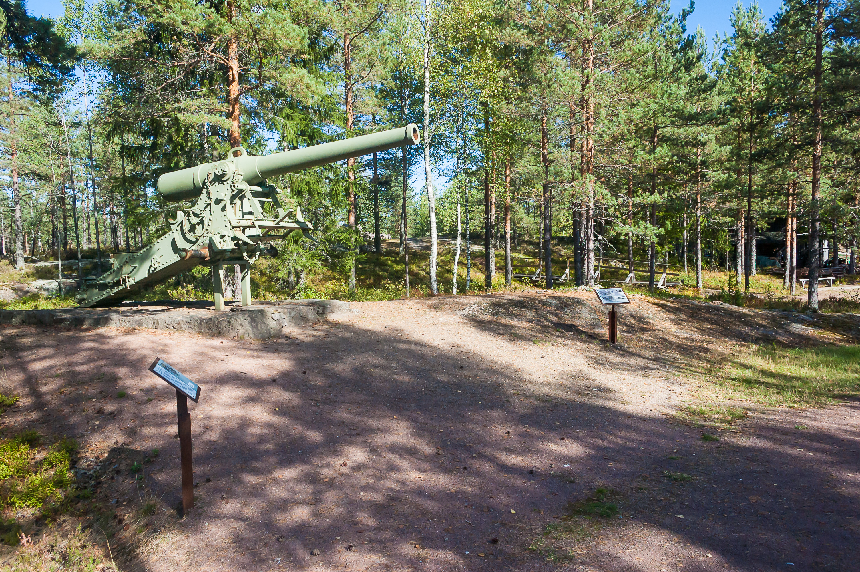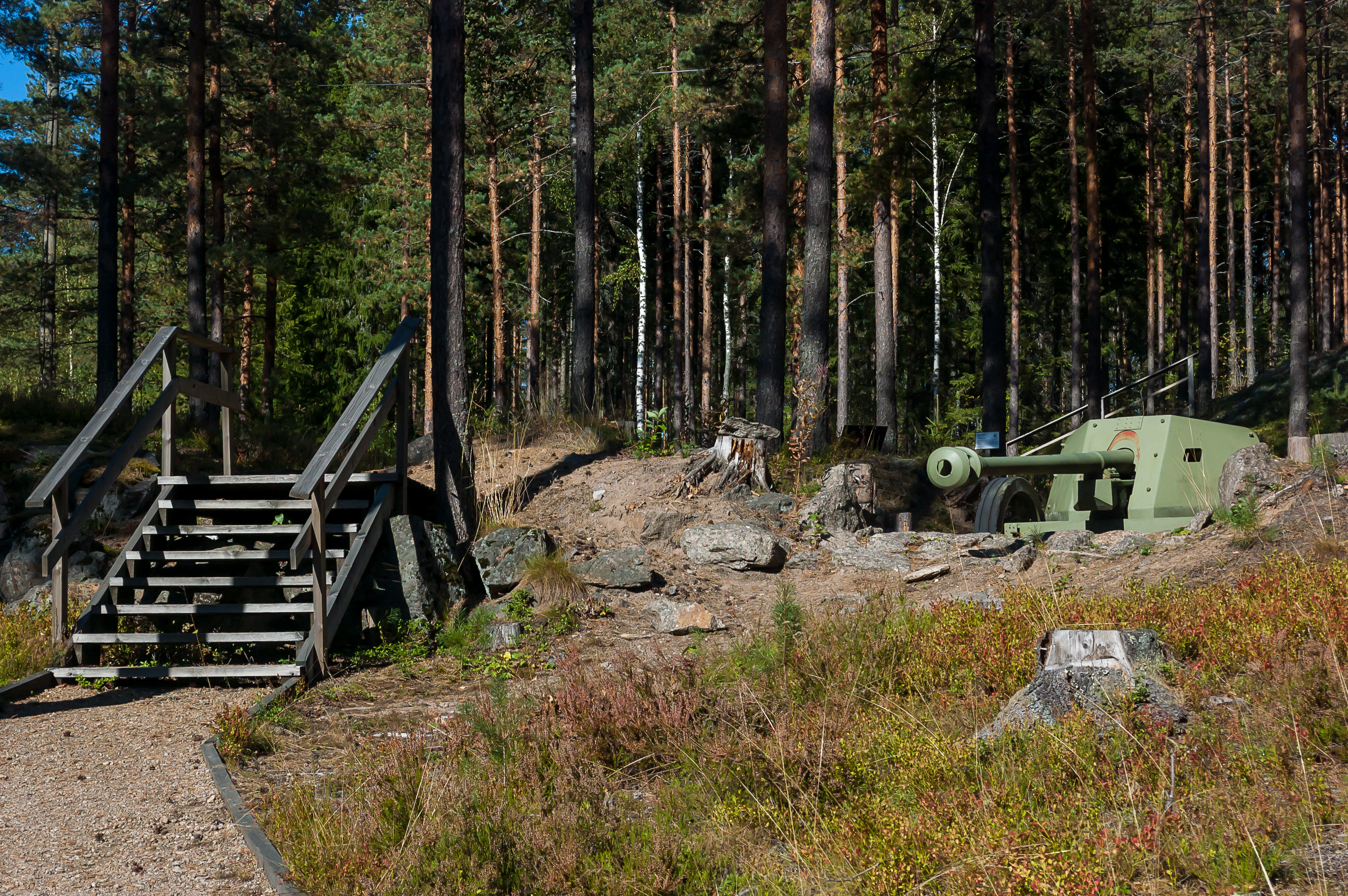 2. Должен начать с оговорки, что в плане военной истории я ну не так чтобы совсем ничего не знаю, но все же дилетант. Даже не играю в World of Tanks и не участвую в интернет-срачах про войну. Наверняка есть люди, которые про изображенное на каждом последующем кадре могут написать по десять страниц, но мне пришлось ограничиться тем, что было в буклете и на табличках (большинство из которых традиционно на финском), и тем, что я нагуглил впоследствии. Ну, например, это пушка. Так мне подсказывает моя острая интуиция. Насколько я помню, это одно из старых орудий эры Российской Империи; конкретно про нее у меня не сохранилось записей. По-моему, у нее должны еще быть большие деревянные колеса, но они, видимо, на какой-то реставрации.