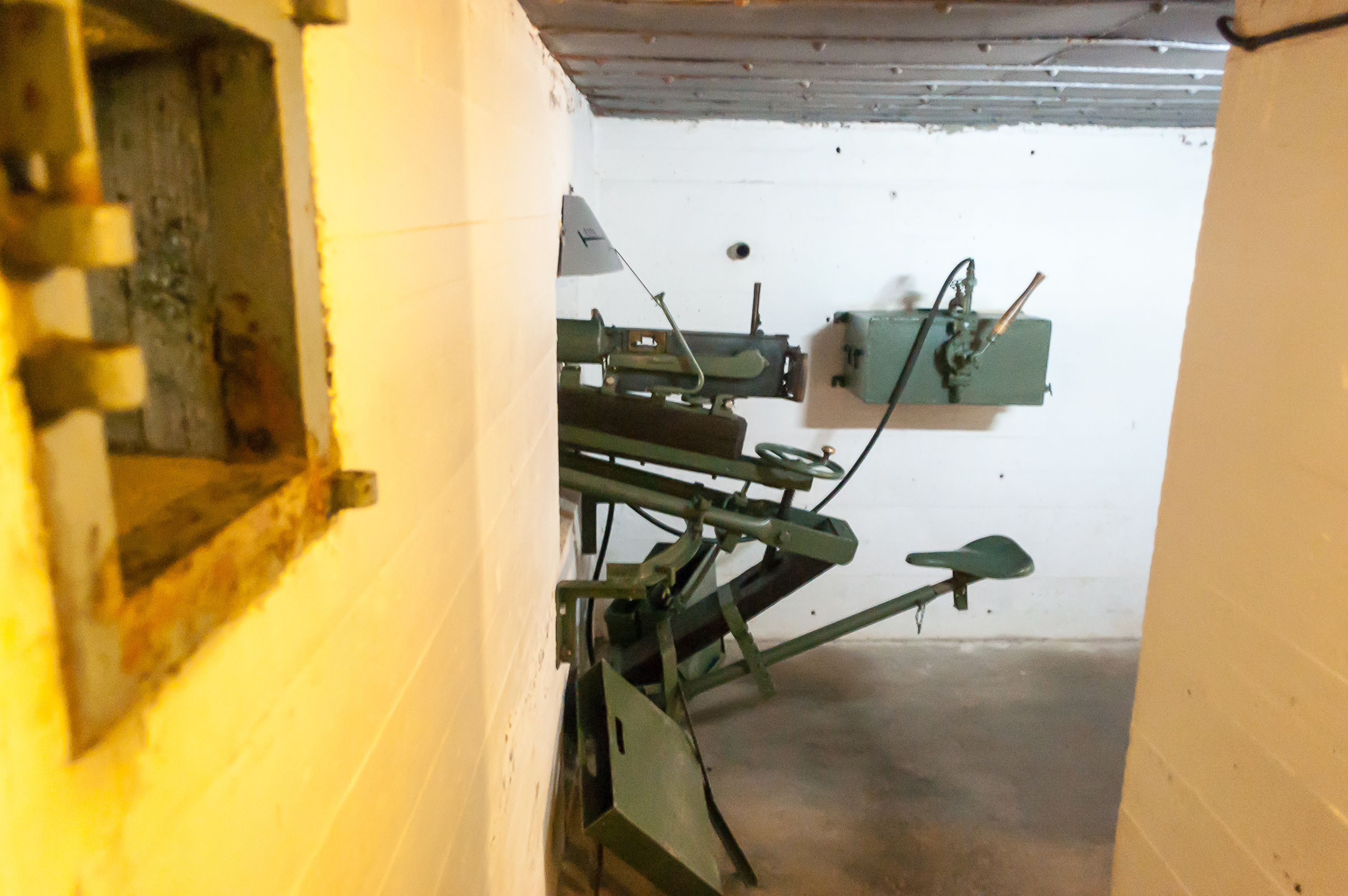 24. В бункере (правильно, наверное, тогда будет звать его дотом?) установлено 45-миллиметровое противотанковое орудие. Казалось бы, мы куда-то под землю спустились, но на самом деле весь дот вырублен в скале над поверхностью земли, а орудие торчит из этой скалы сбоку. Обозначение M 40 немного нестандартное; мне пришлось хорошенько погуглить, чтобы определить, что так обозначались трофейные советские орудия образца 1932 года. Можно посмотреть наружу в окуляр и даже поприцеливаться.