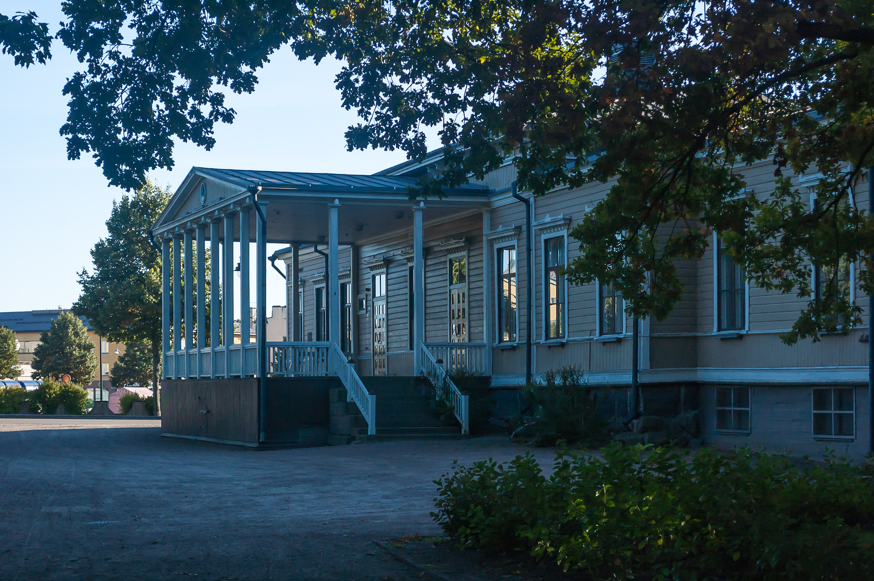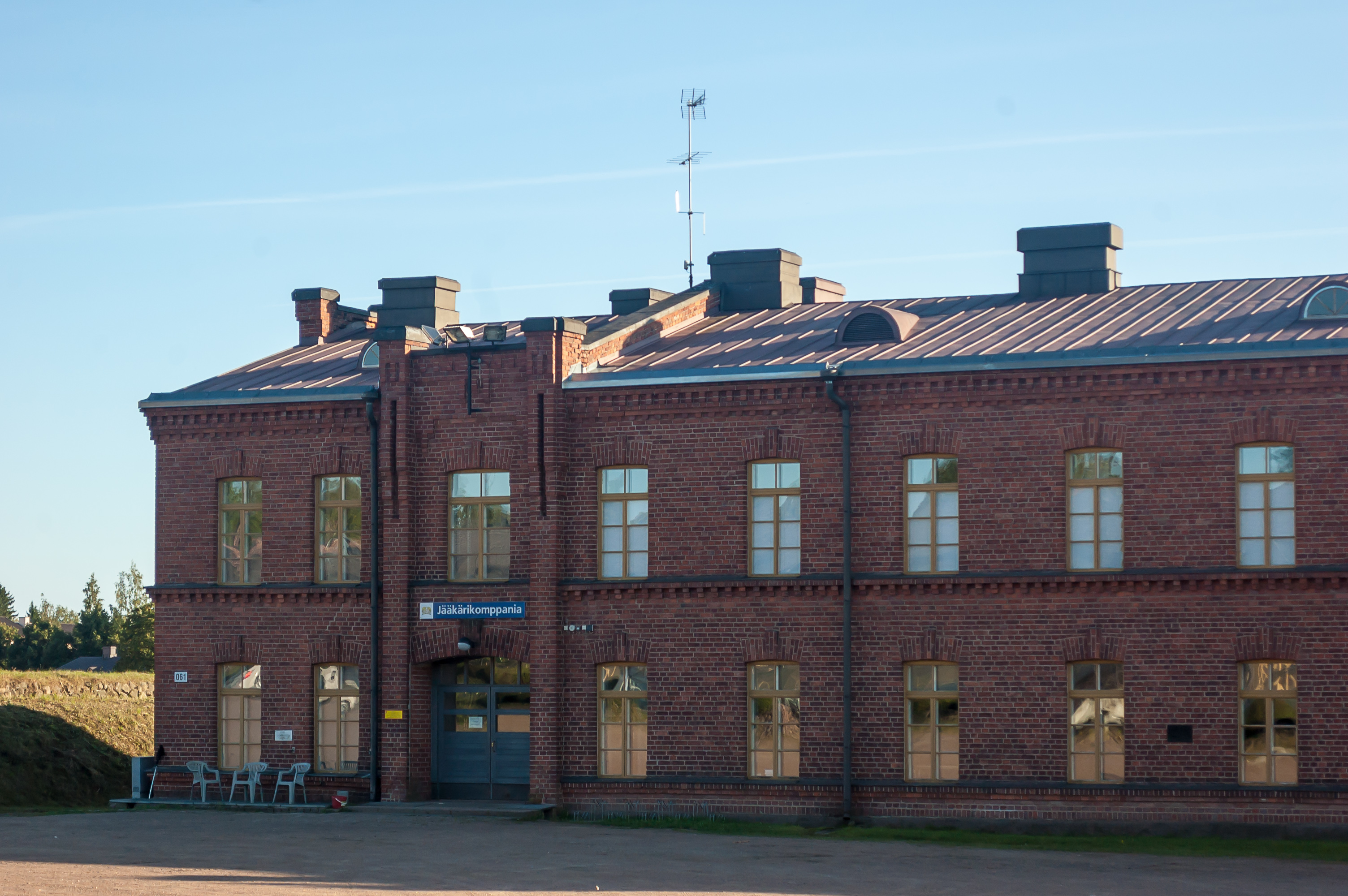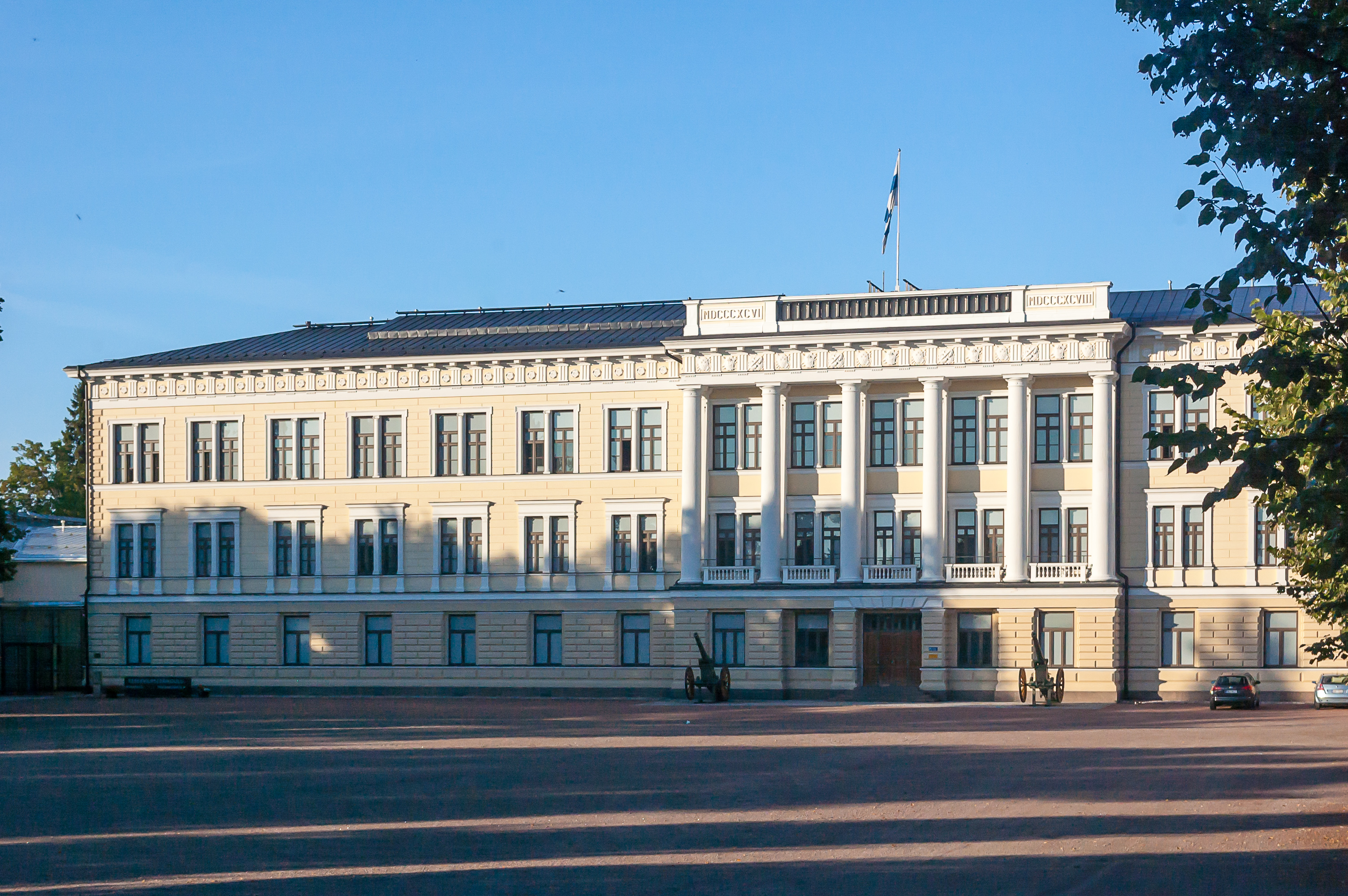45. И еще одно — во много раз больше — выглядит так, будто его прямо взяли и телепортировали сюда из центра Питера. Это и есть главное здание Школы офицеров запаса. Здание было построено в 1898 году для ее предшественницы — Кадетской школы Хамины, существовавшей с 1820 года. В числе прочих в ней учился Маннергейм, но в 1886 году его отчислили за нарушения дисциплины. Поэтому он и отправился дальше учиться и служить в Россию, и в итоге до самой победы революции был русским белым офицером. Школу расформировали в 1901 году, спустя всего несколько лет после строительства этого корпуса, в ходе политики русификации Финляндии; Россия решила, что Финляндия более не нуждается в собственной армии.
