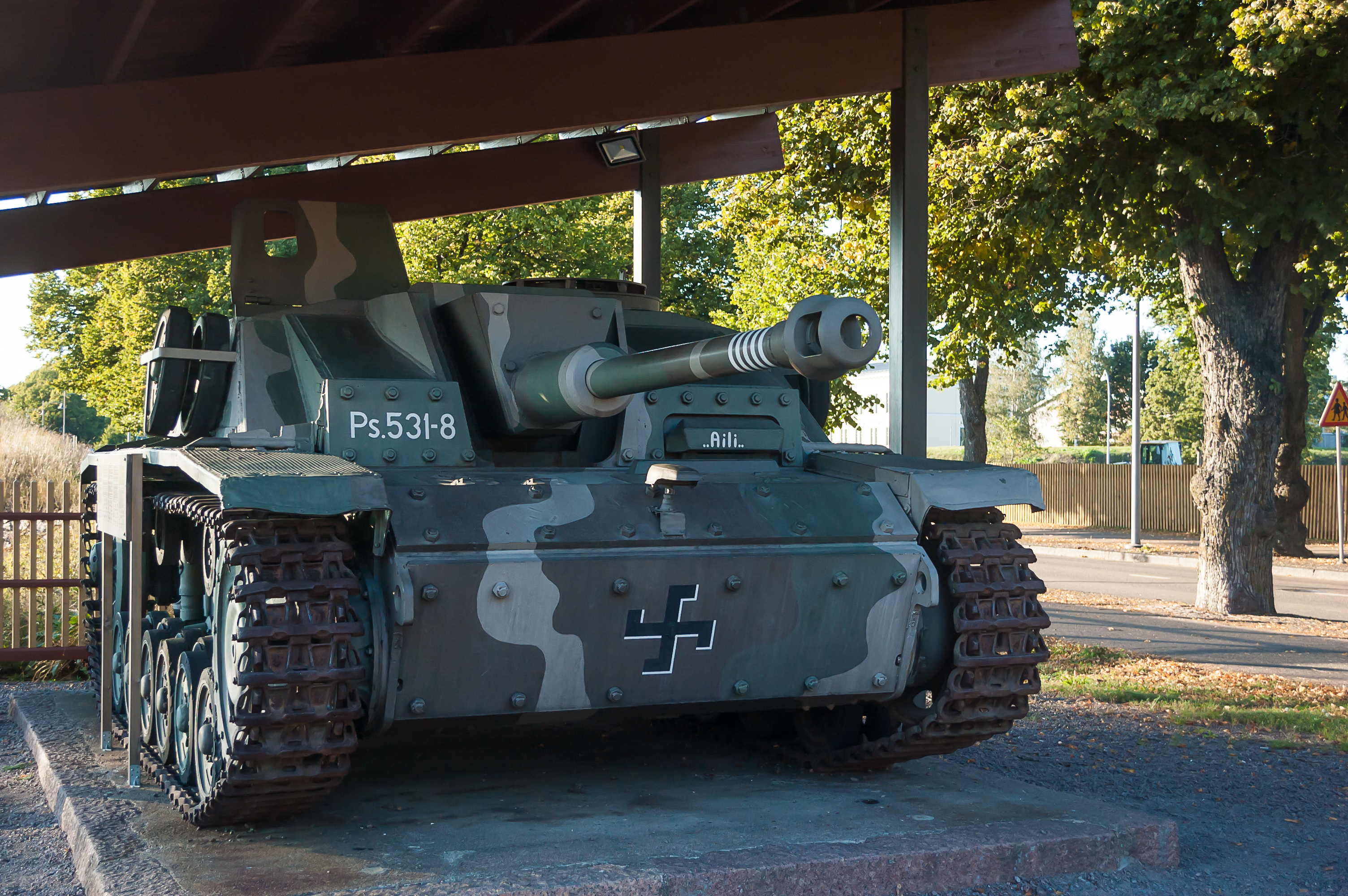 Обратите внимание на свастику. Информационный щит слева, вместо того, чтобы нормально рассказать о самой самоходке, долго и мучительно объясняет, что немецкая нацистская свастика — это фу и бяка, а вот финская свастика — абсолютно, безусловно, инфа 100%, никак с нацистской не связана и просто такой символ старинный. В общем-то это правда. Свастика (hakaristi) использовалась: